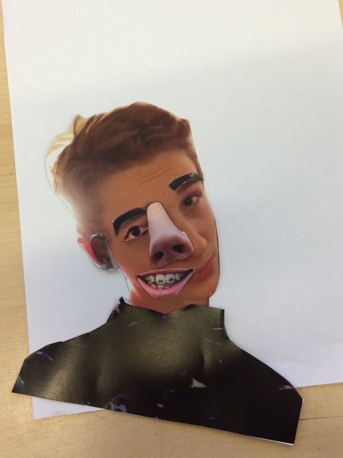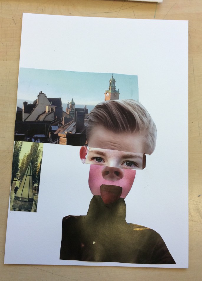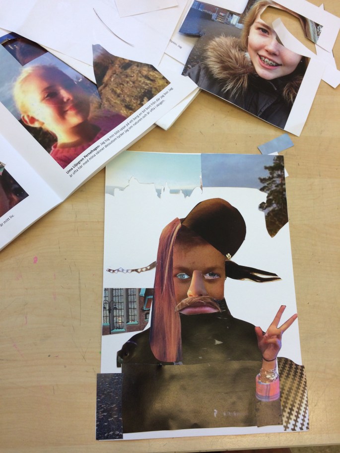 Vi fick några böcker över efter temat ”Mitt Stockholm” med de tryckta böckerna. Dom klipper vi nu i och skapar funny faces. Det blir alltså en blandning av flera olika klasskamraters ögon, hår osv.