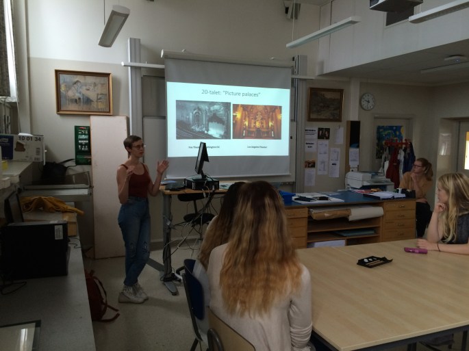 Filmvetar-Malin föreläser om biofilmens historia och om hur filmbolagen jobbar.