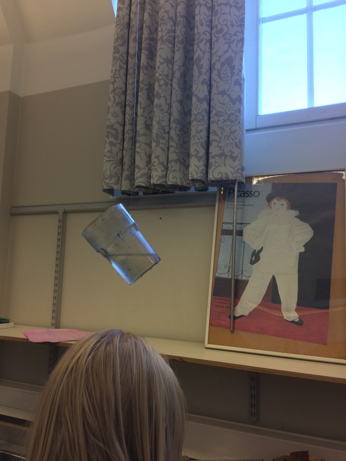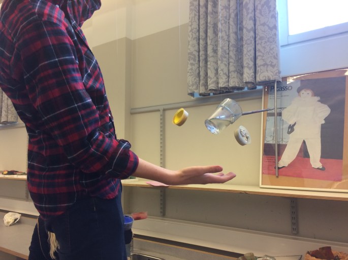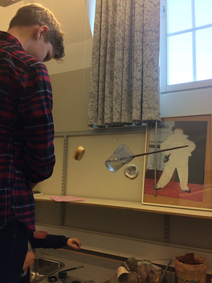 Bilderna visar färgpuckar, vattenglas och pensel som ska ha tappats och kastats iväg när eleven blir fälld i videon. Fiskelina och mycket tålamod =]