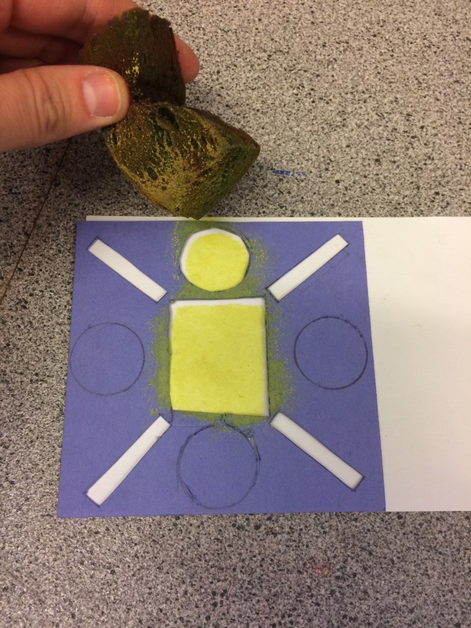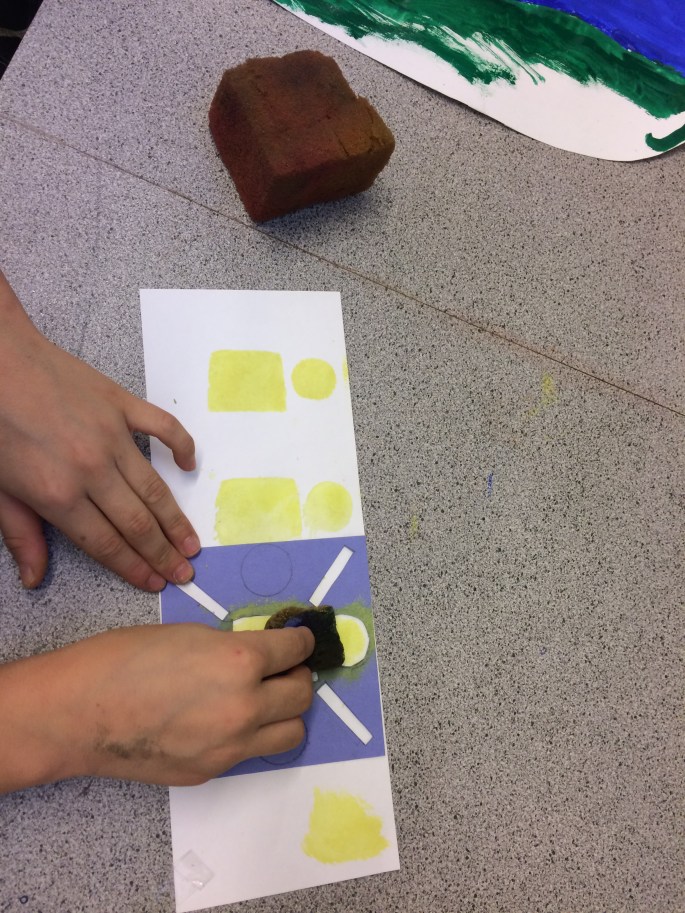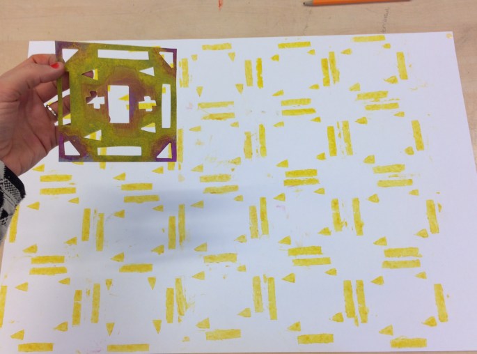 Efter att ha tränat på att rapportera mönster på ett skisspapper (indelat i fyra rutor) och sen tecknat upp på ett kartong, skurit ut formerna, så var det dags för schablontryck! Eleverna väljer ett komplementfärgspar. Här ser vi de gula delarna! Den lilablå färgen läggs på när det gula torkat.