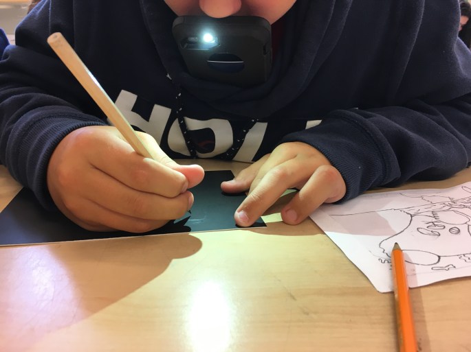 Den här eleven har skissat på en svan. Han lägger skissen på skrapkartongen och drar linjerna med blyerts igen. Då blir det spår i skrapkartongen och lättare att teckna upp innan det är dags att skrapa.