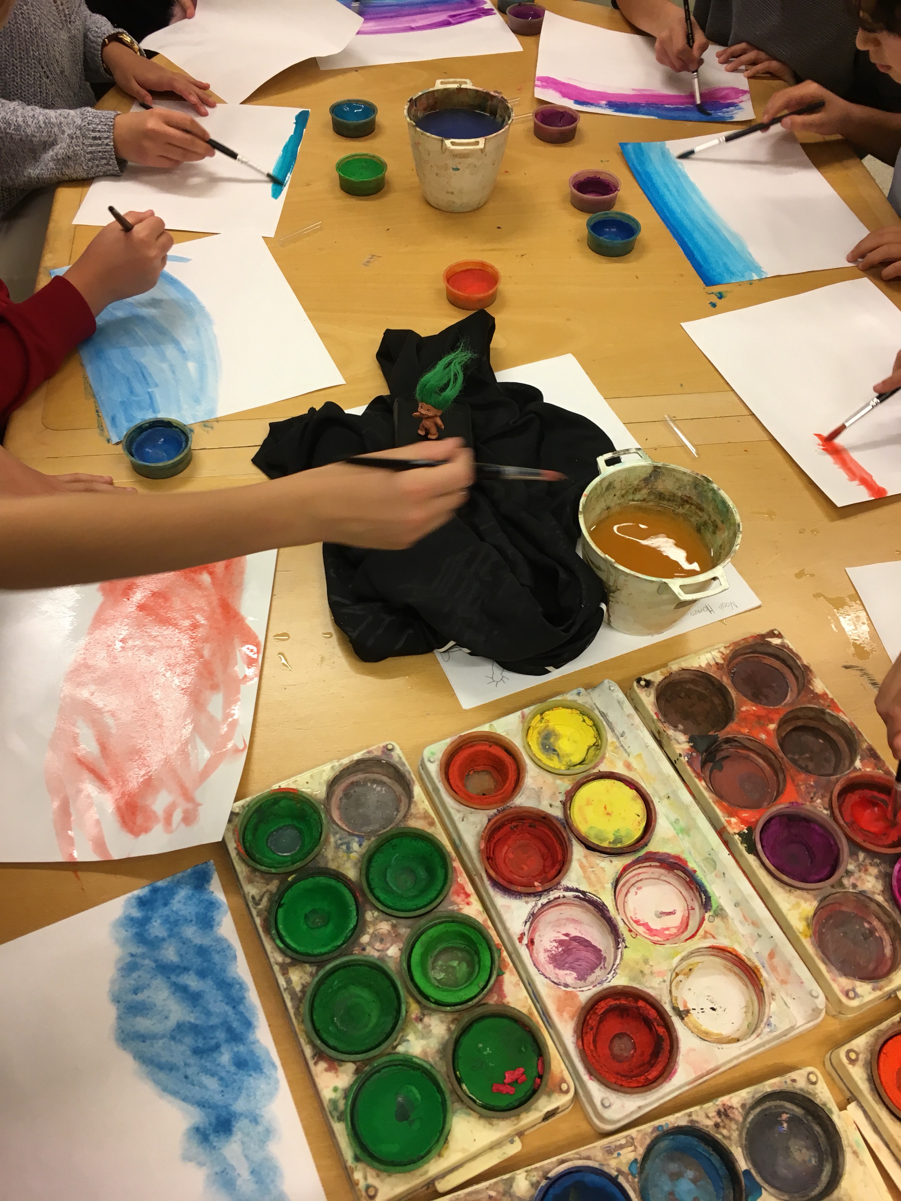 Idag började vi med en ny uppgift. Vi kollade först på Britain’s got talent där en ungersk dansgrupp skapar vackra siluetter mot en bakgrund som varierar från varmt till kallt (de vann faktiskt hela tävlingen). Sen målade vi arken med vatten, sen vått-i-vått dvs att färgerna flyter ut och blandas med varandra. De fick välja varm eller kall bakgrund.