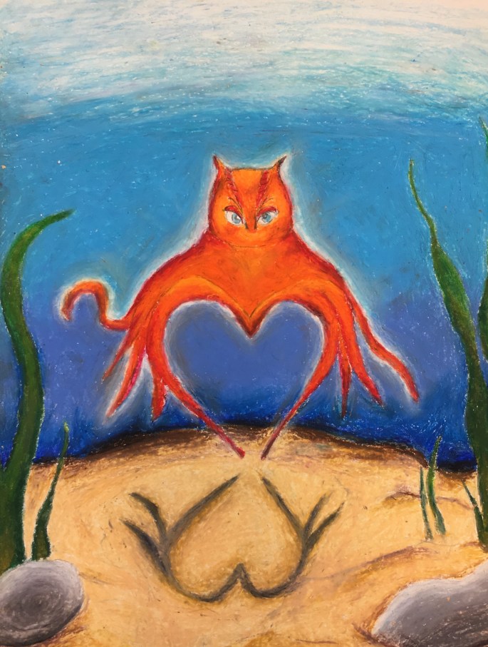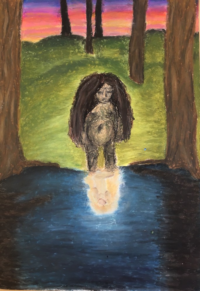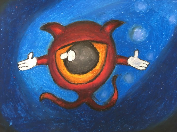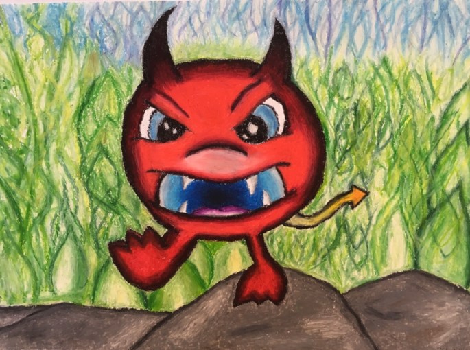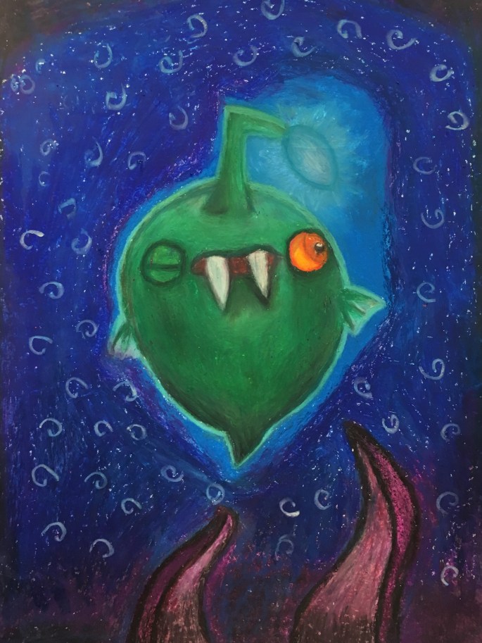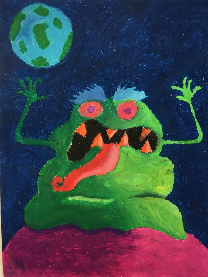 Åk 7 har gjort monster i oljepastell i A3-format. Monstret ska befinna sig i sin hemmiljö och bära på egenskap/utseende som eleven själv har.