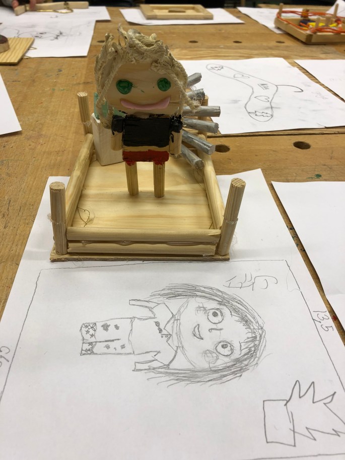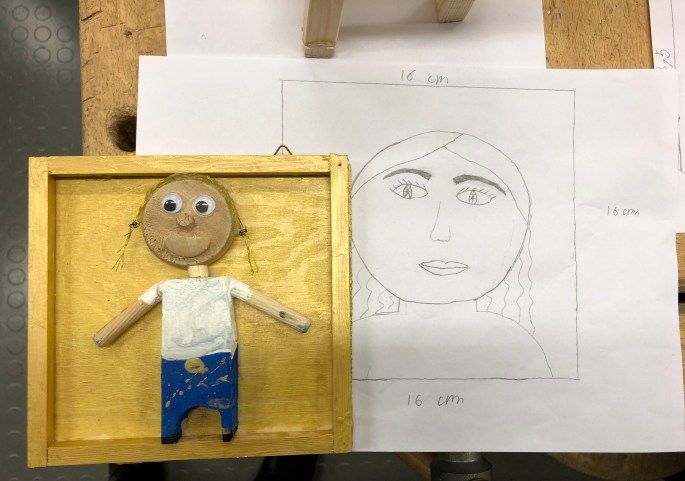 Ena halvan är på träslöjden en termin medan vi andra är i bildsalen. Trä-gruppen håller nu på med att designa galgar och har tidigare gjort självporträtt med blandat material.