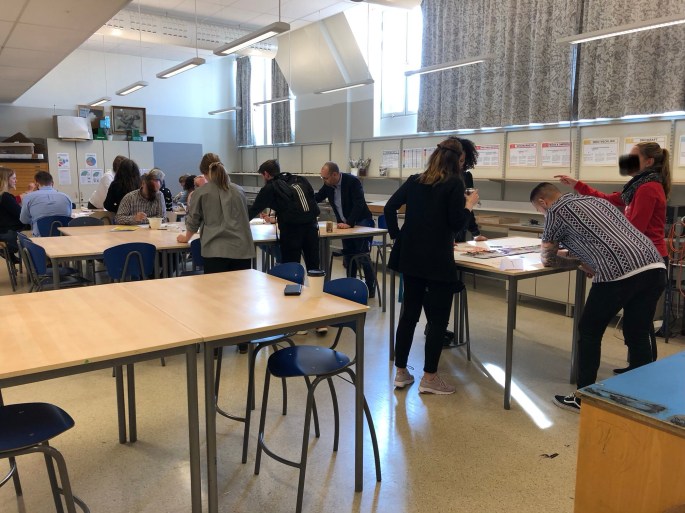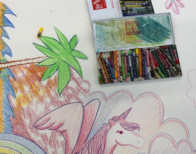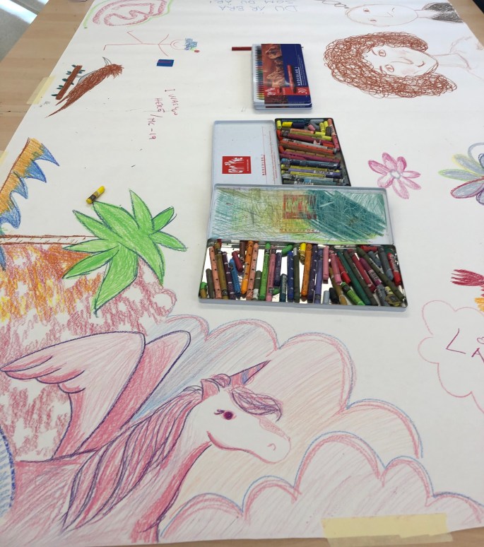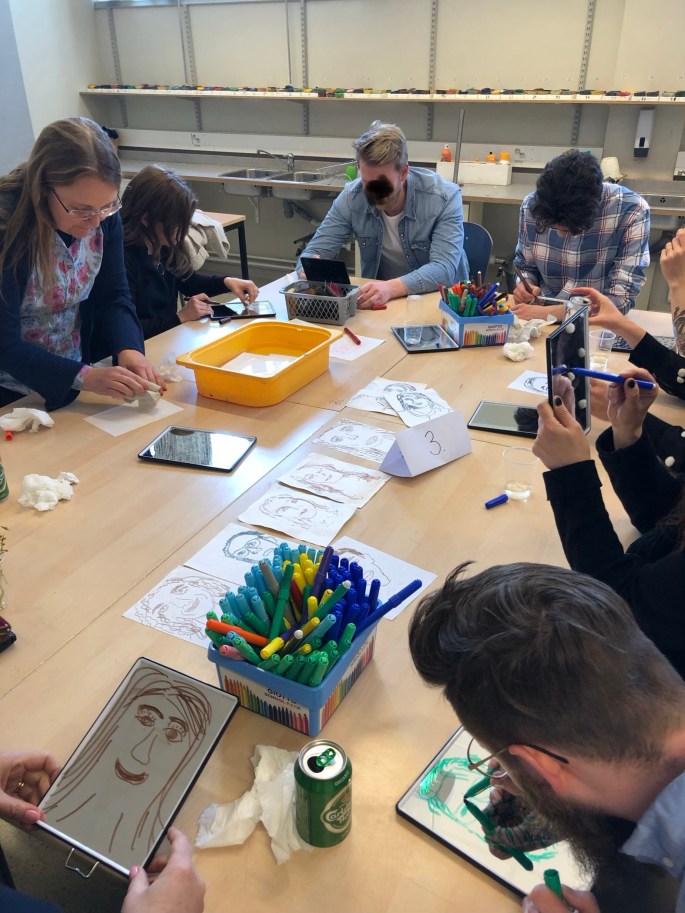 Plötsligt händer det. Bildsalen fylls av vuxna människor med mer eller mindre vana att skapa. En trevlig eftermiddag med olika stationer. Akvarellmålning, spegelmonotopi och en gemensam klotterduk.