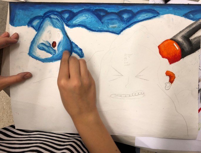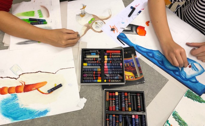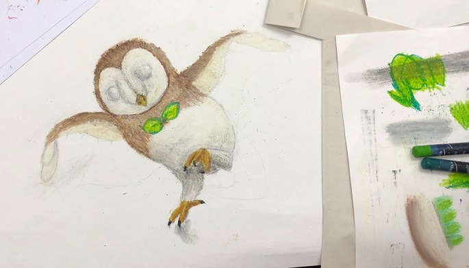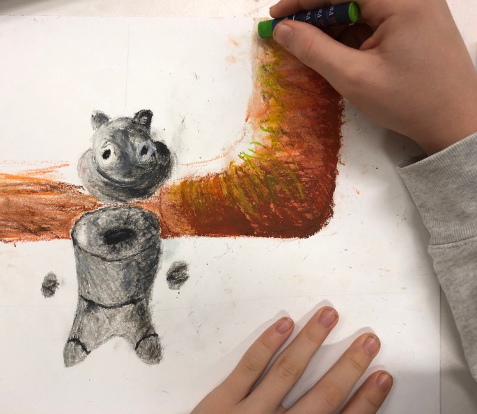 Nu är sjuorna igång med pokemons och oljepastell. Att jobba med oljepastell är inte lätt så det krävs övning vid sidan om originalet.