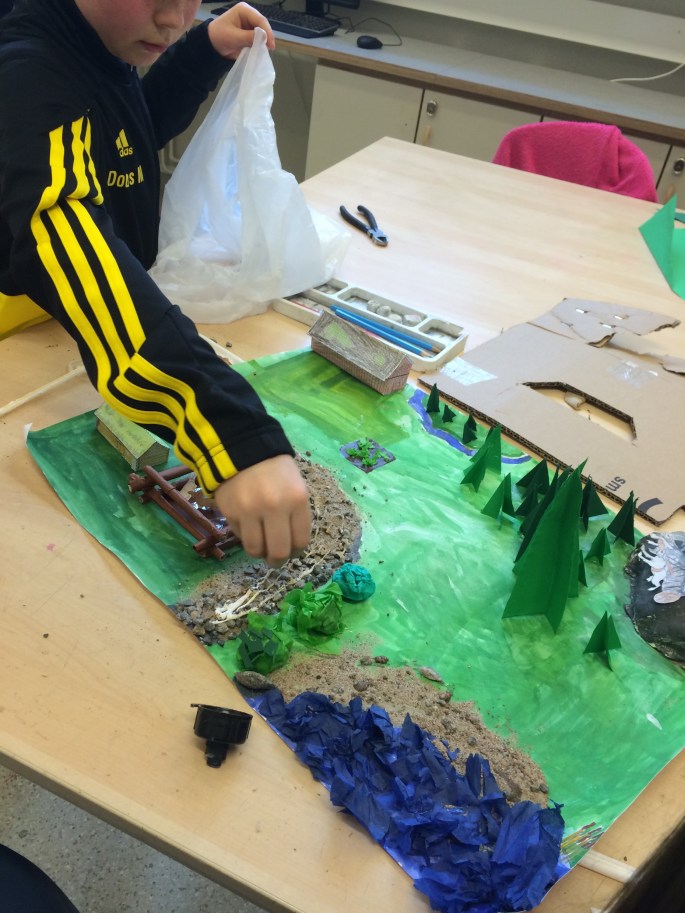I samarbete med SO år 4 så får de nu göra vikingabyar utifrån deras inhämtade kunskaper från SO-undervisningen. Vi använder oss även av ungafakta.se. Under pyssel och sen vikingar så kan de skriva ut och bygga bla vikingabåtar. Nu har grupperna skissat och enats om hur landskapet ska se ut.