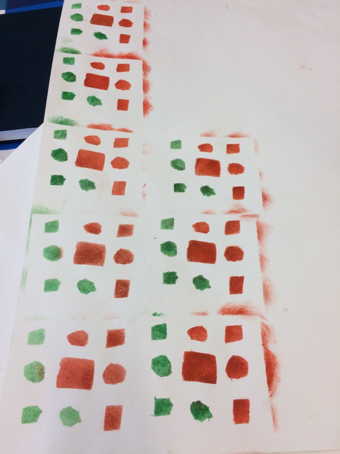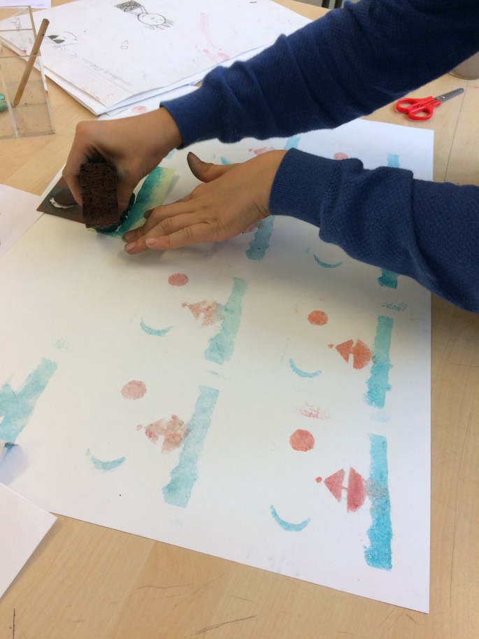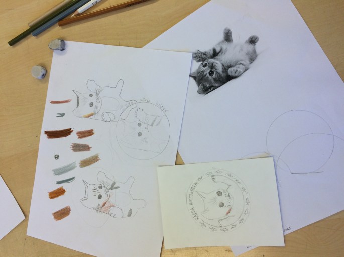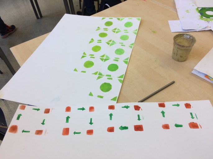På framsidan av mappen har fyrorna limmat fast deras mönsterrapport. De fick upprepa ett mönster, dvs konturen av ett föremål, och sen färglägga. De avslutade sen med att fylla i konturerna med svart tuschpenna.