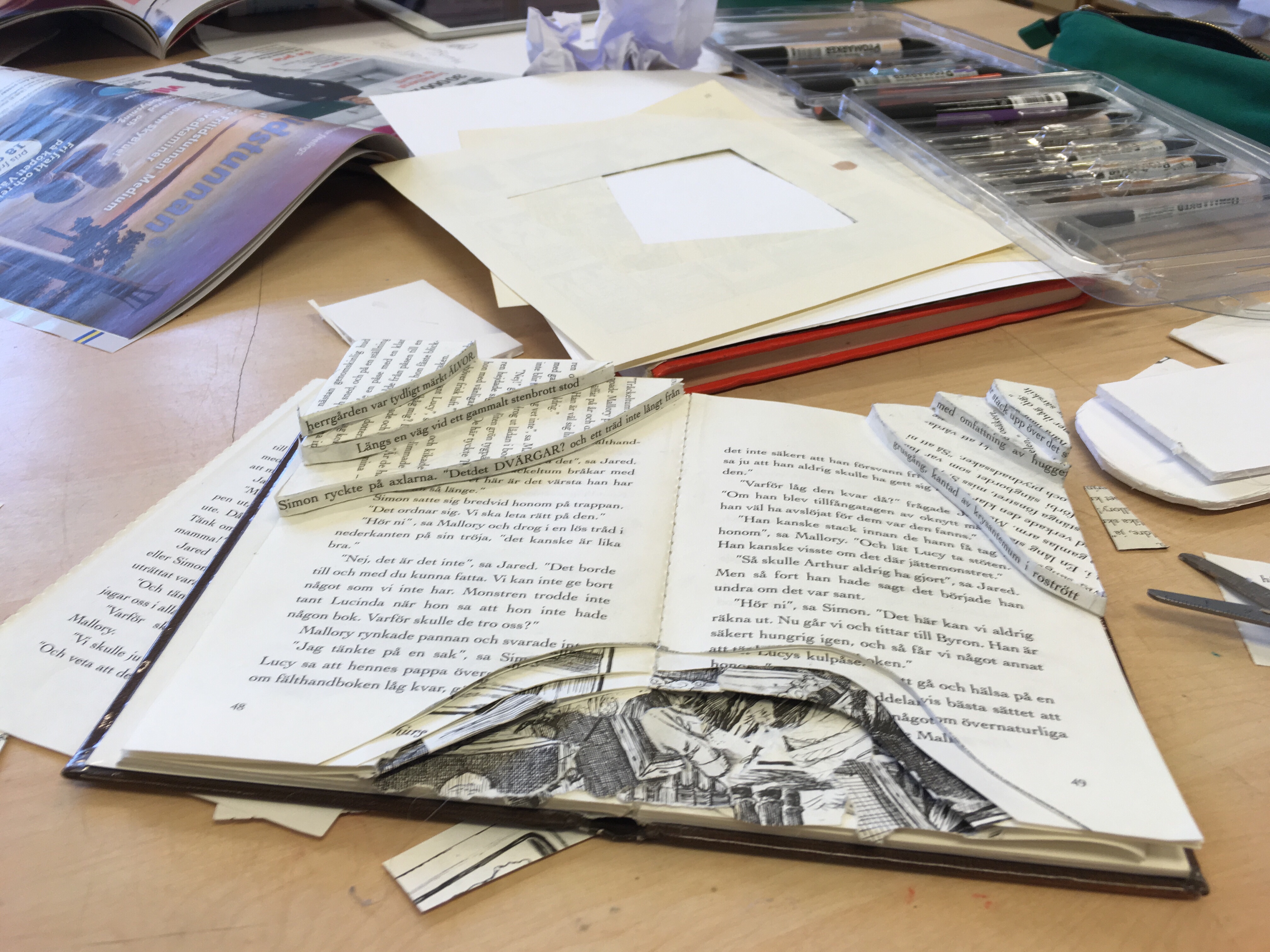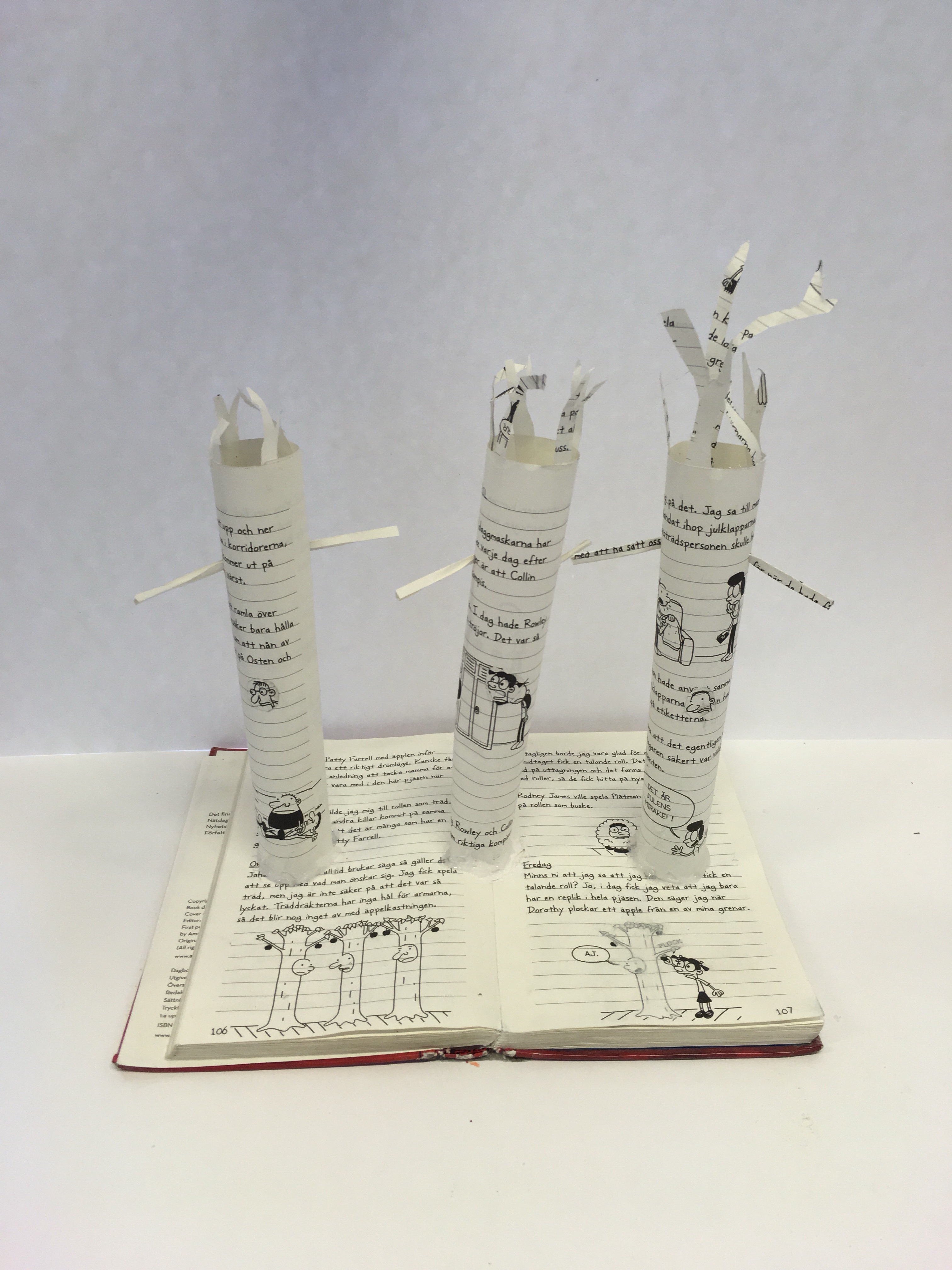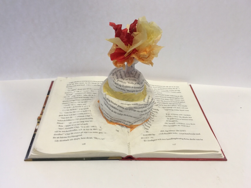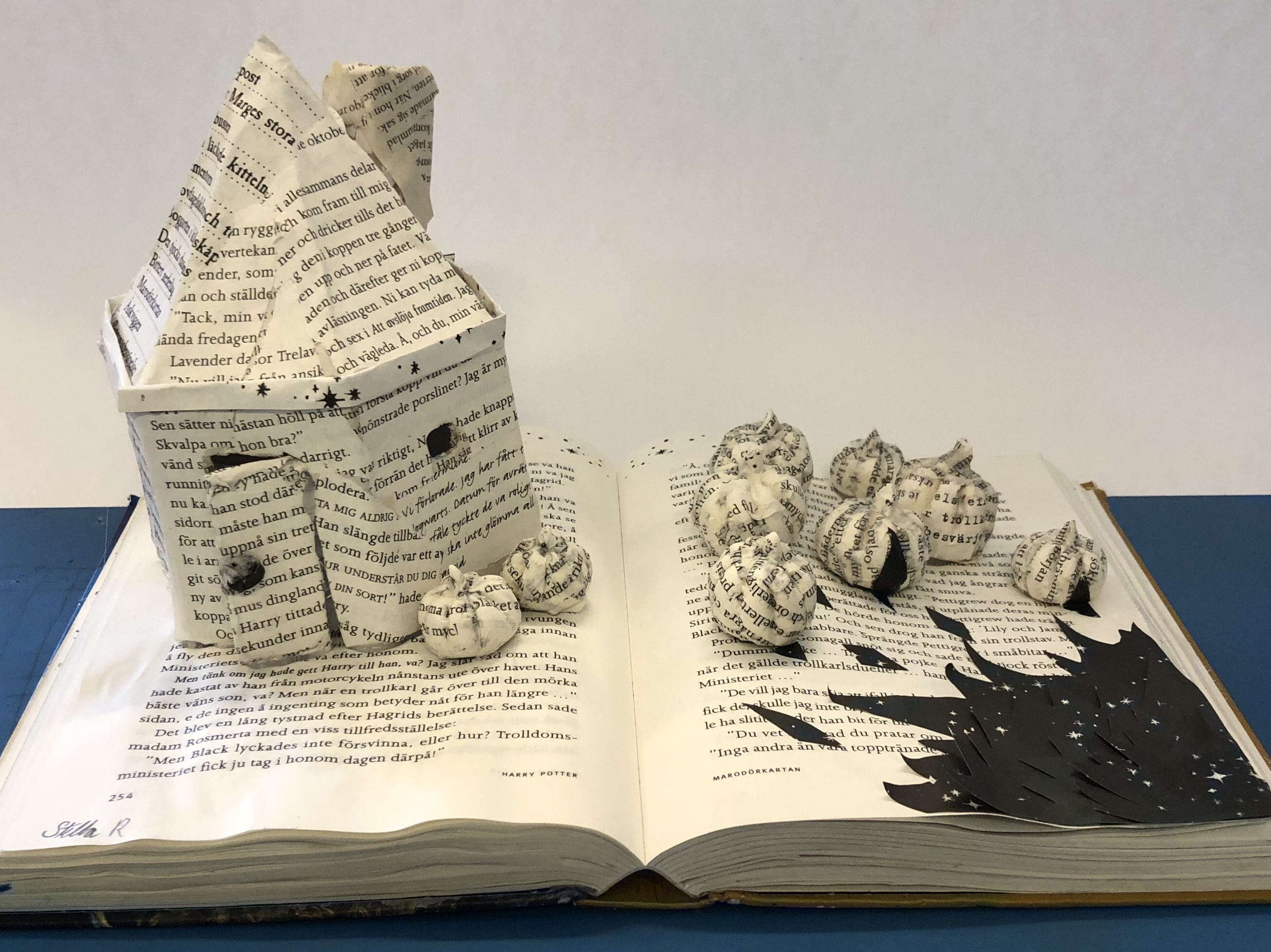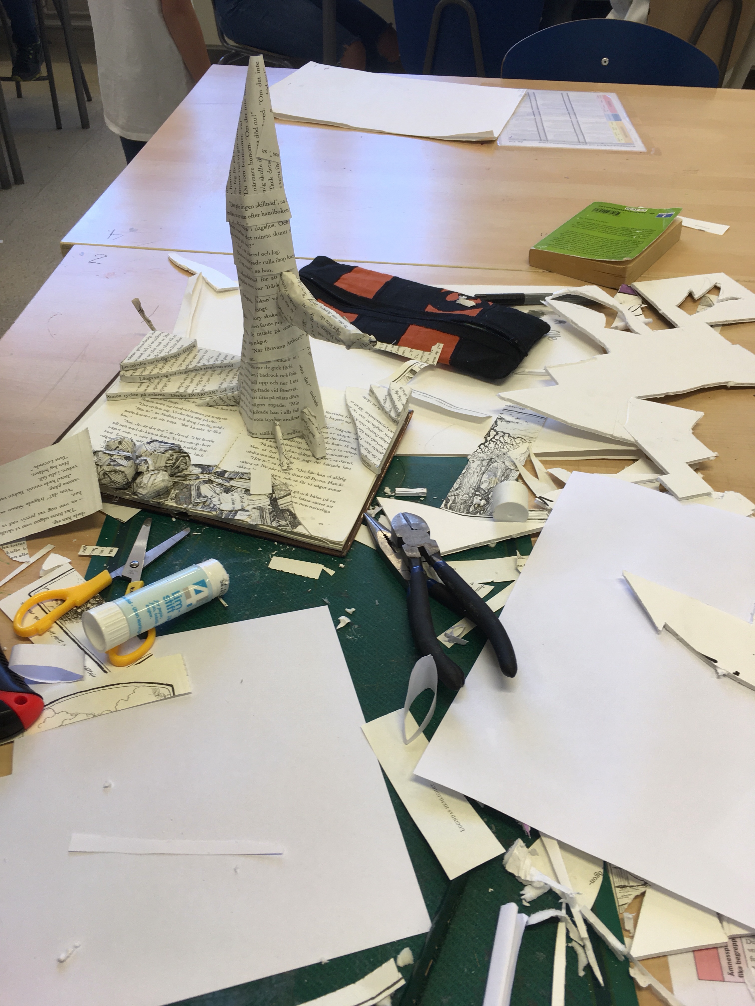 Vi har fått utgallrade böcker av biblioteket. Böckerna ska nu få liv genom att ”byggas” ut av självaste sidorna i boken. Eleverna utgår ifrån bokens titel, handling eller illustrationer.