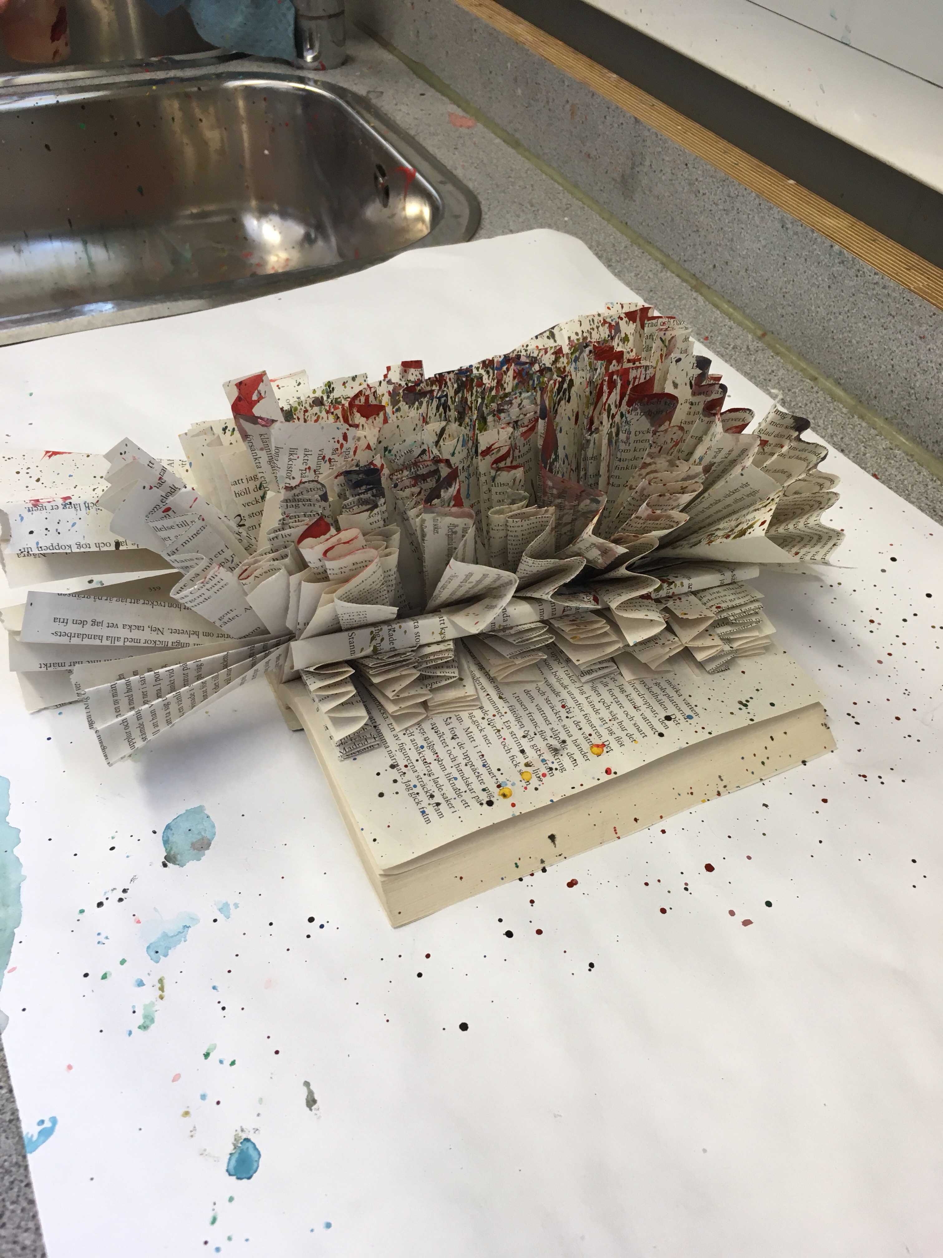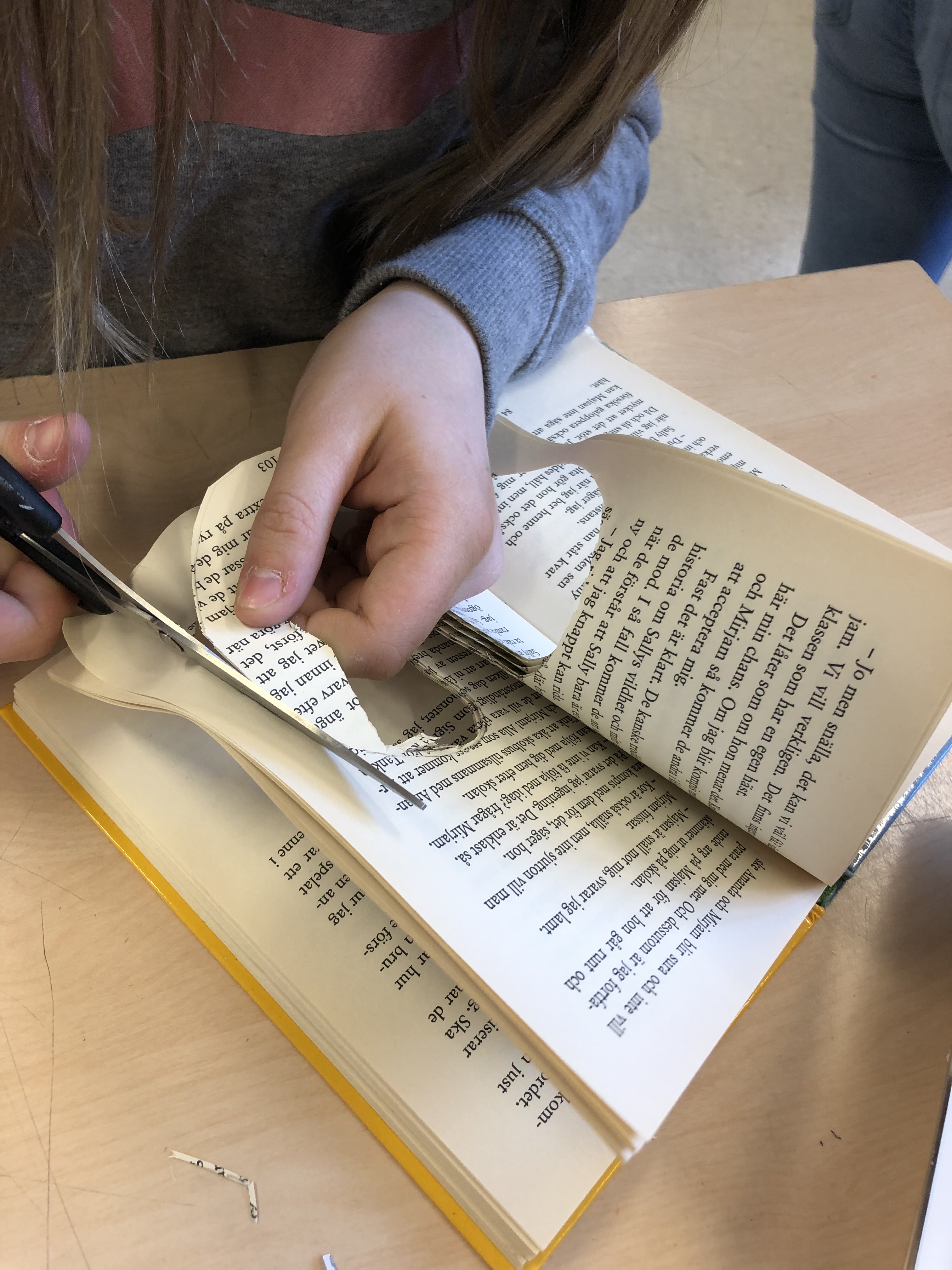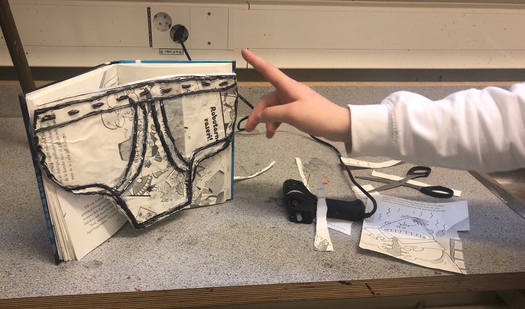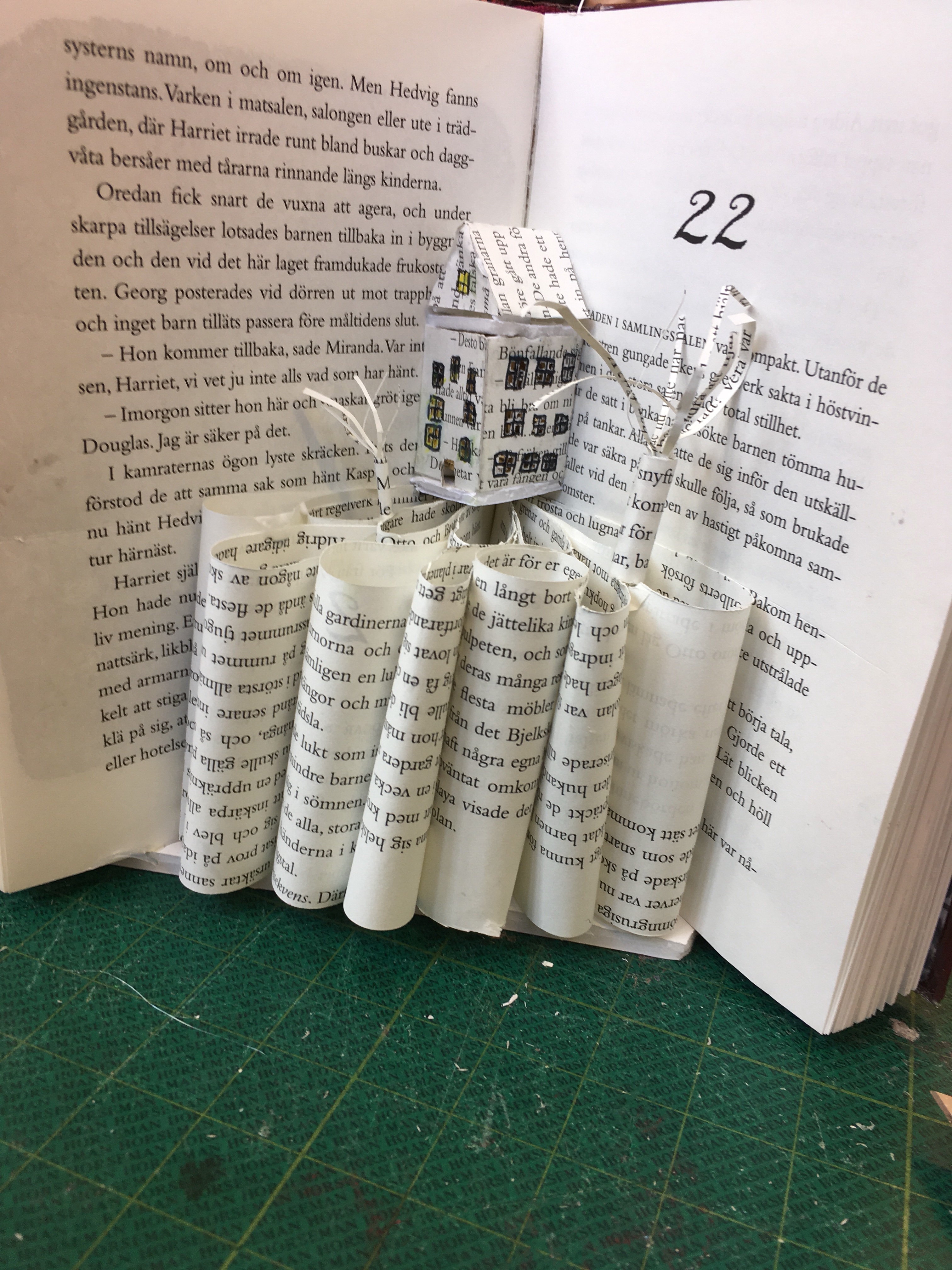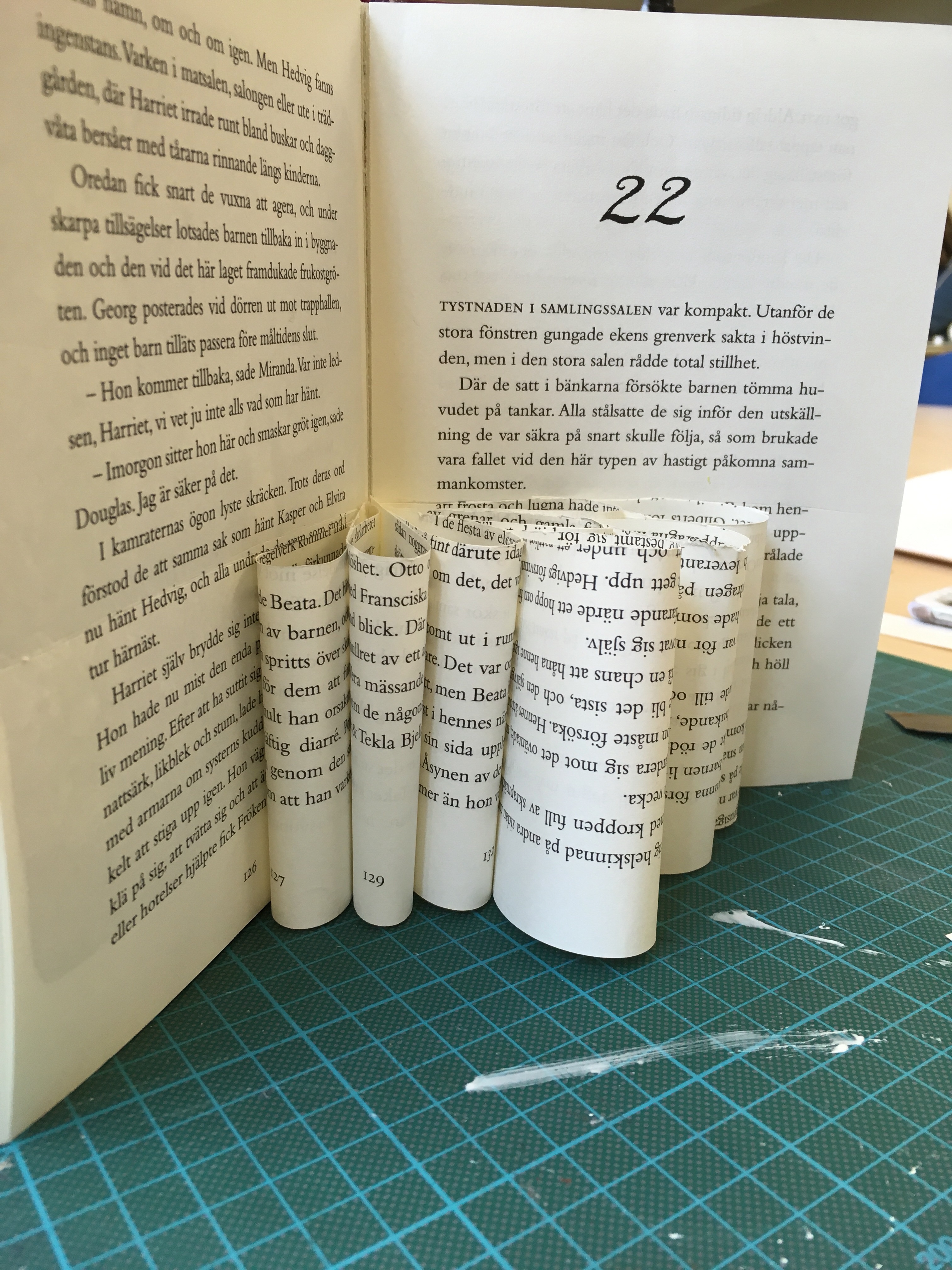 Vi har fått utgallrade böcker av biblioteket. Böckerna ska nu få liv genom att ”byggas” ut av självaste sidorna i boken. Eleverna utgår ifrån bokens titel, handling eller illustrationer.