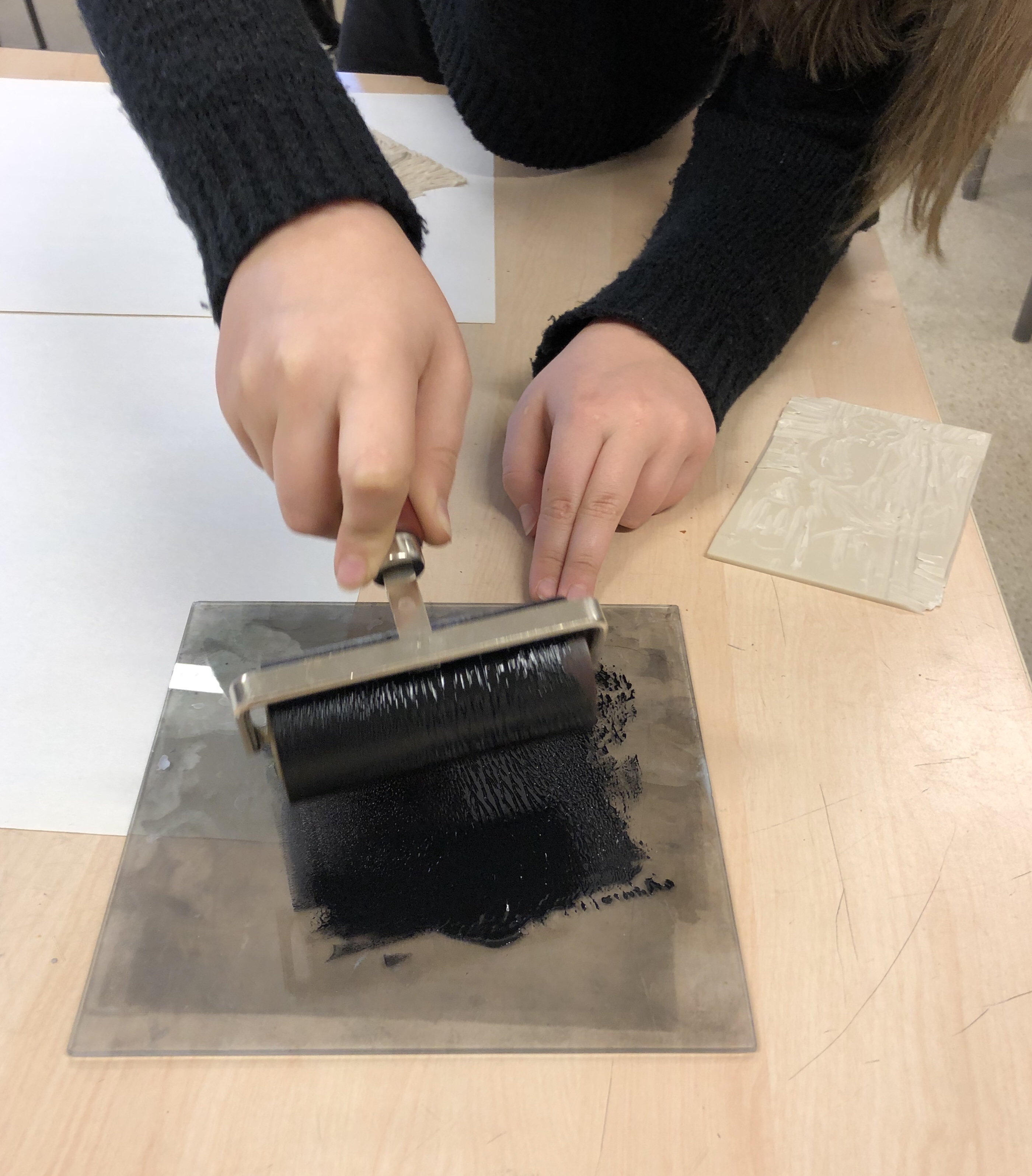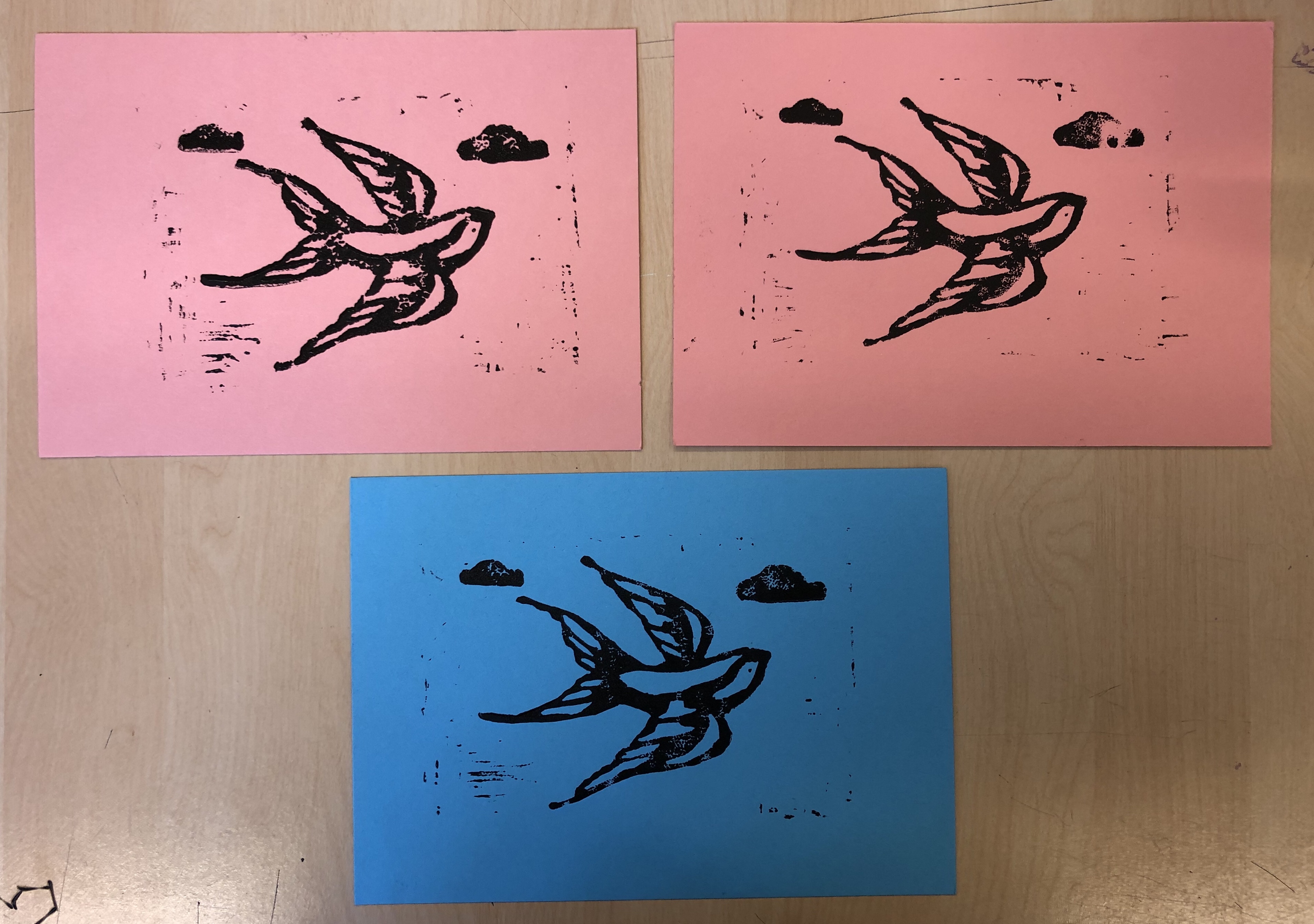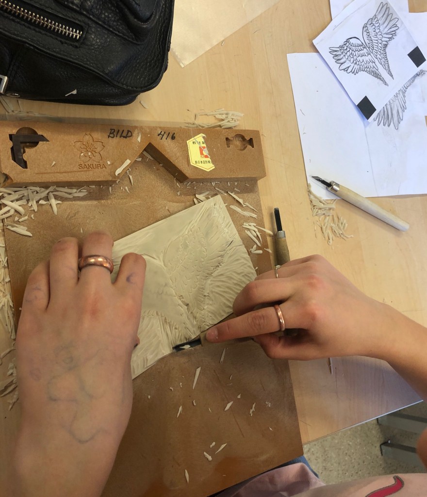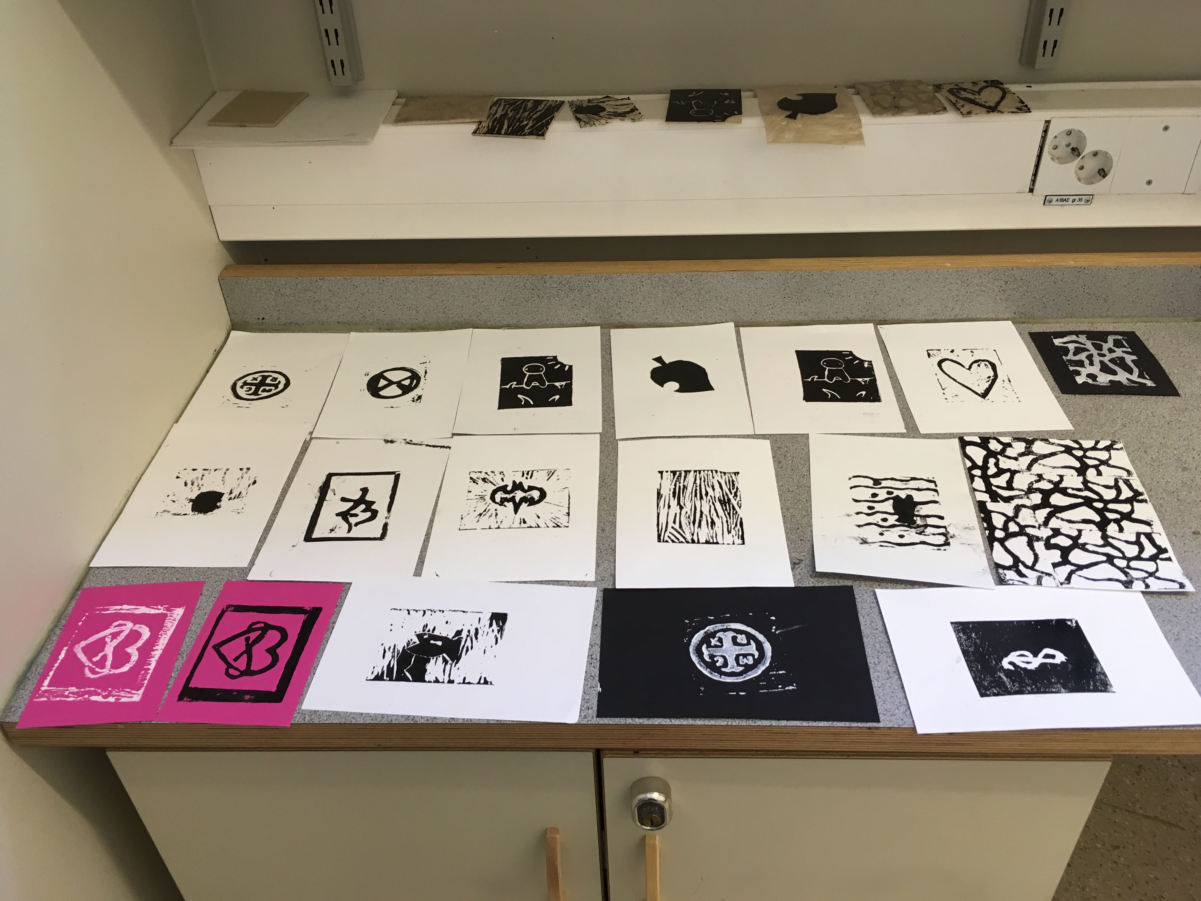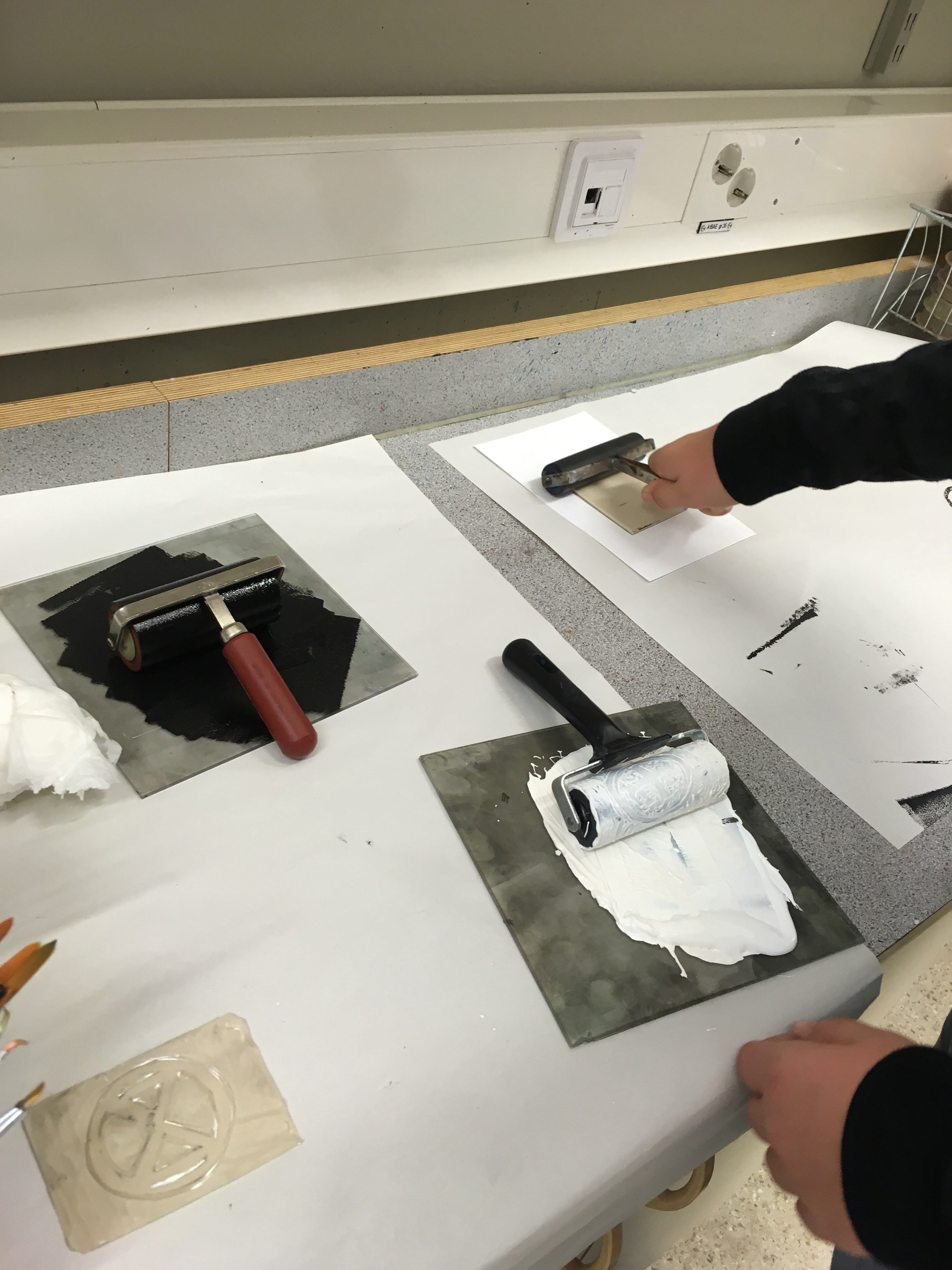 Vi ger oss på en riktig kluring. Att karva i linoleum är inte lätt. Sen ska det valsas på färg och tryckas med lagom mycket färg och lagom mycket tryckkraft.