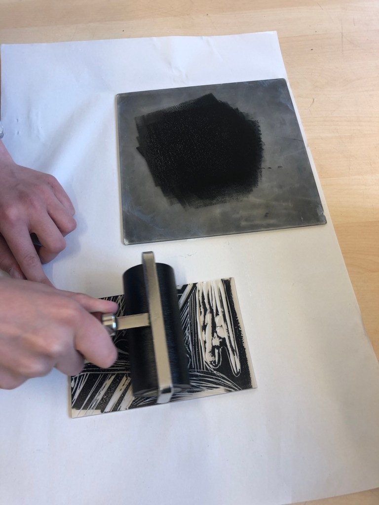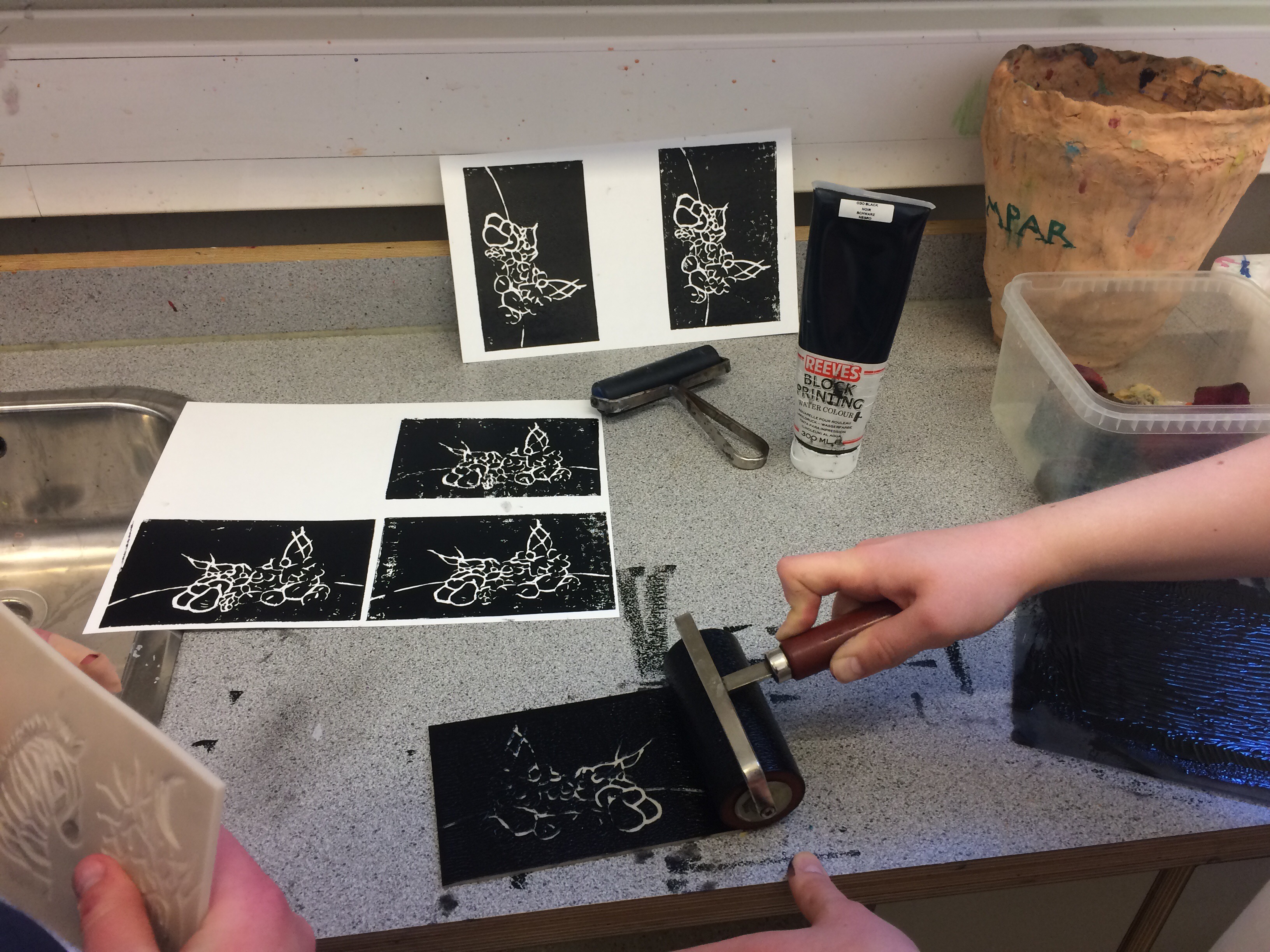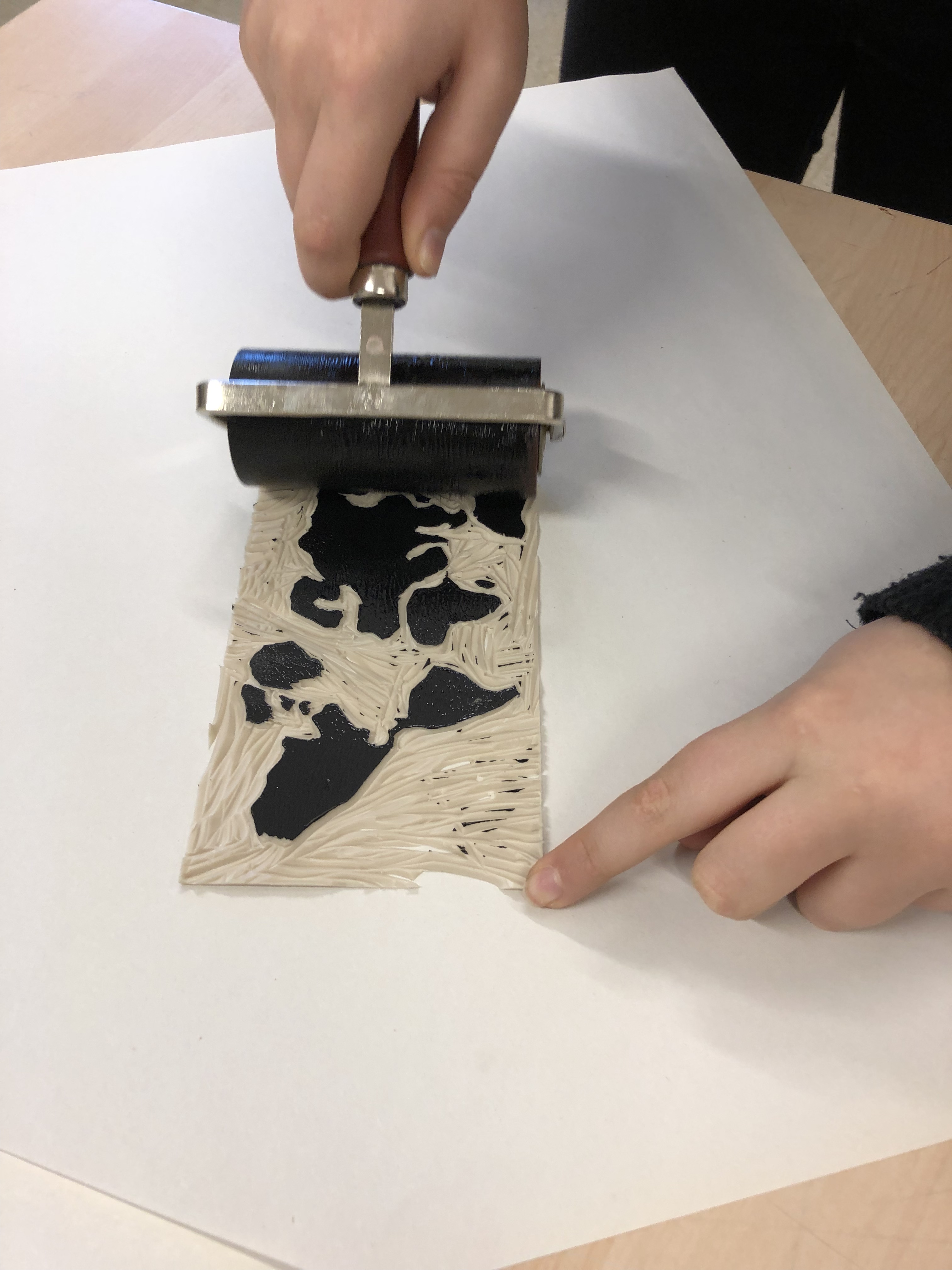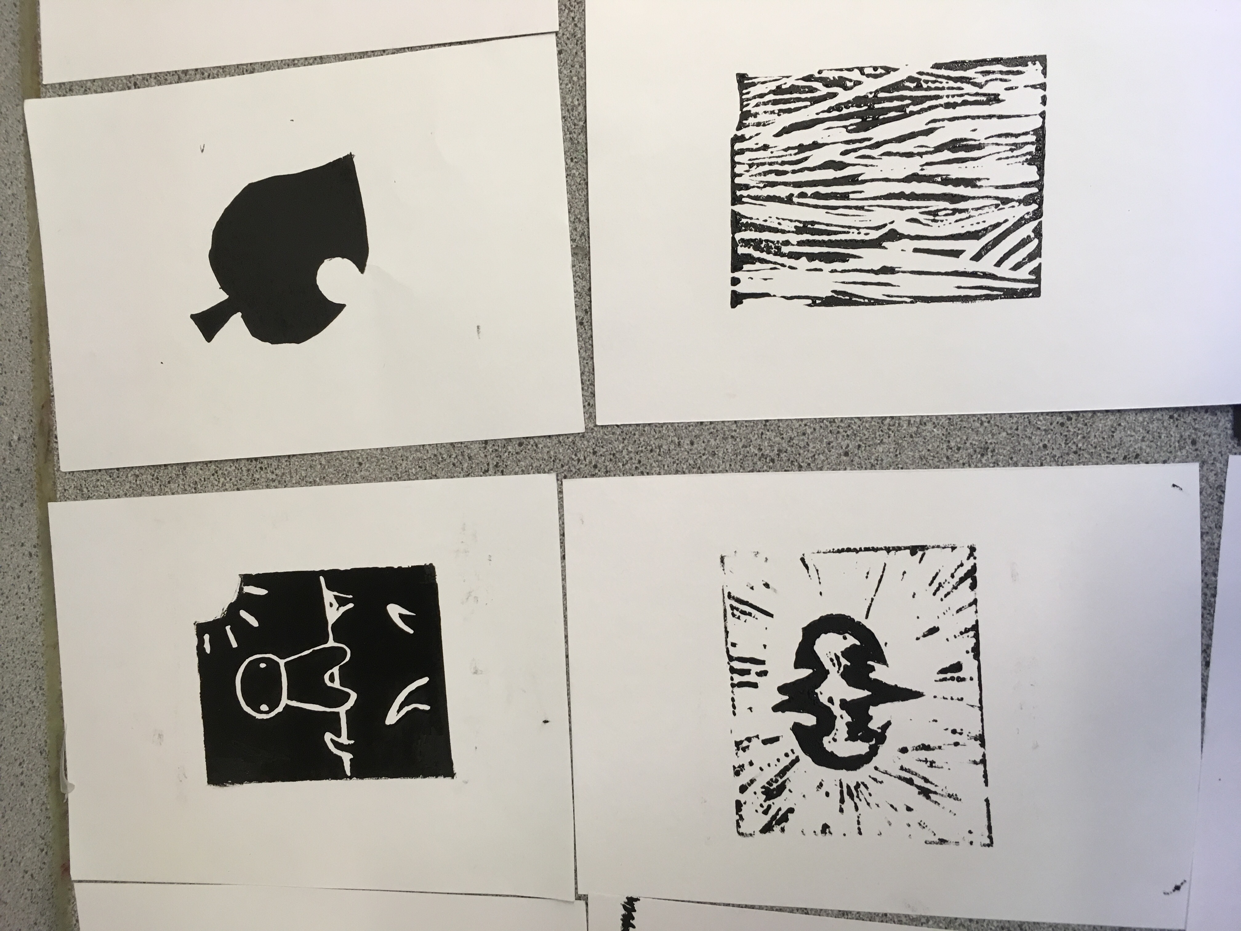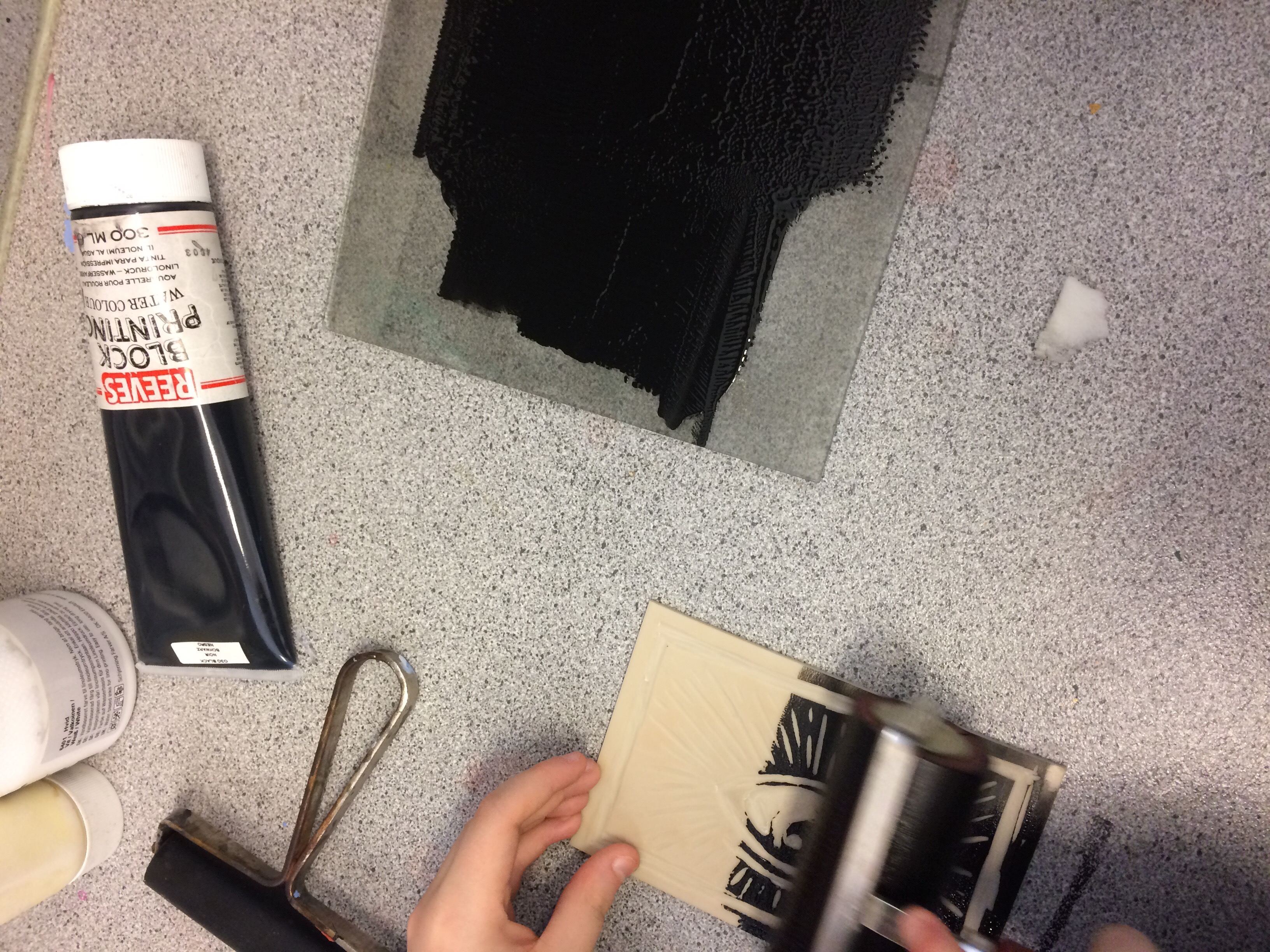 Vi ger oss på en riktig kluring. Att karva i linoleum är inte lätt. Sen ska det valsas på färg och tryckas med lagom mycket färg och lagom mycket tryckkraft.