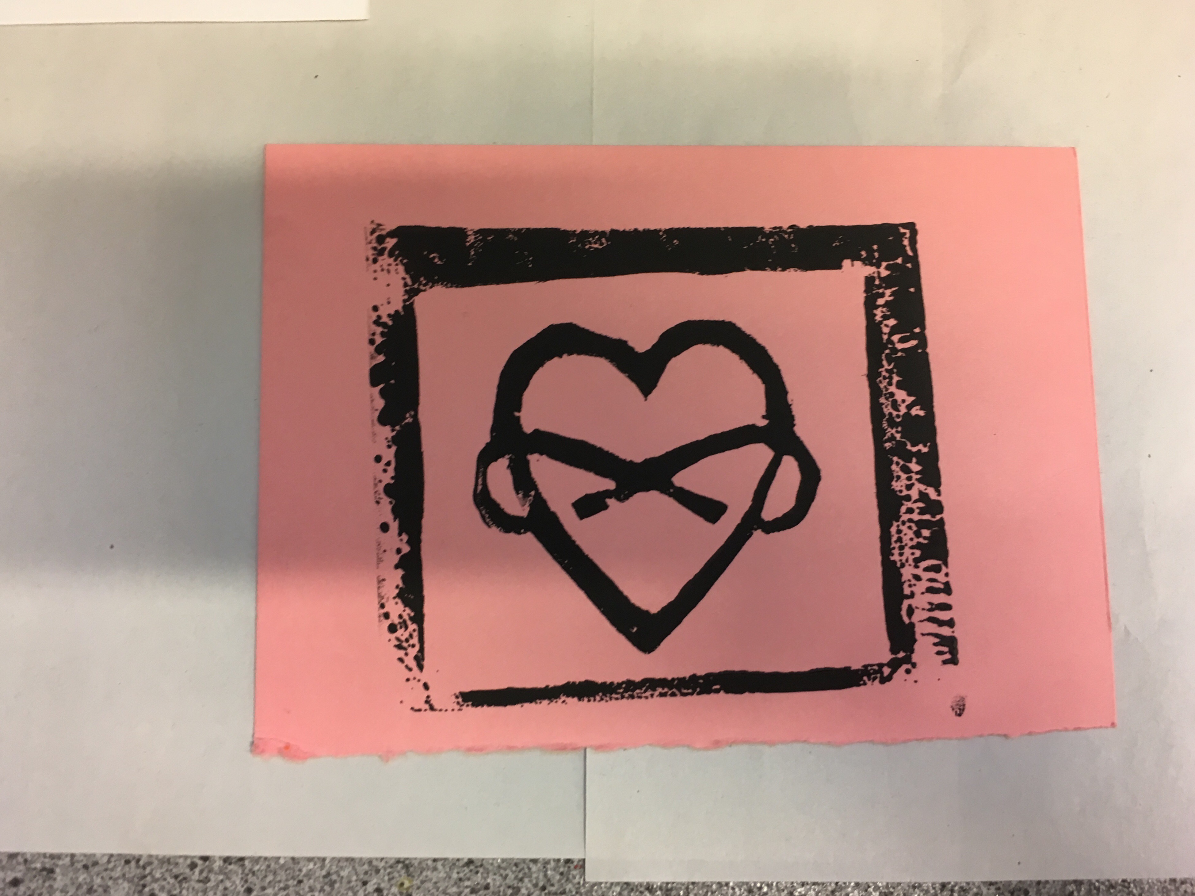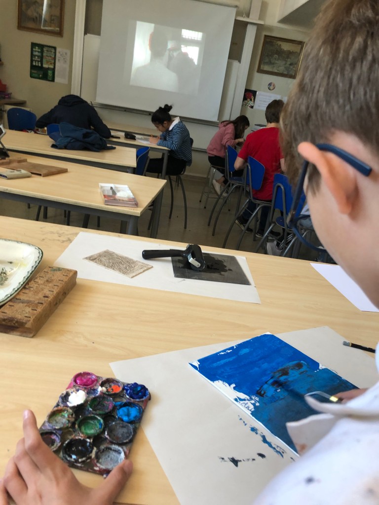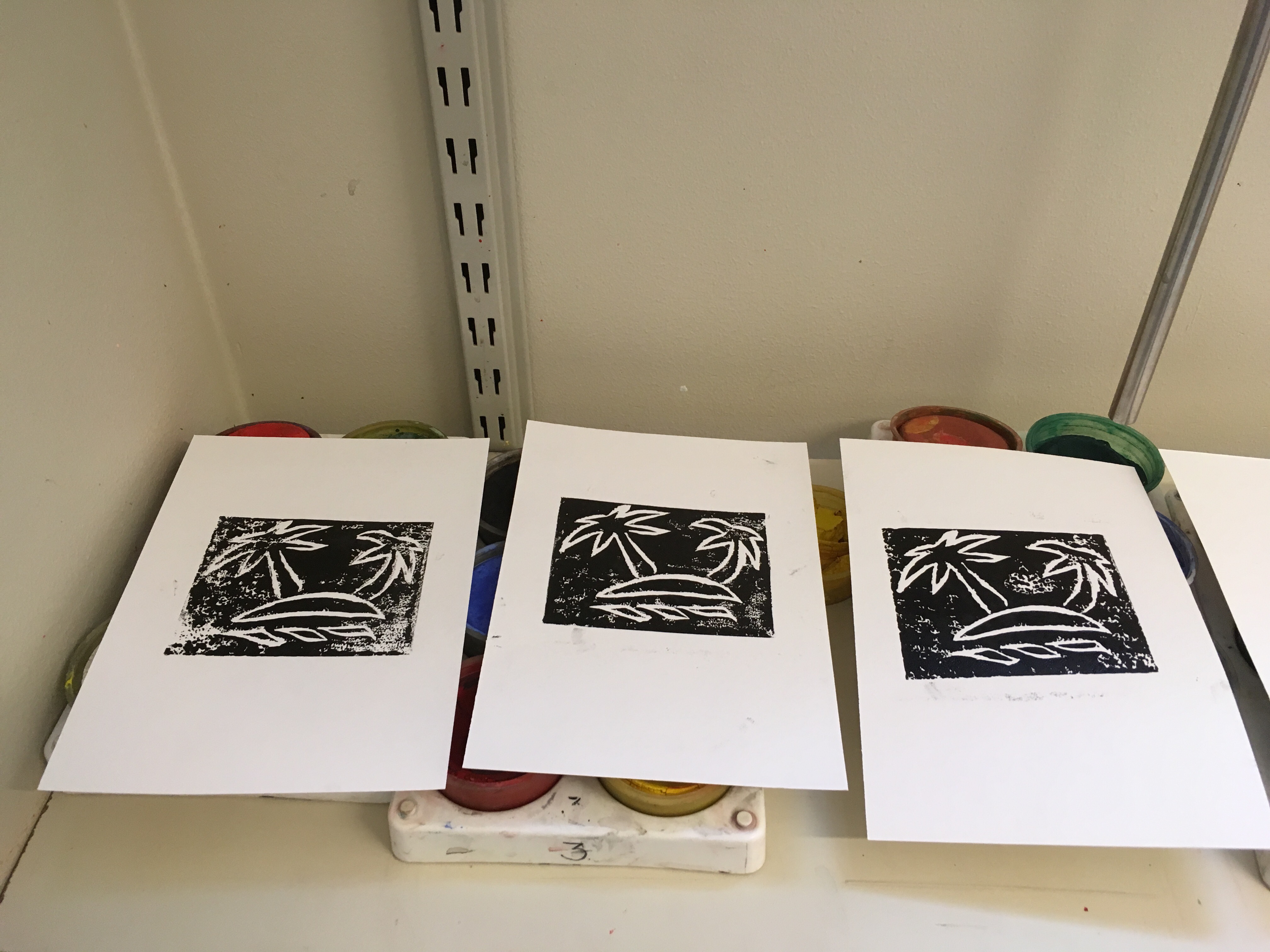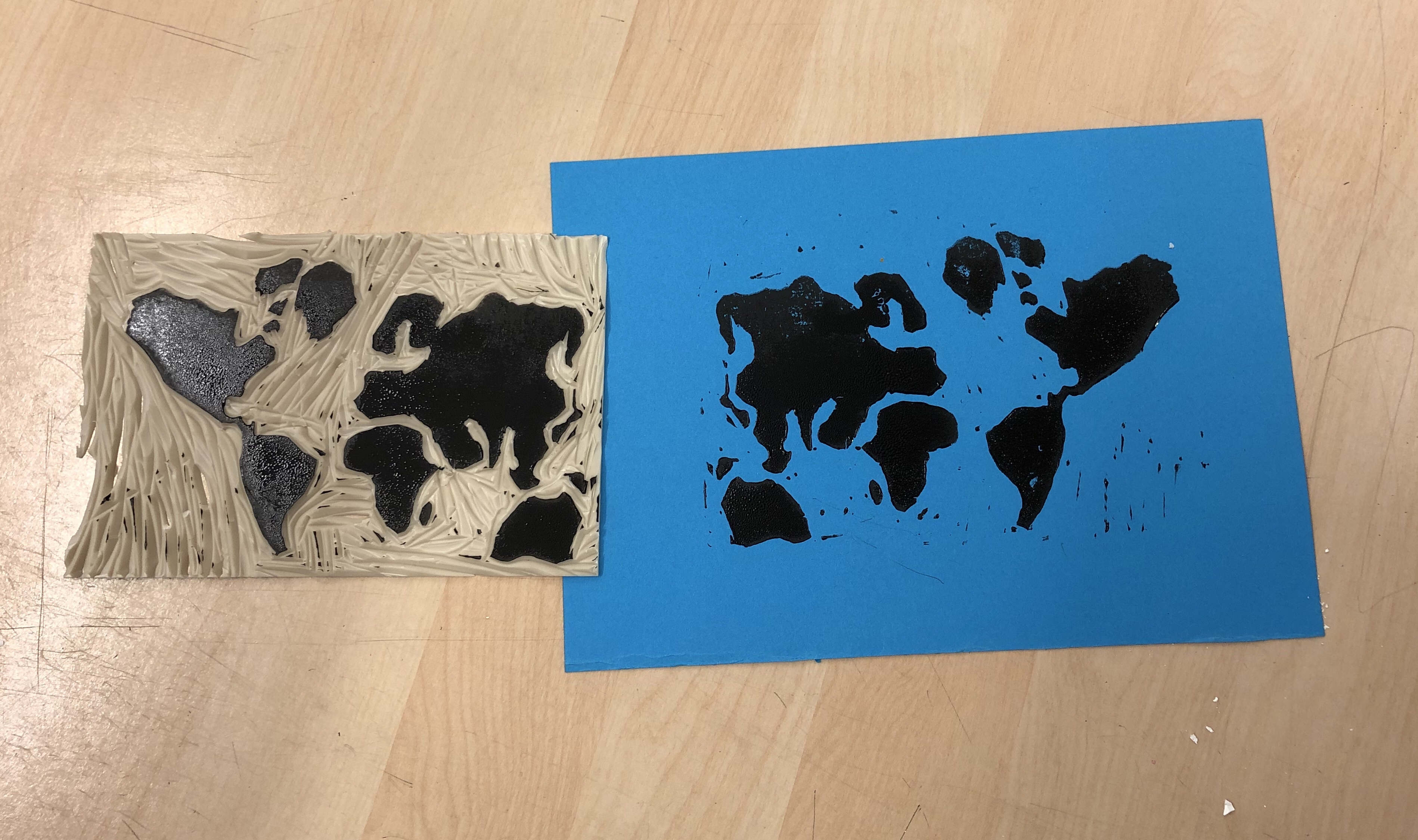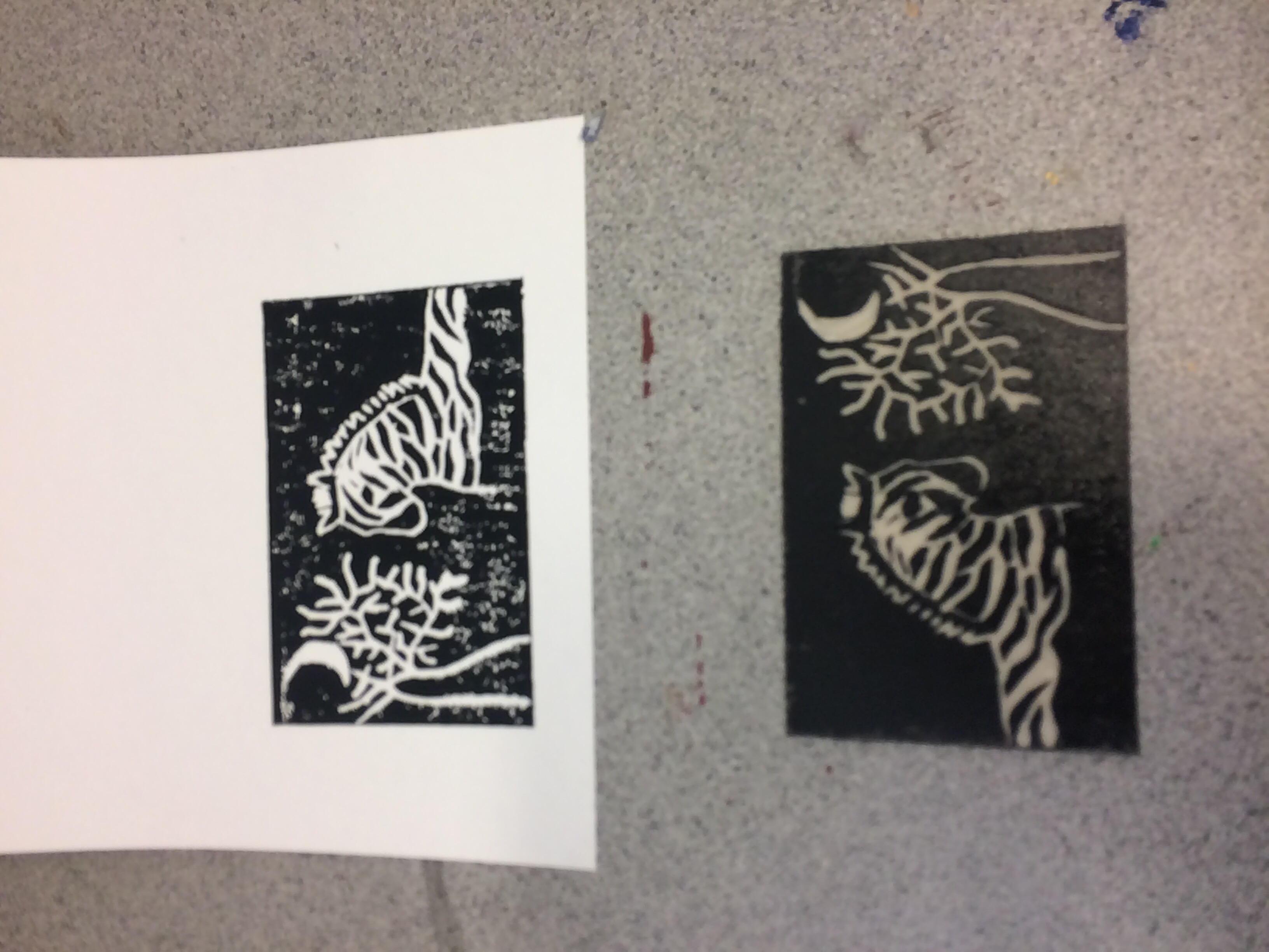 Vi ger oss på en riktig kluring. Att karva i linoleum är inte lätt. Sen ska det valsas på färg och tryckas med lagom mycket färg och lagom mycket tryckkraft.