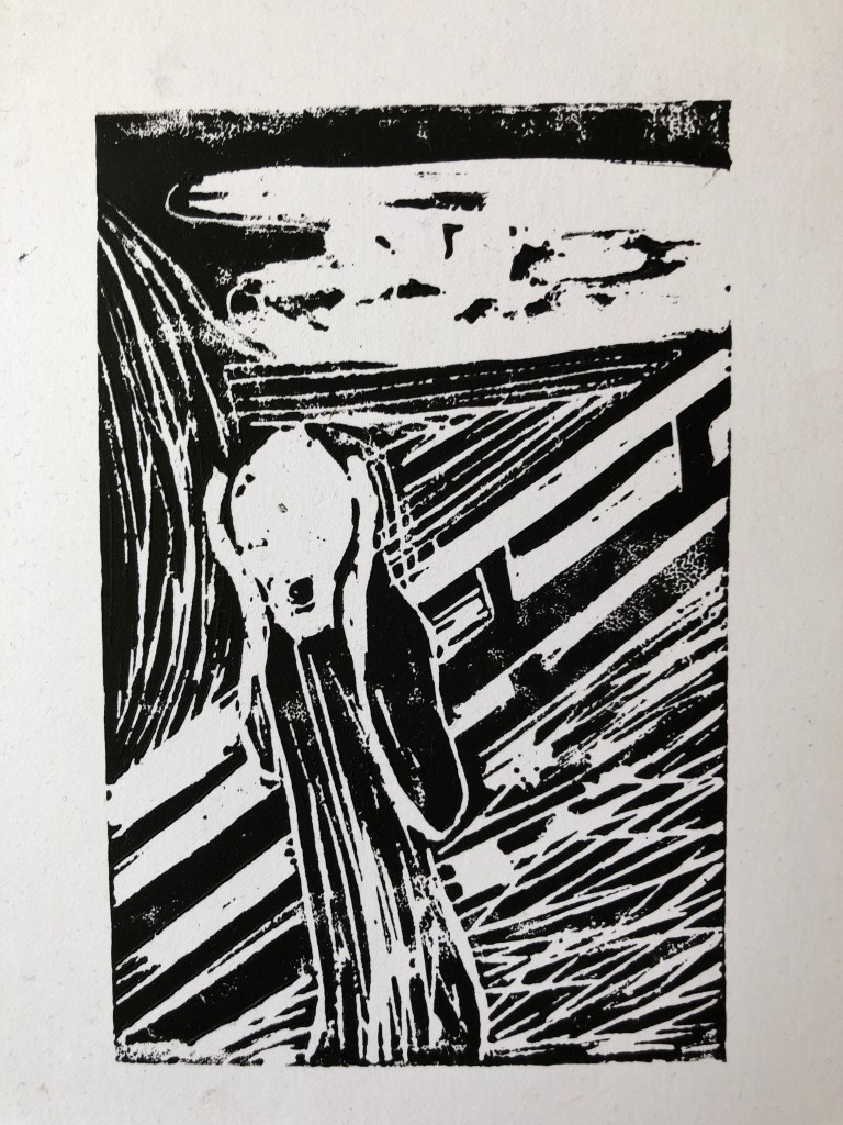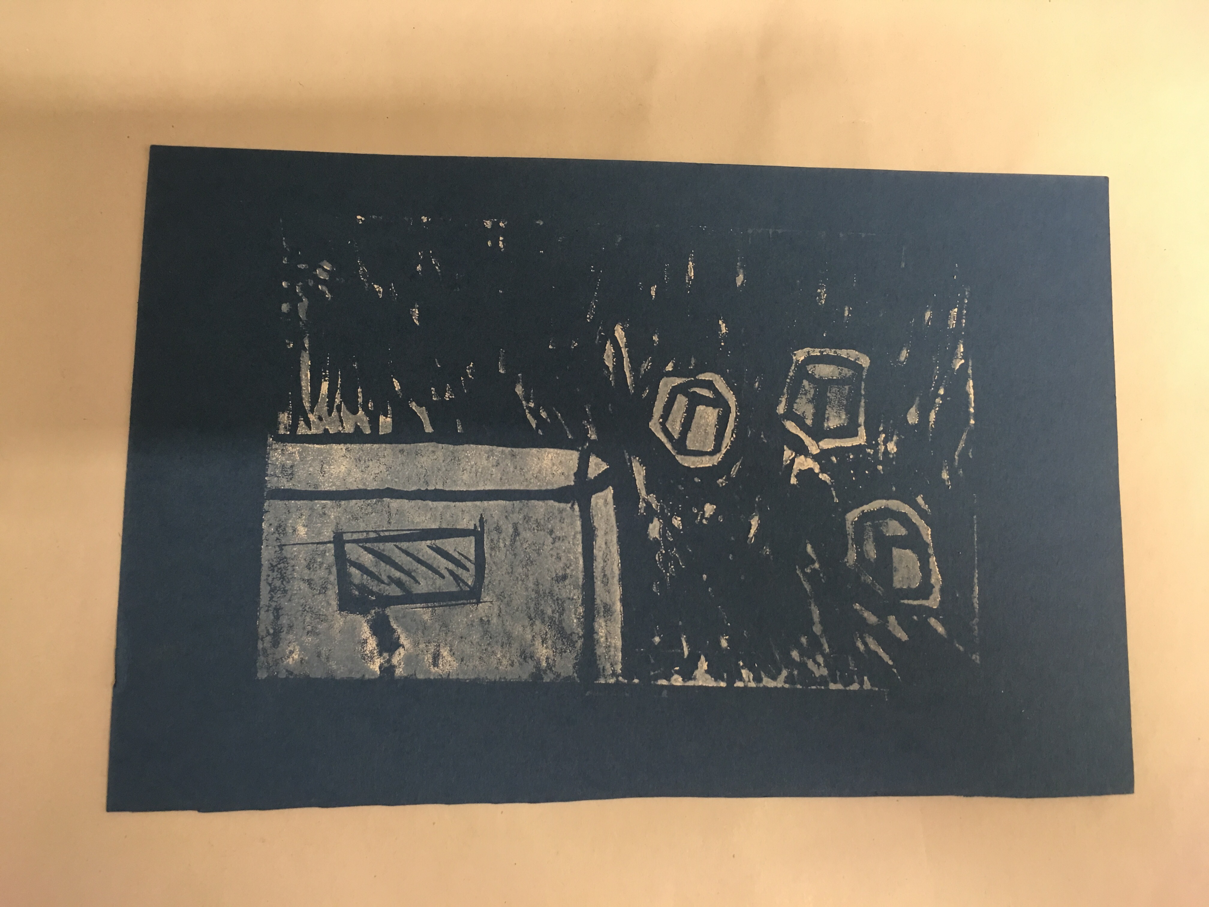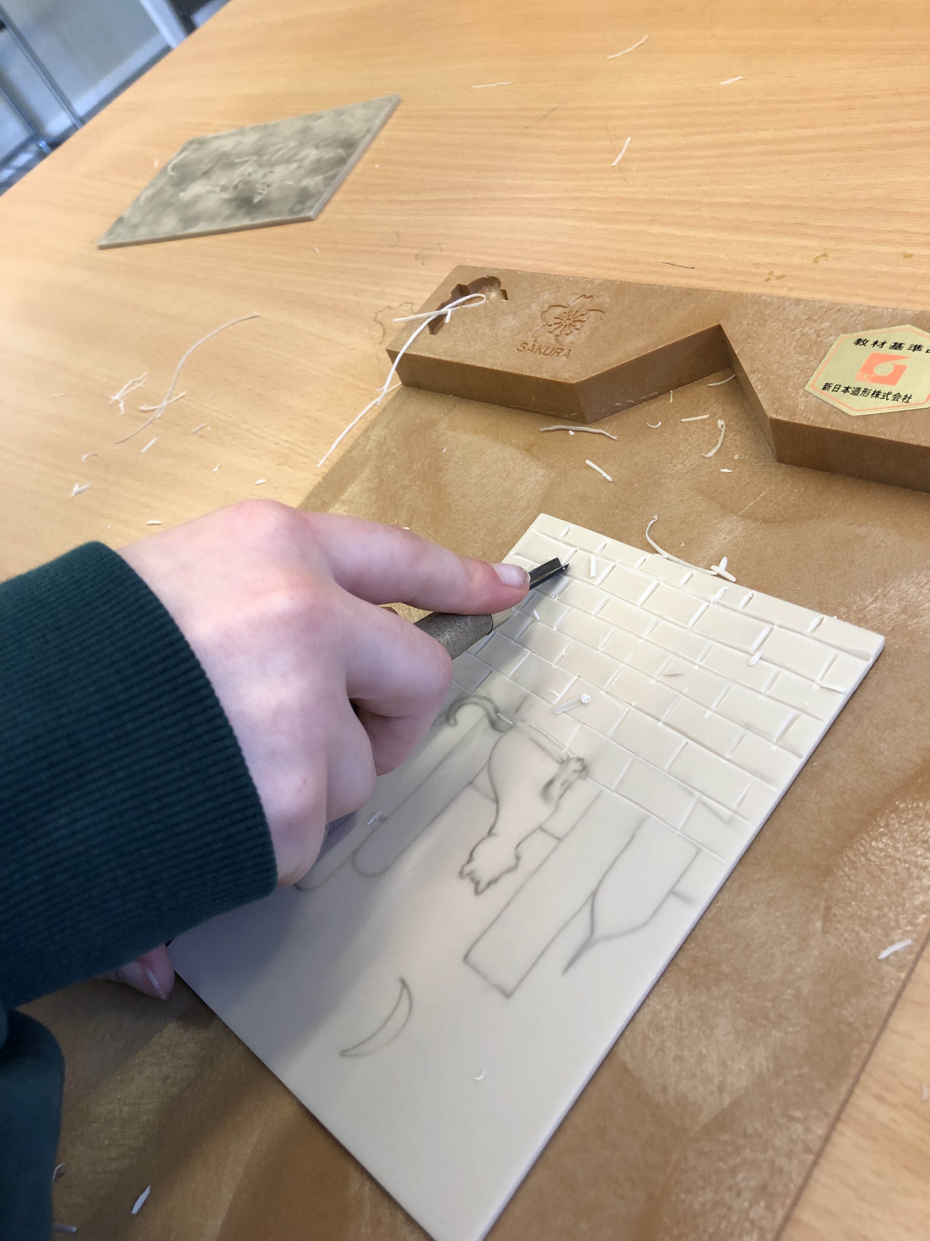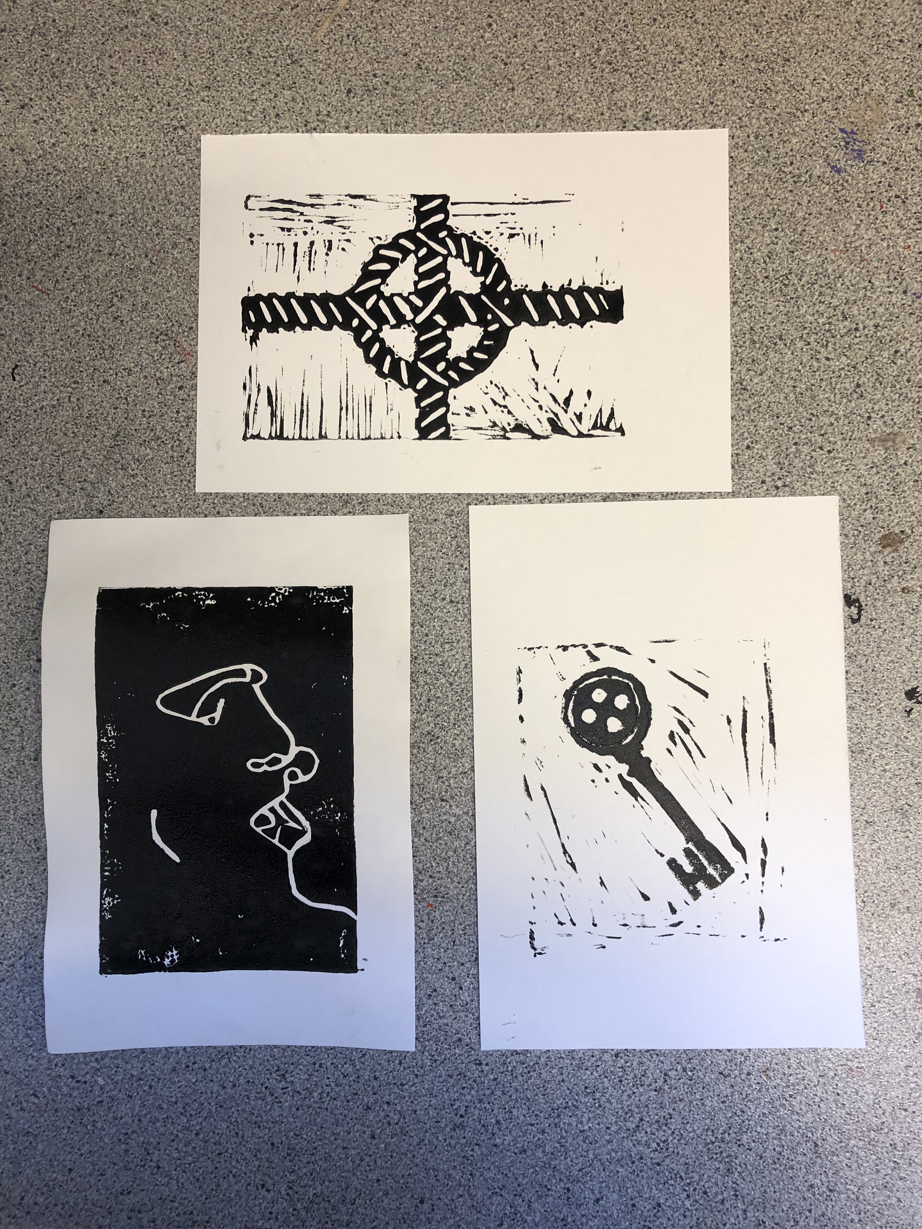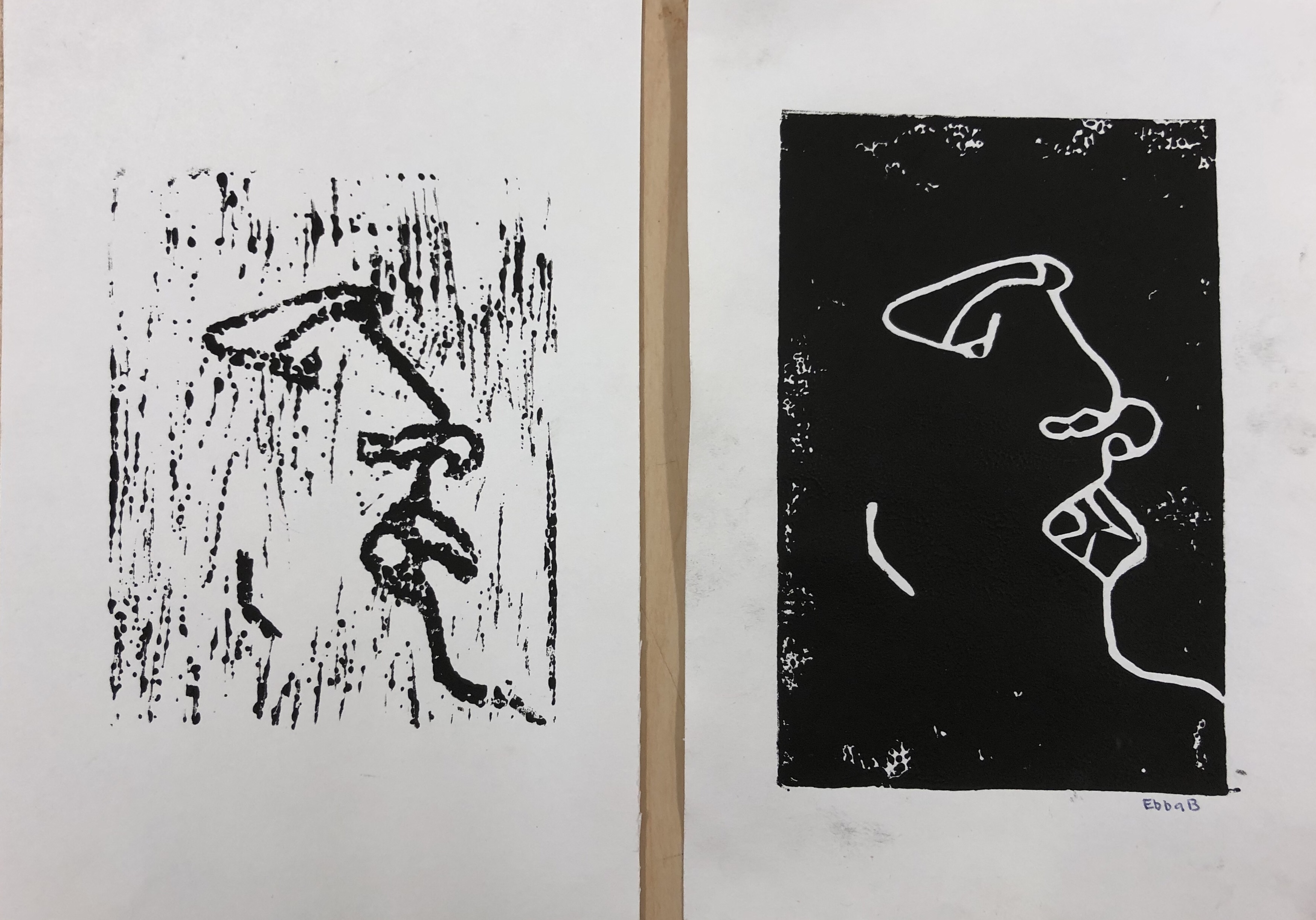 Vi ger oss på en riktig kluring. Att karva i linoleum är inte lätt. Sen ska det valsas på färg och tryckas med lagom mycket färg och lagom mycket tryckkraft.