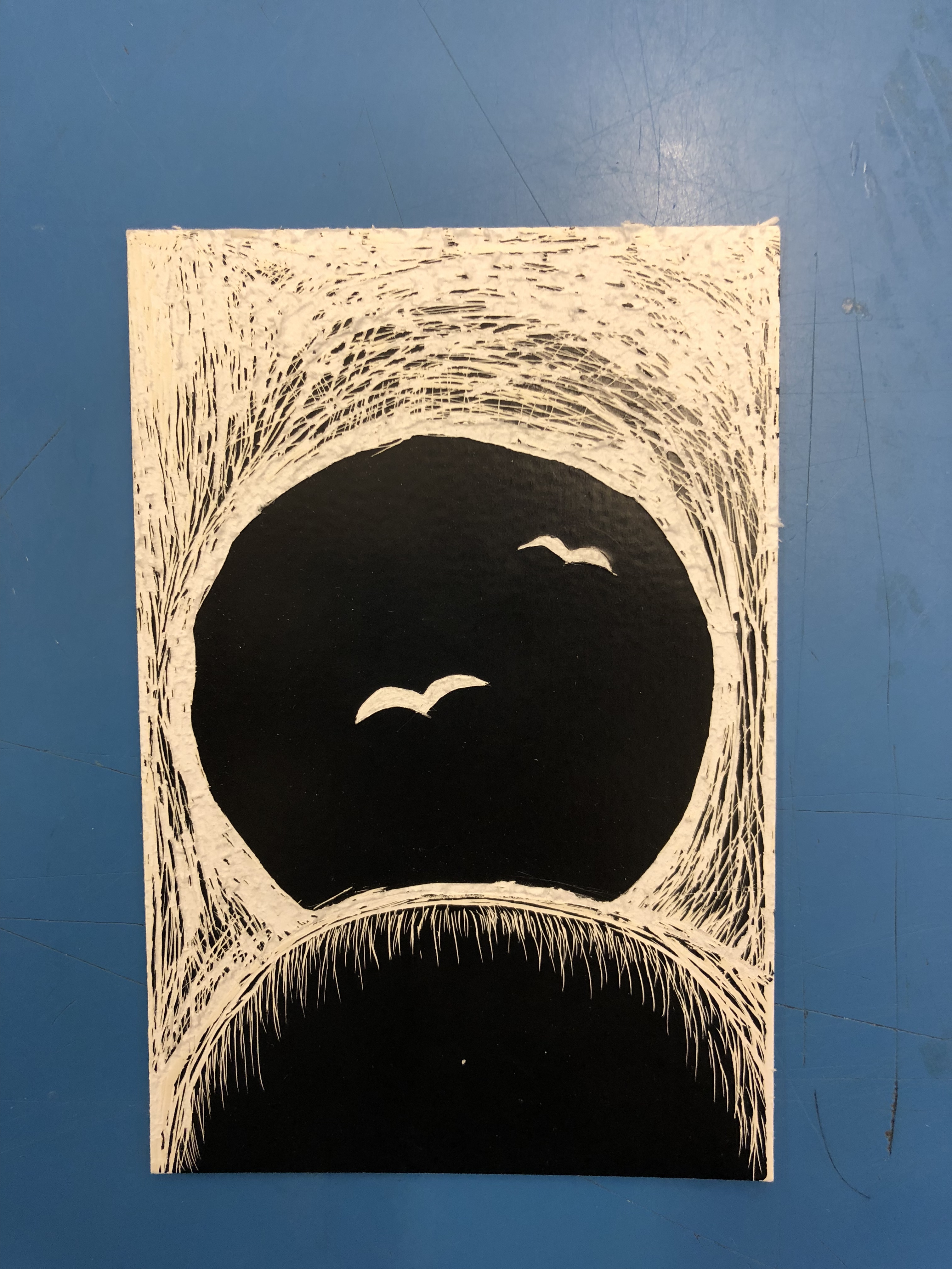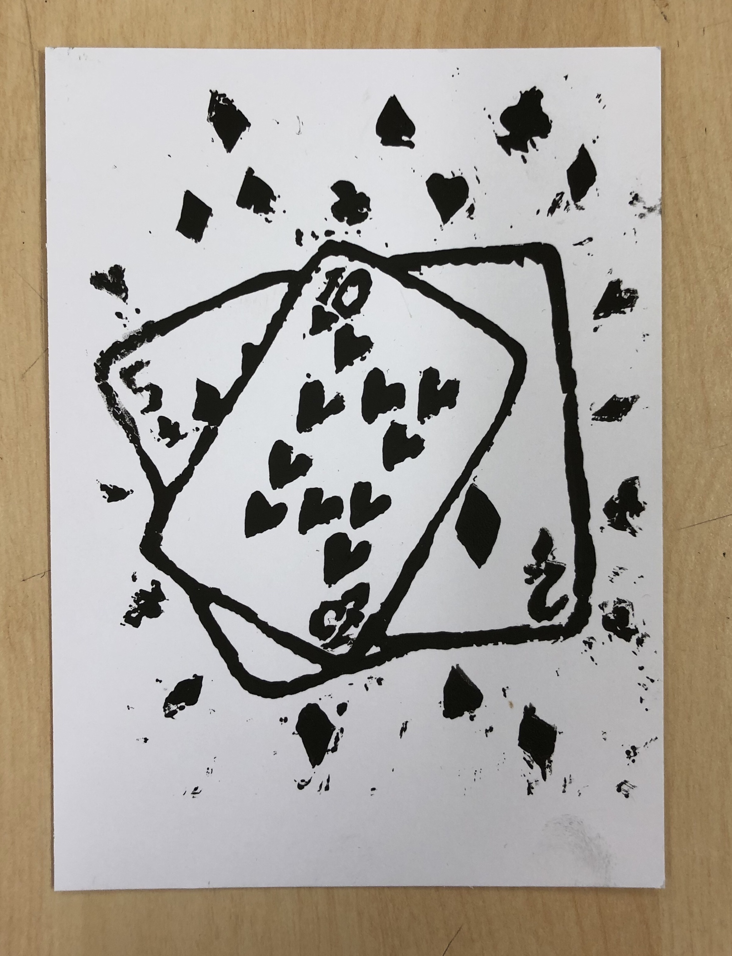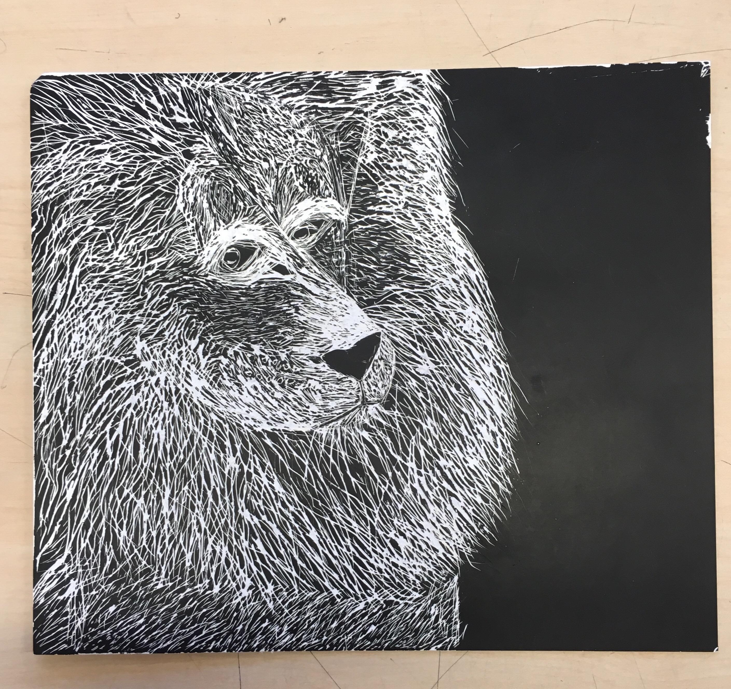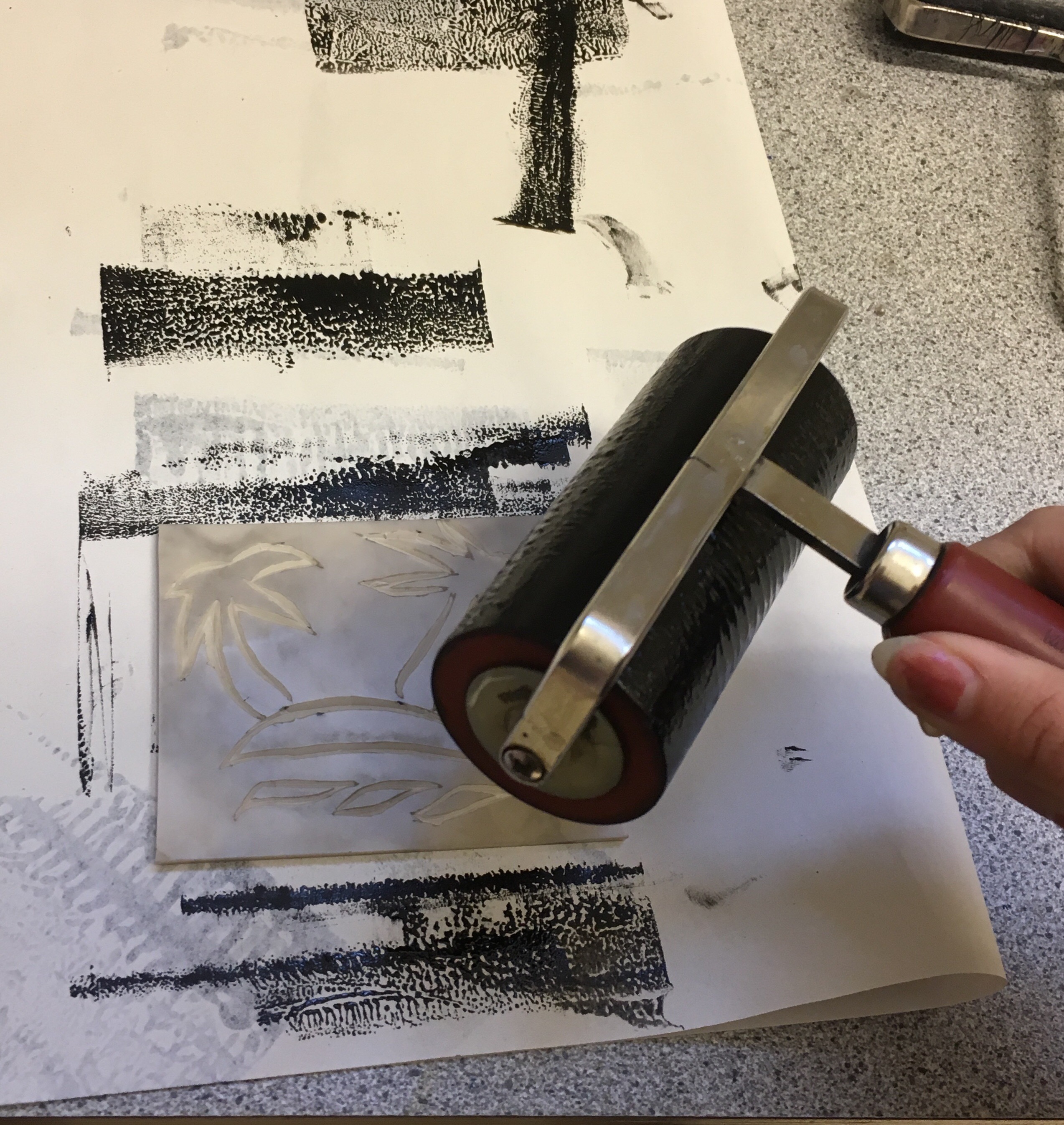 Vi ger oss på en riktig kluring. Att karva i linoleum är inte lätt. Sen ska det valsas på färg och tryckas med lagom mycket färg och lagom mycket tryckkraft.