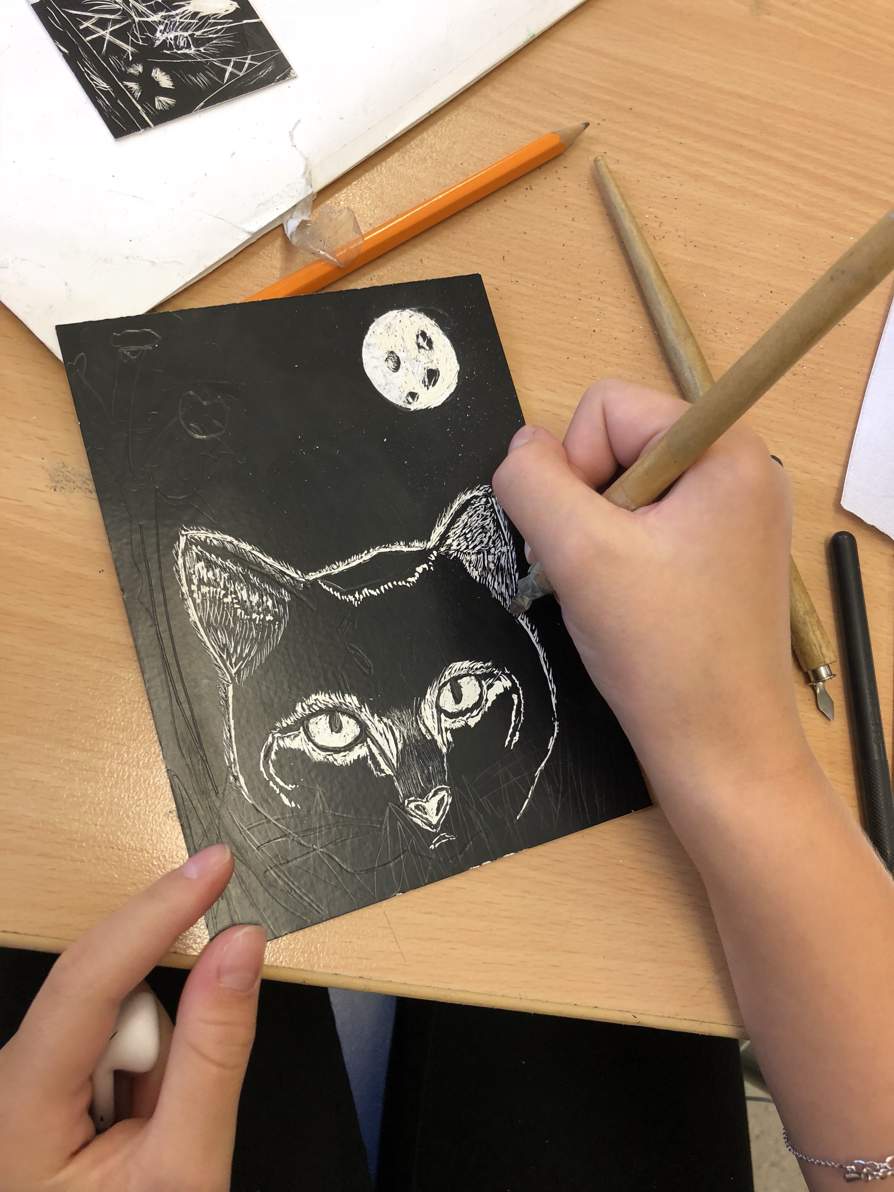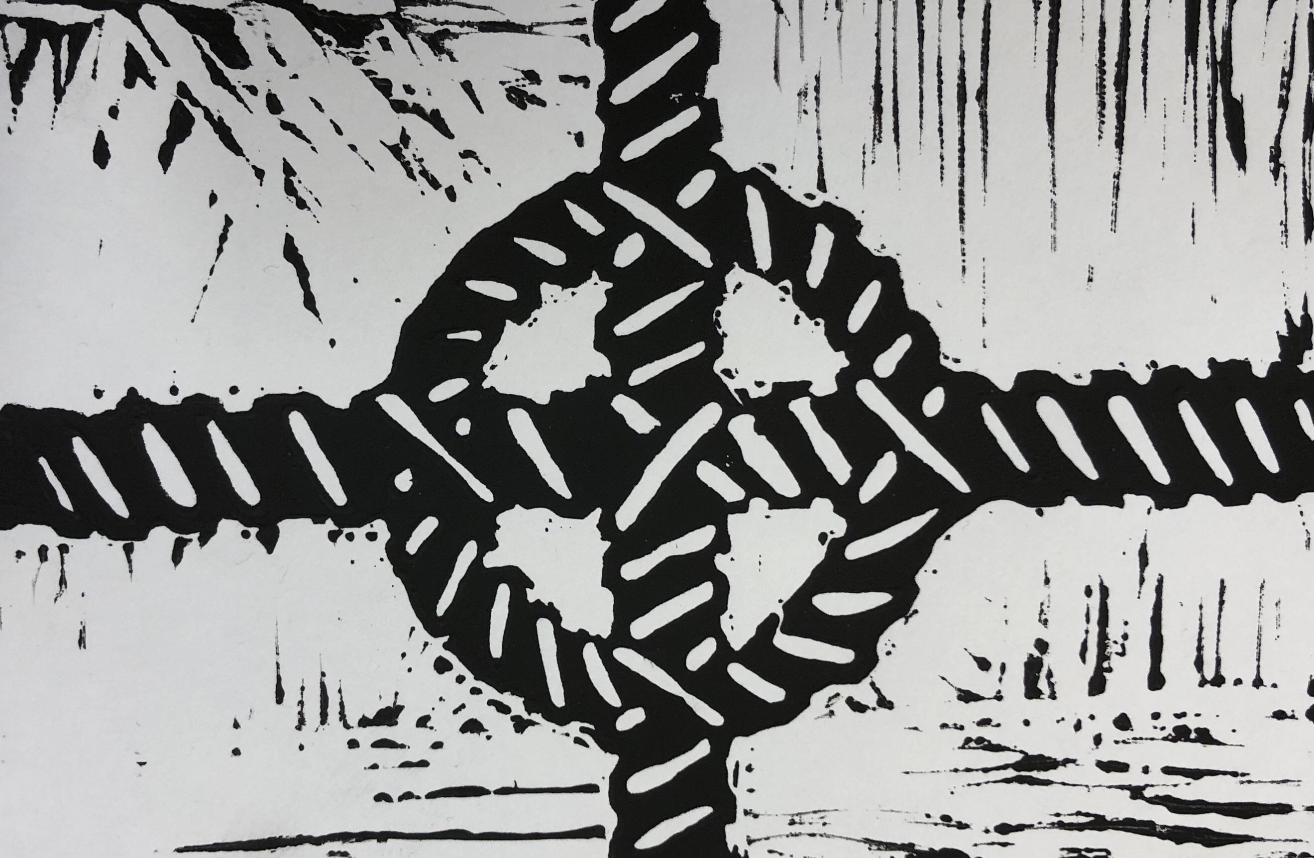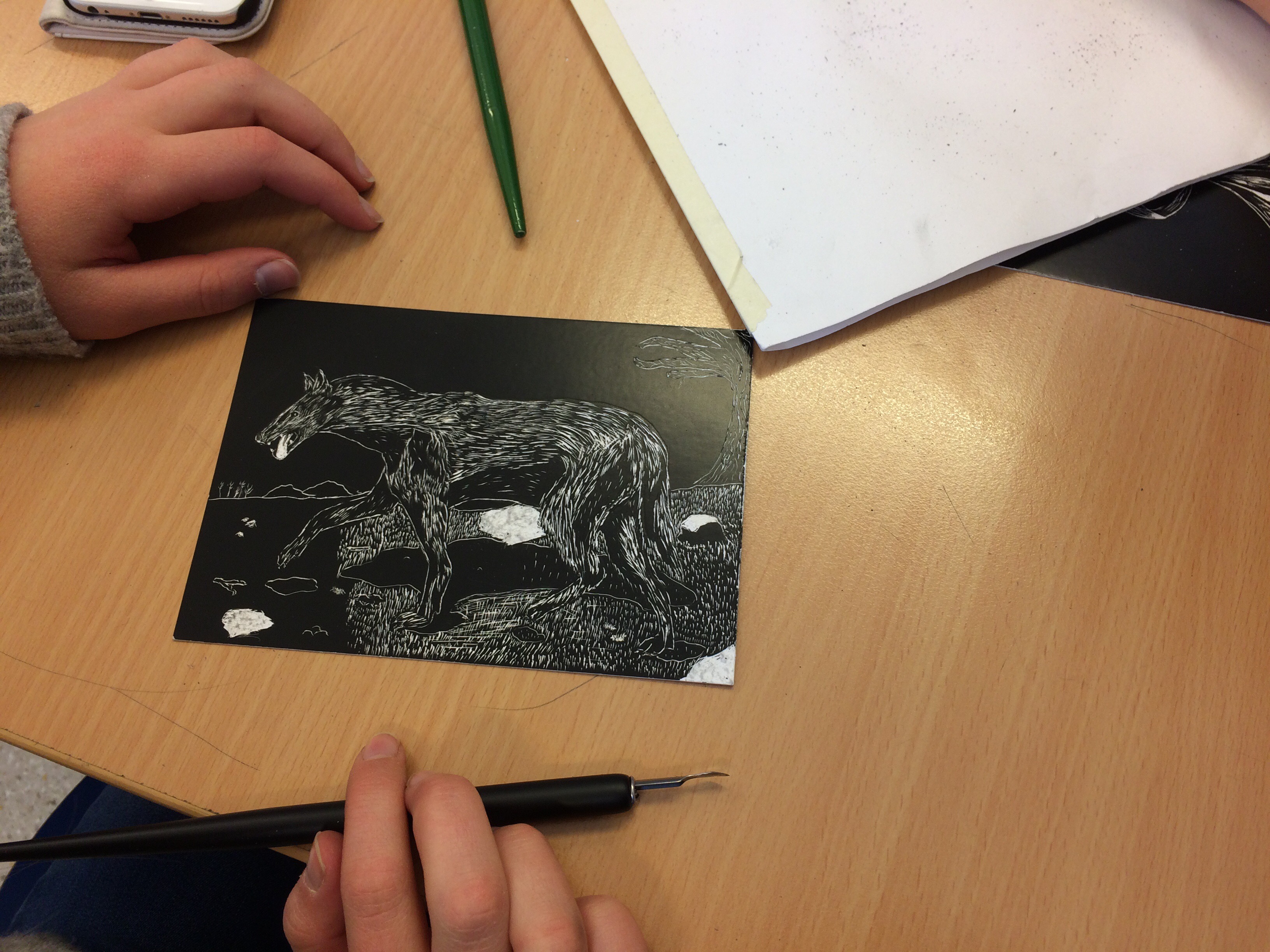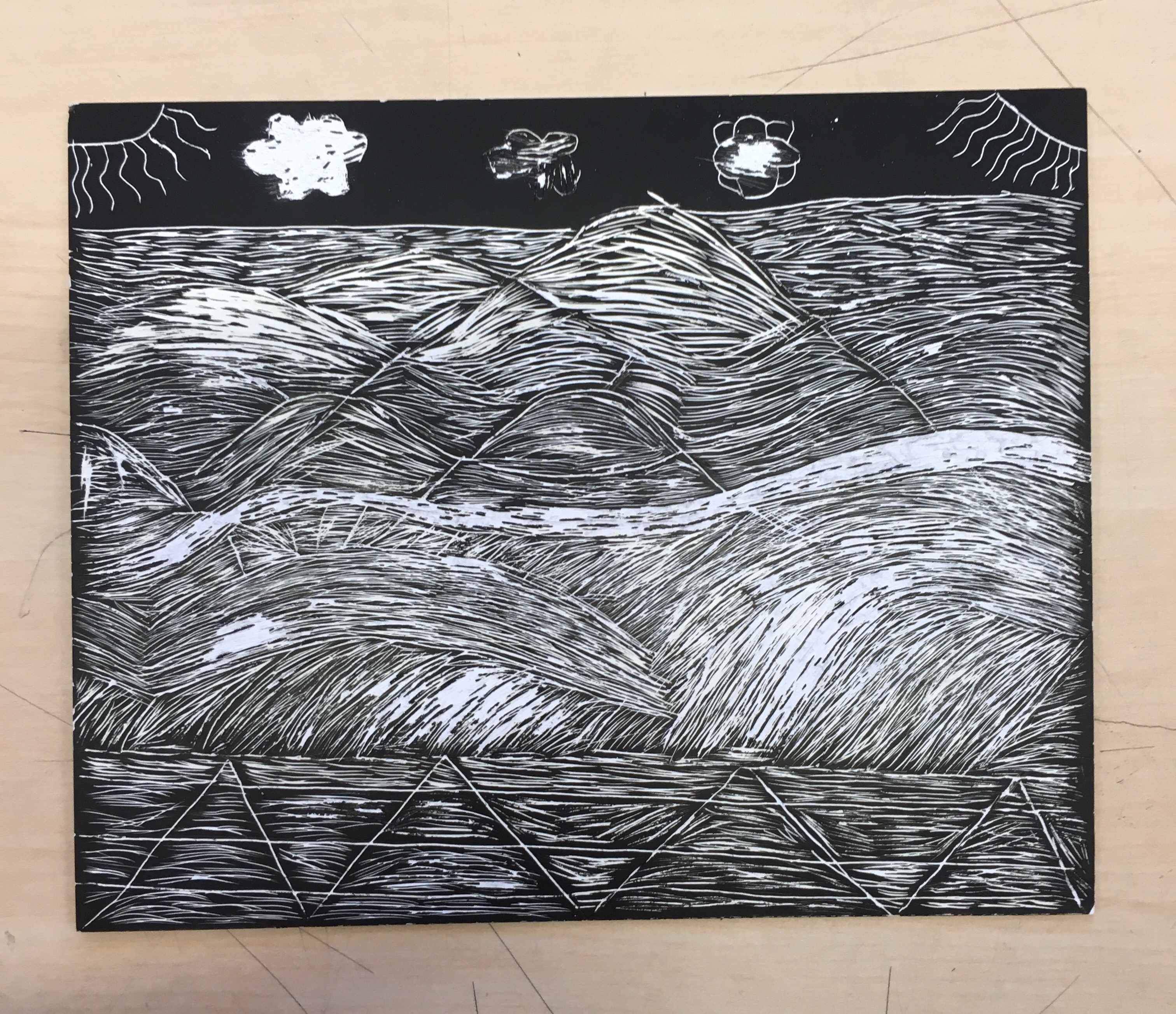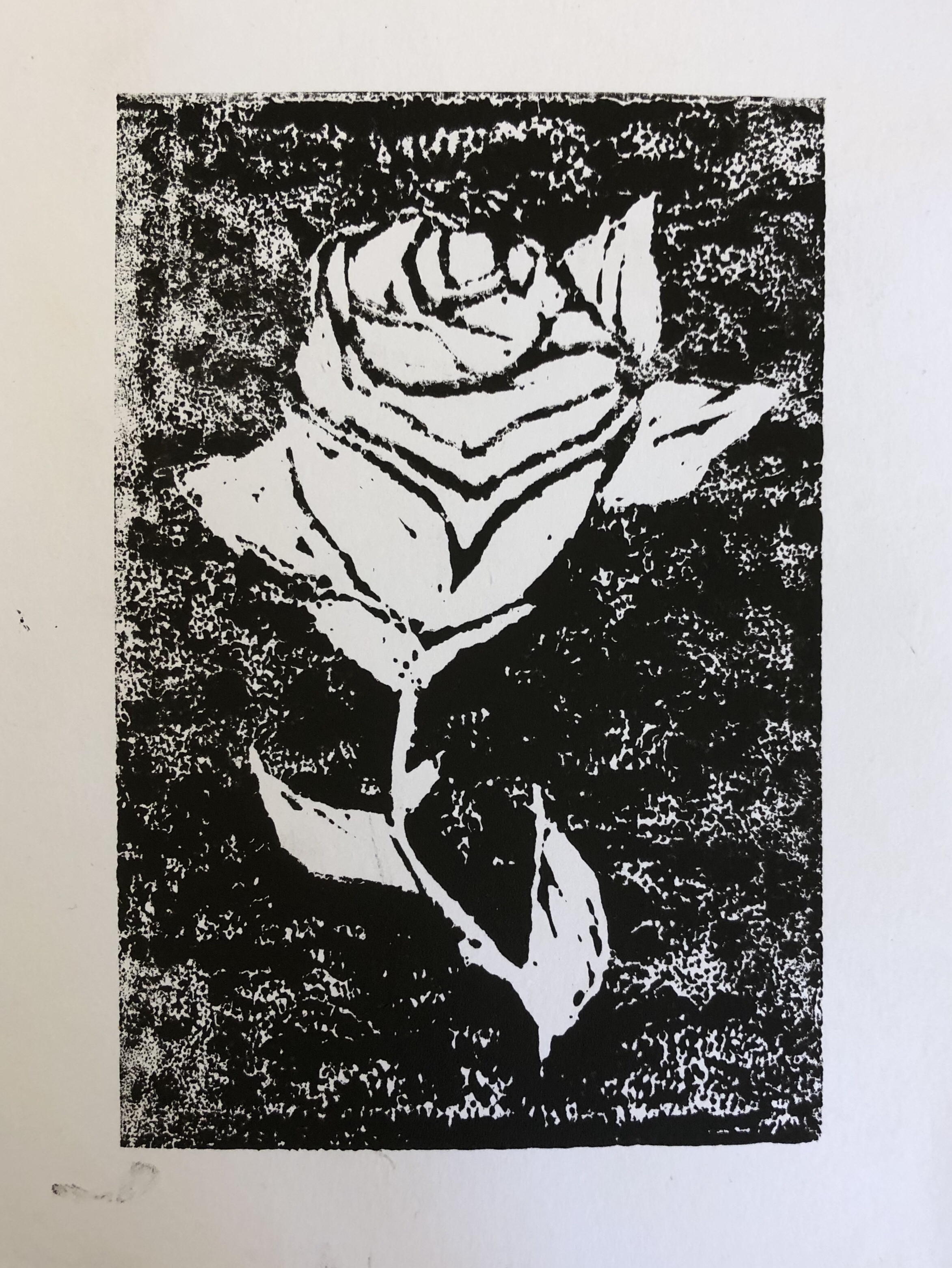 Vi ger oss på en riktig kluring. Att karva i linoleum är inte lätt. Sen ska det valsas på färg och tryckas med lagom mycket färg och lagom mycket tryckkraft.