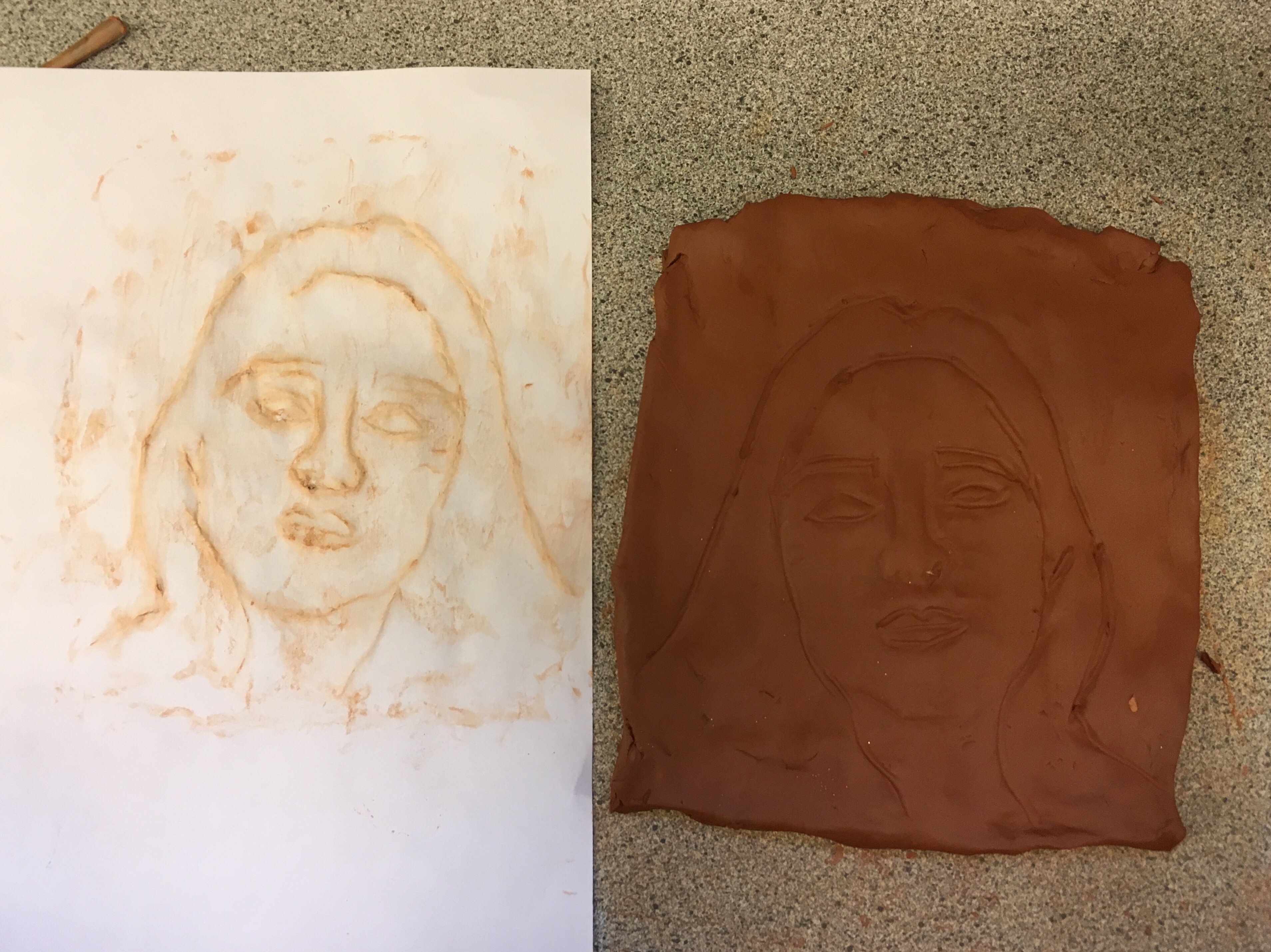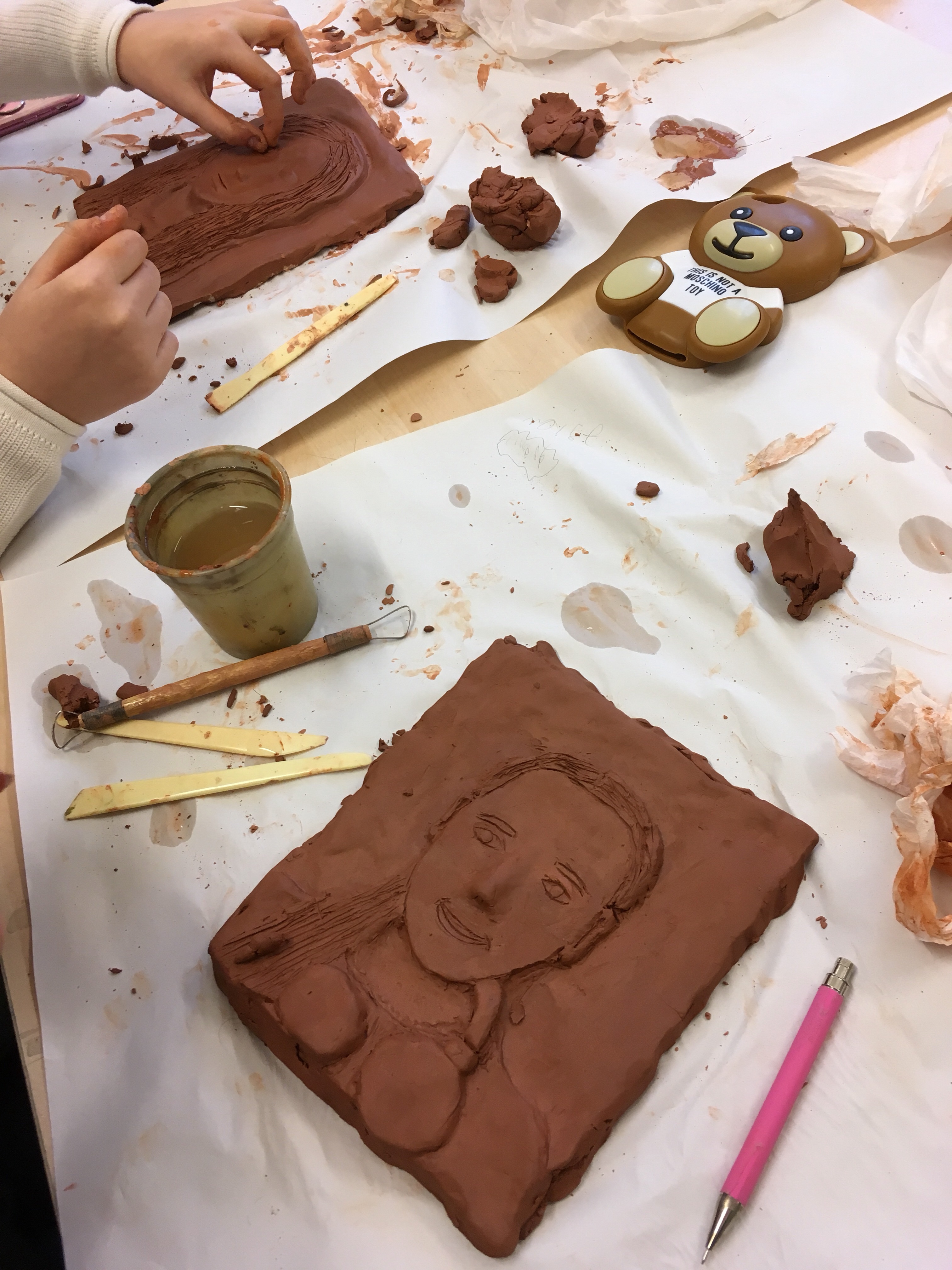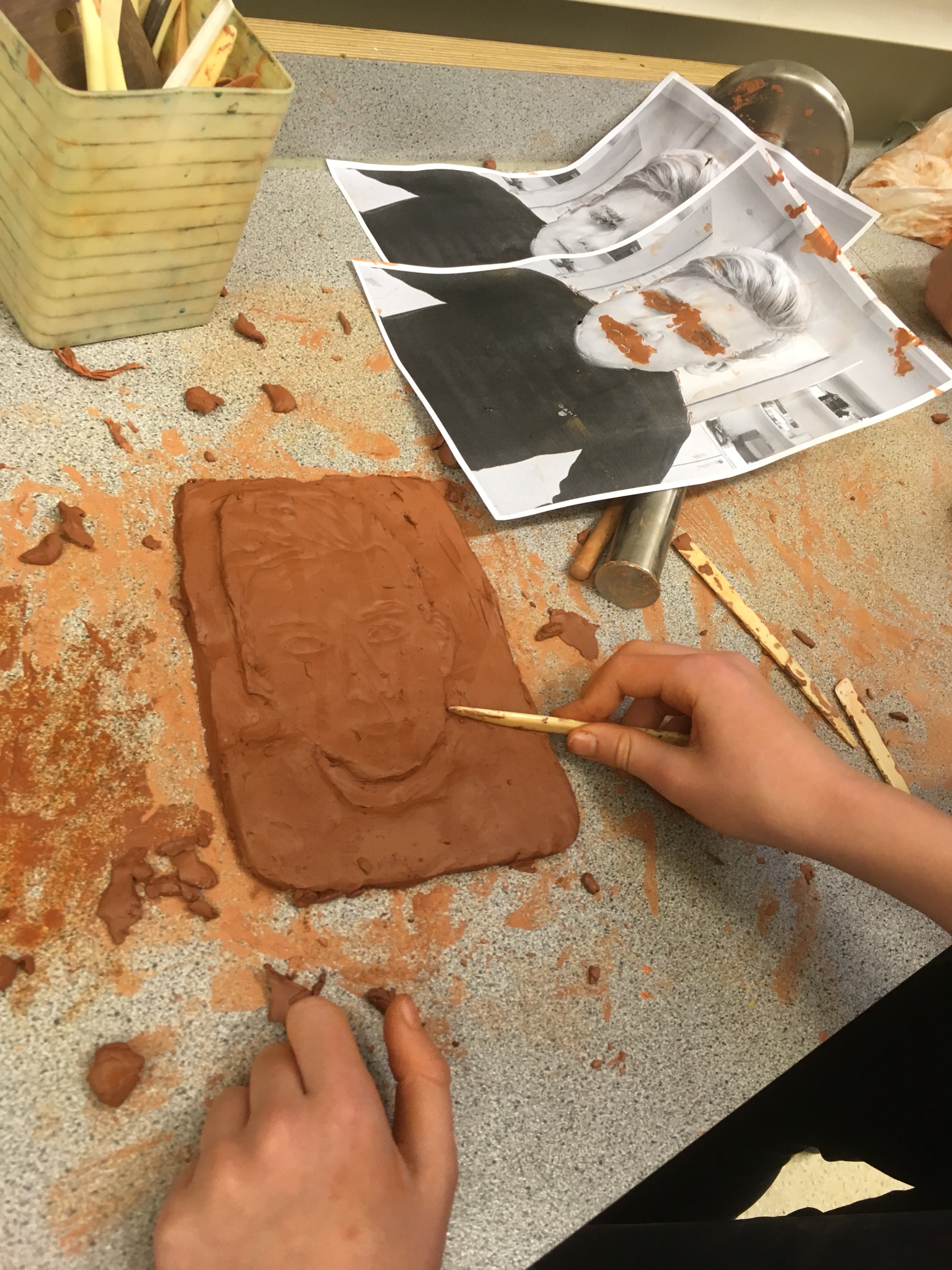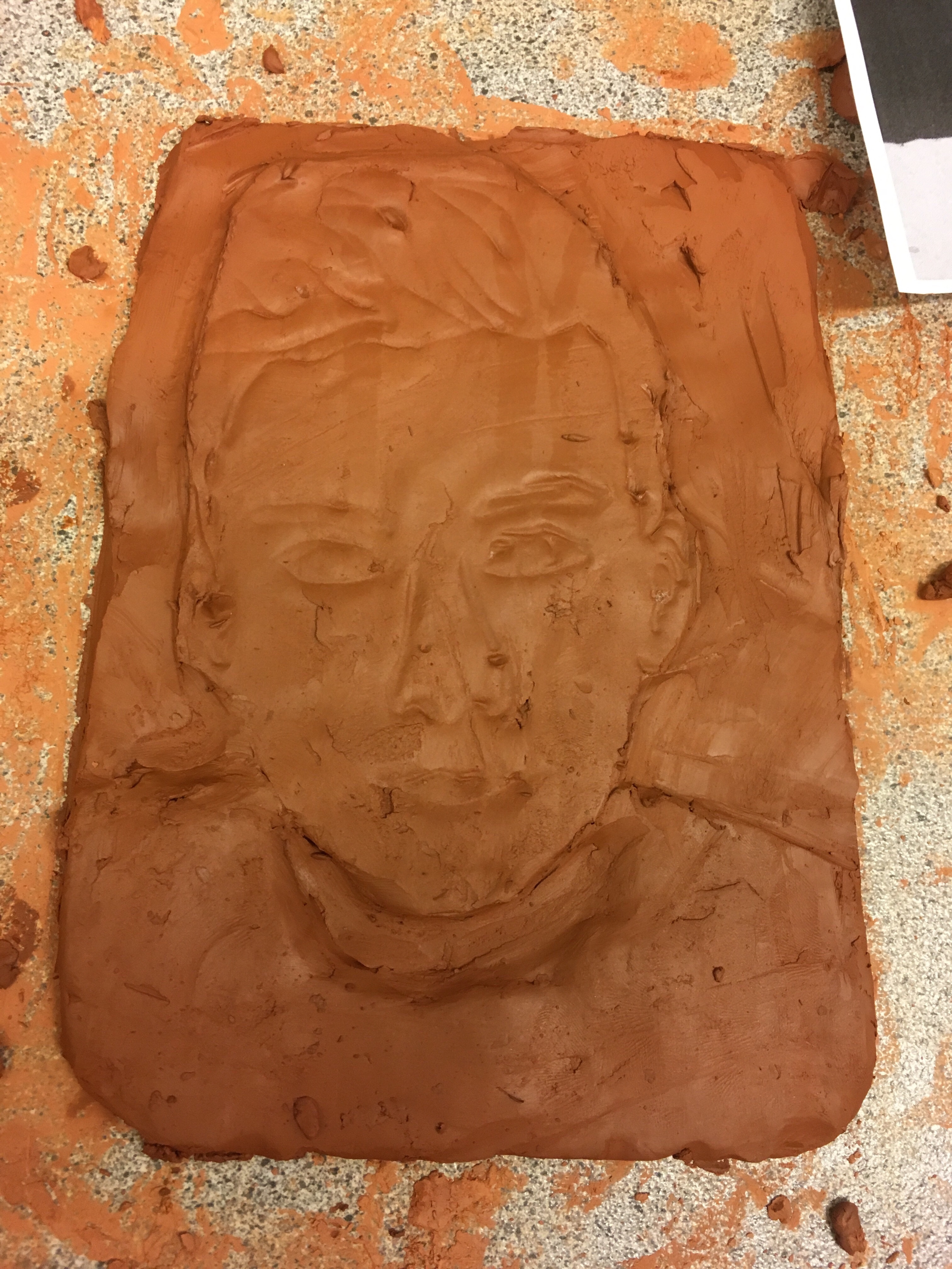 Vi började med att knåda och kavla!Sen fota , skriva ut och placera bilden på leran. Med hjälp av vasst föremål spårade vi konturerna och vips, ett porträtt på leran! Nu återstår att bygga upp ansiktet och jobba på relieferna!