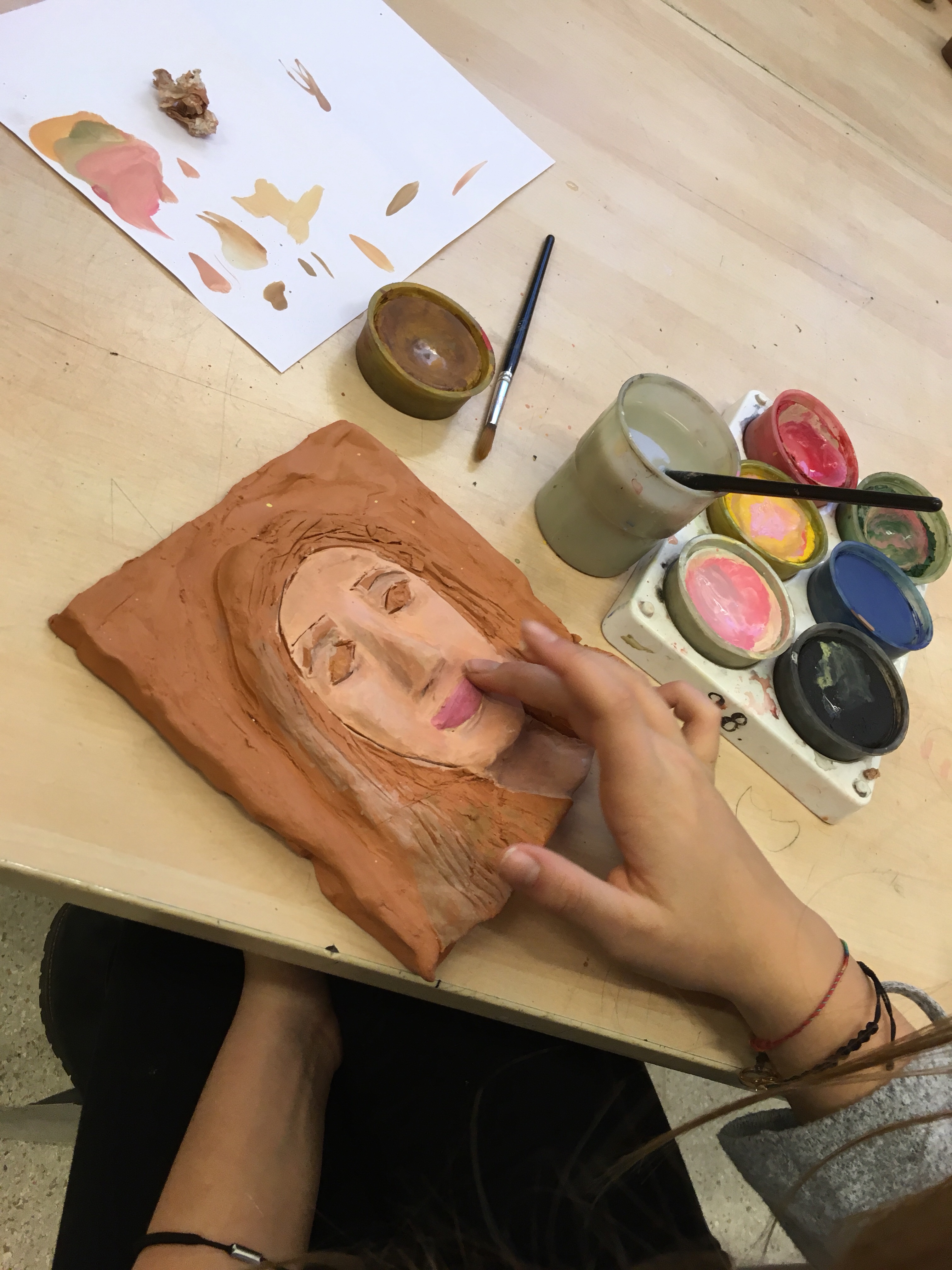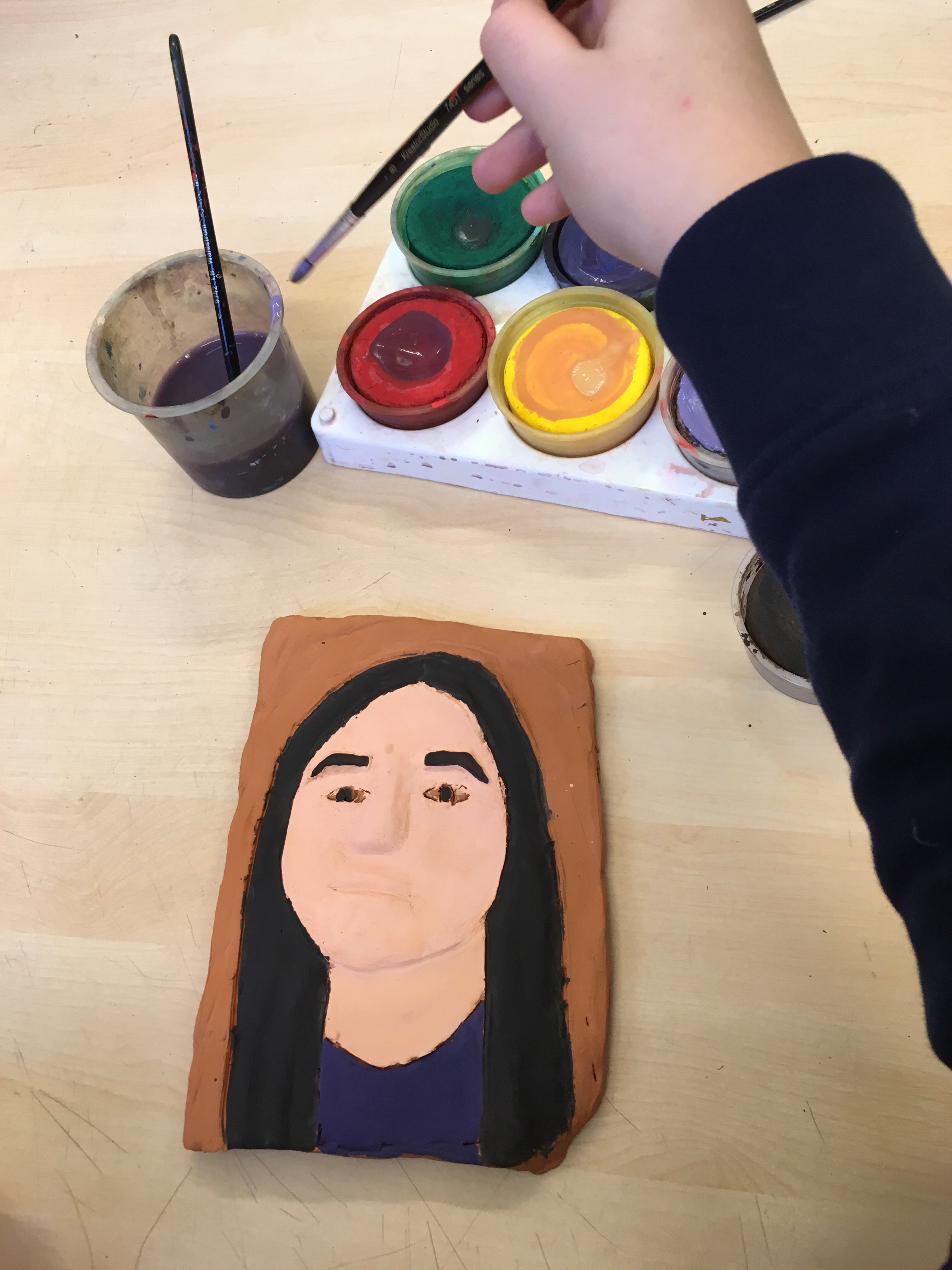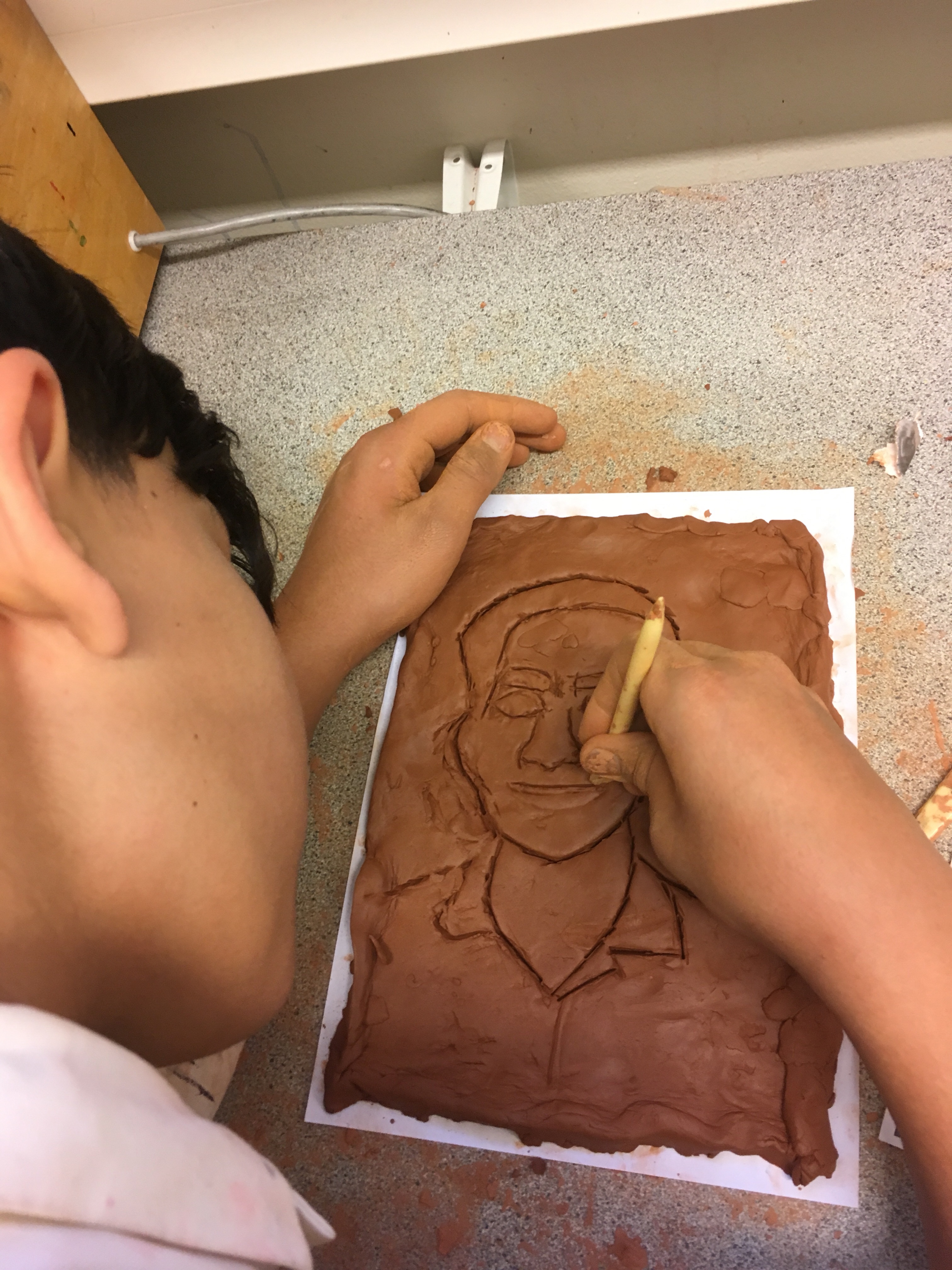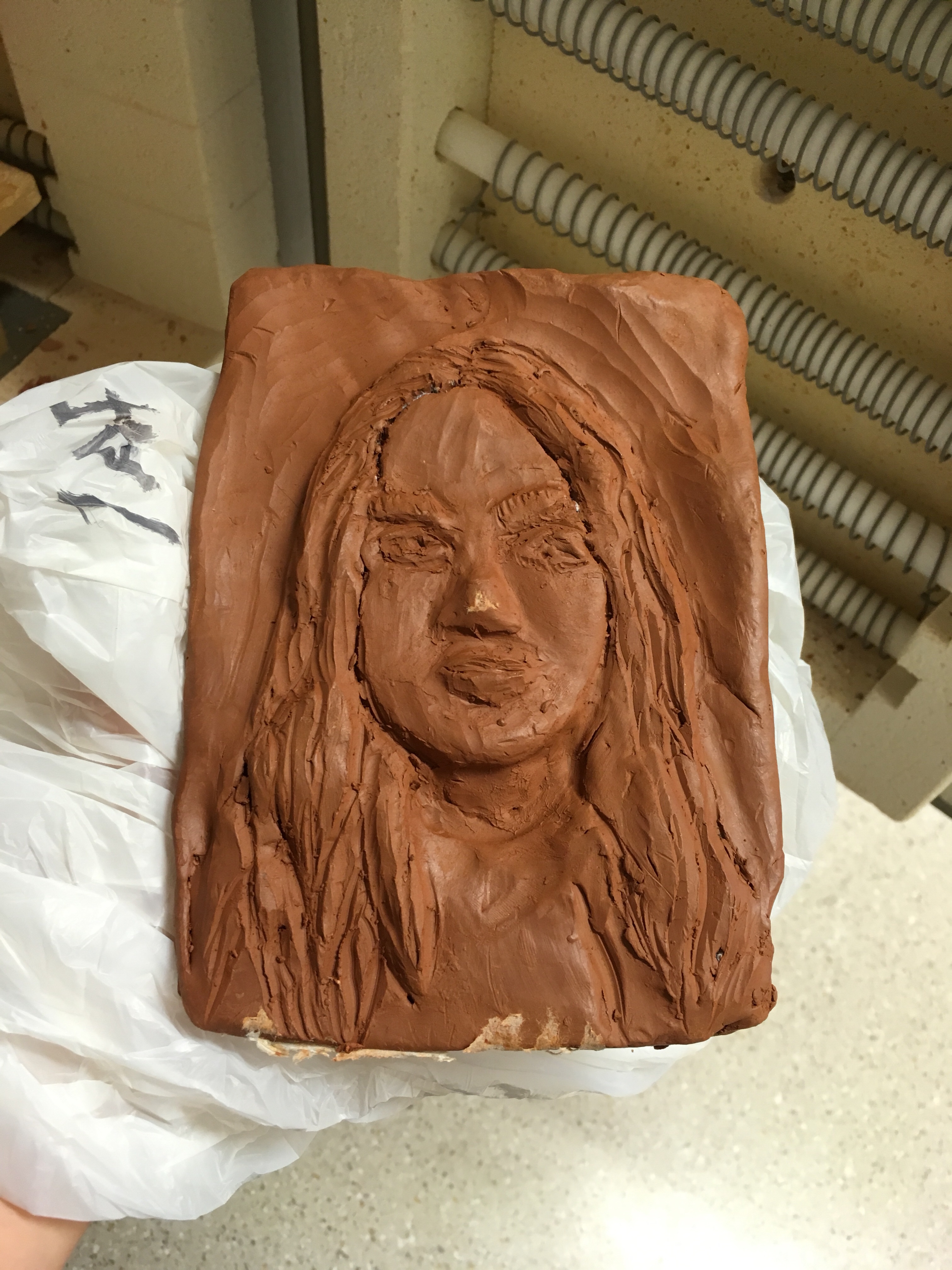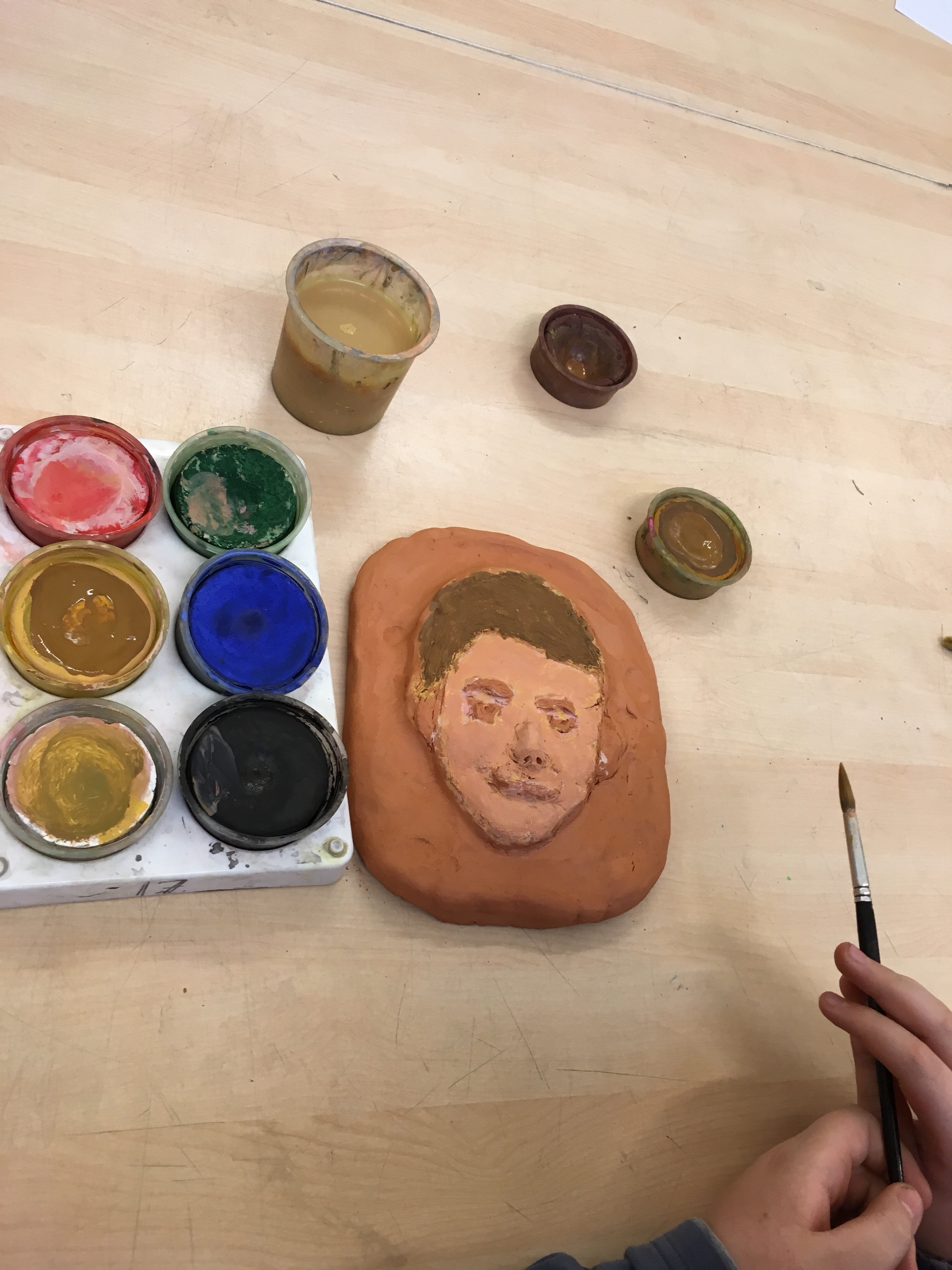 Vi började med att knåda och kavla!Sen fota , skriva ut och placera bilden på leran. Med hjälp av vasst föremål spårade vi konturerna och vips, ett porträtt på leran! Nu återstår att bygga upp ansiktet och jobba på relieferna!