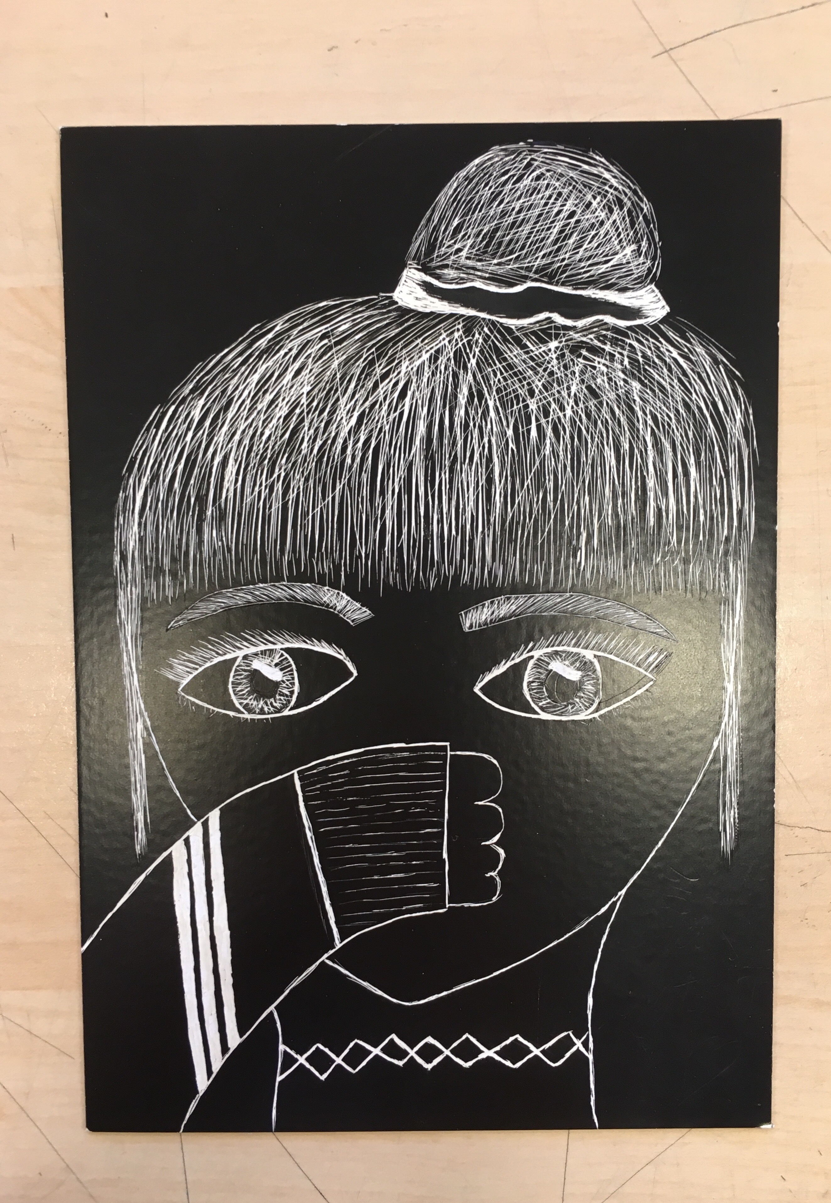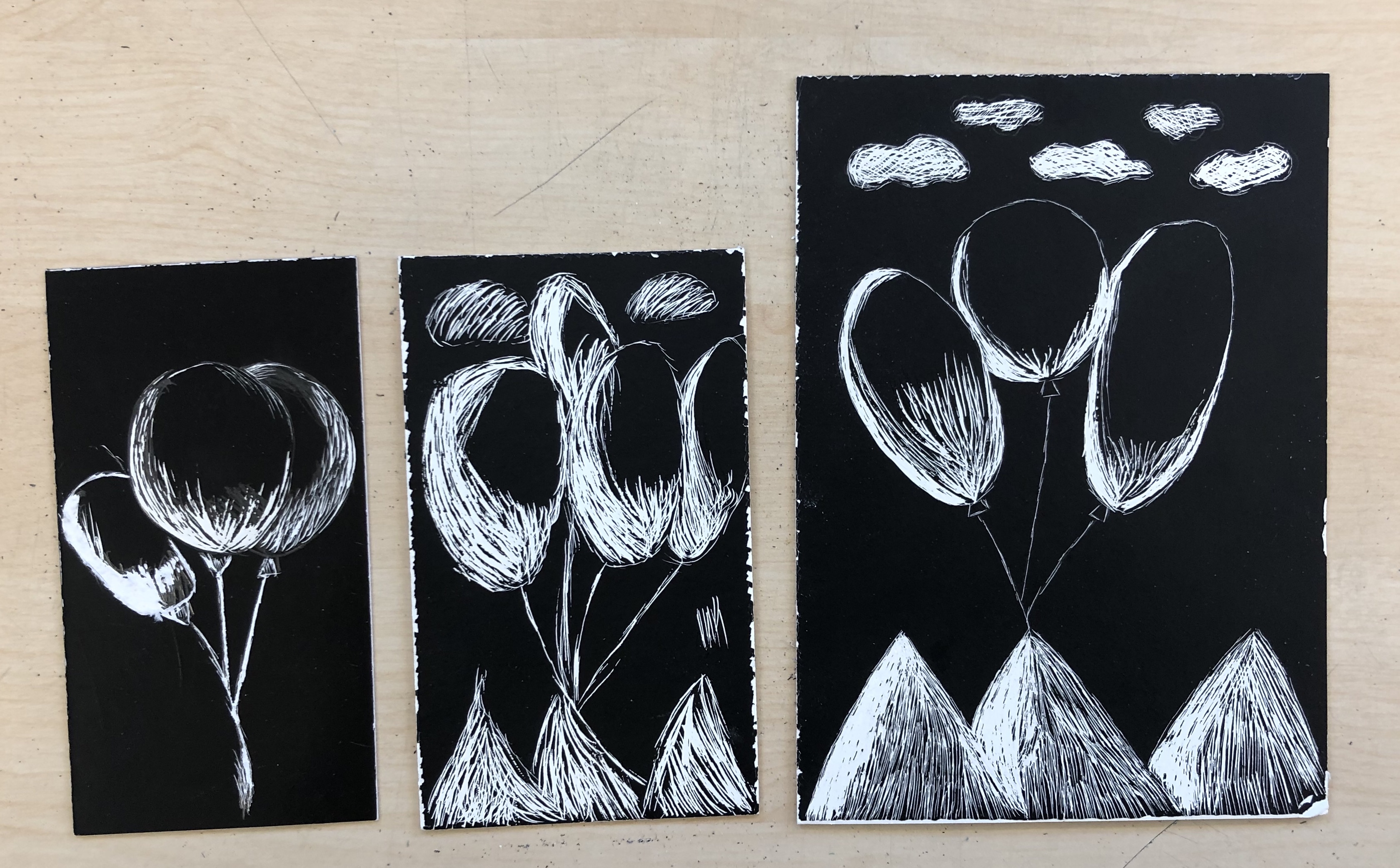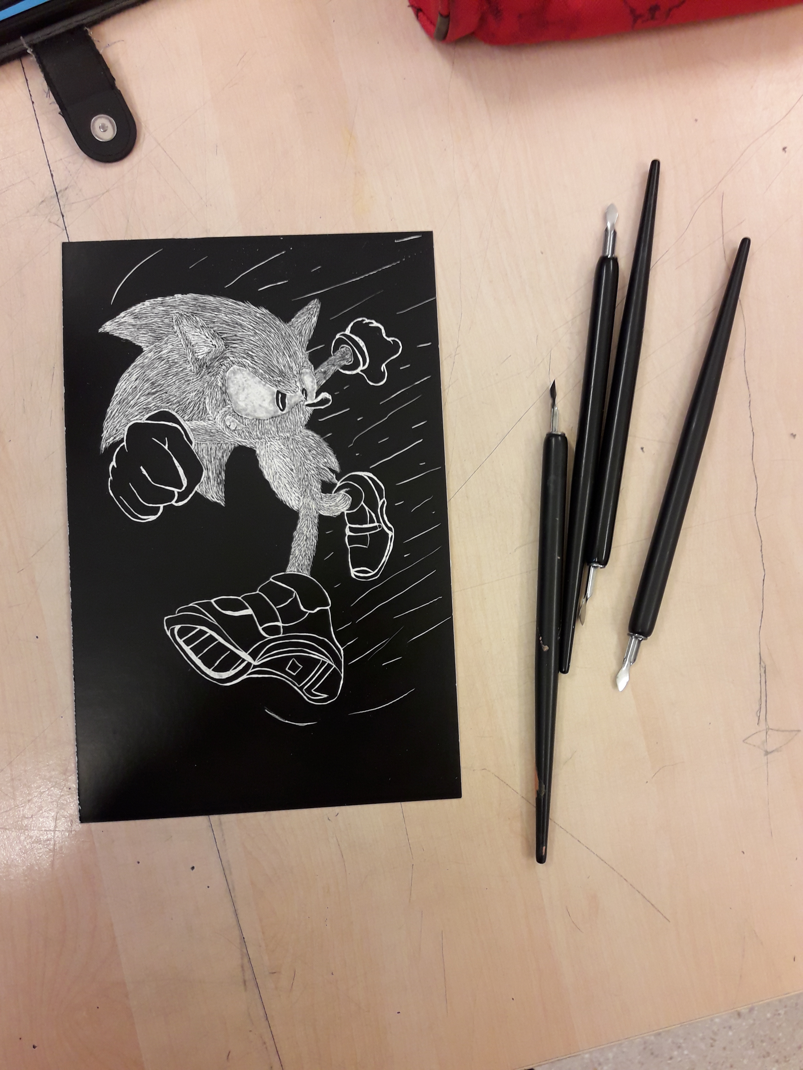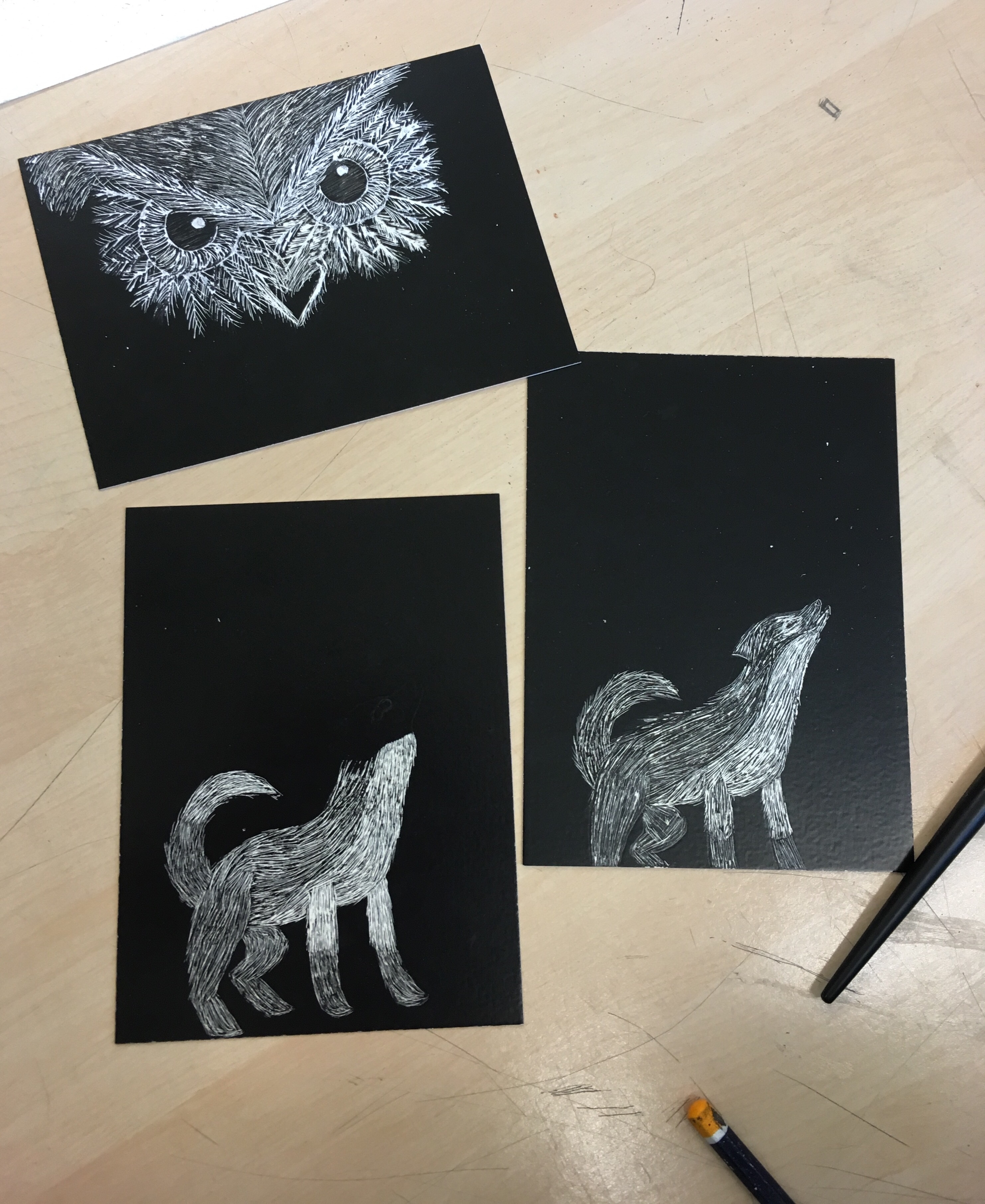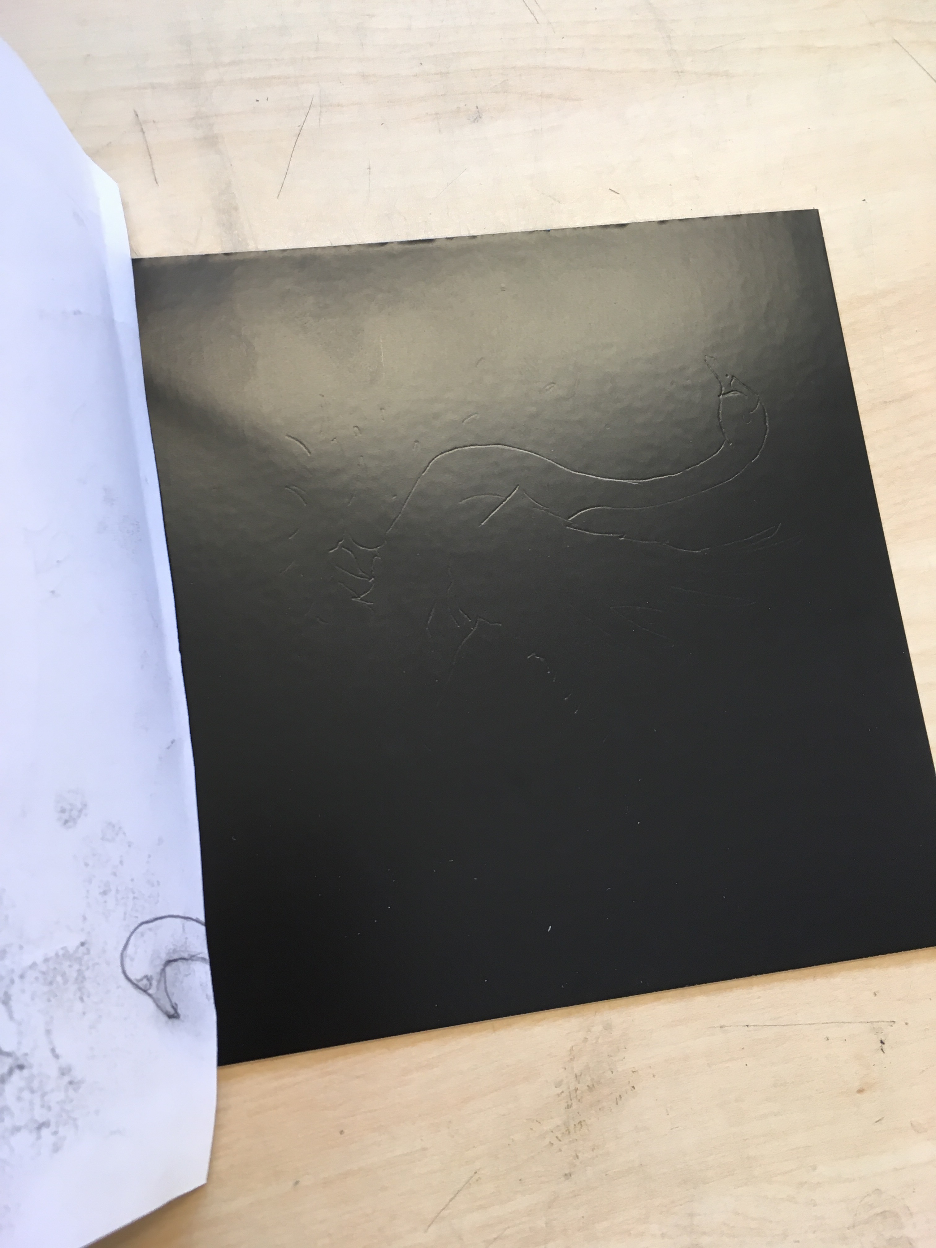 Så här kan det se ut när man spårat sina linjer på skisspappret. Det blir avtryck/spår i skrapkartongen.