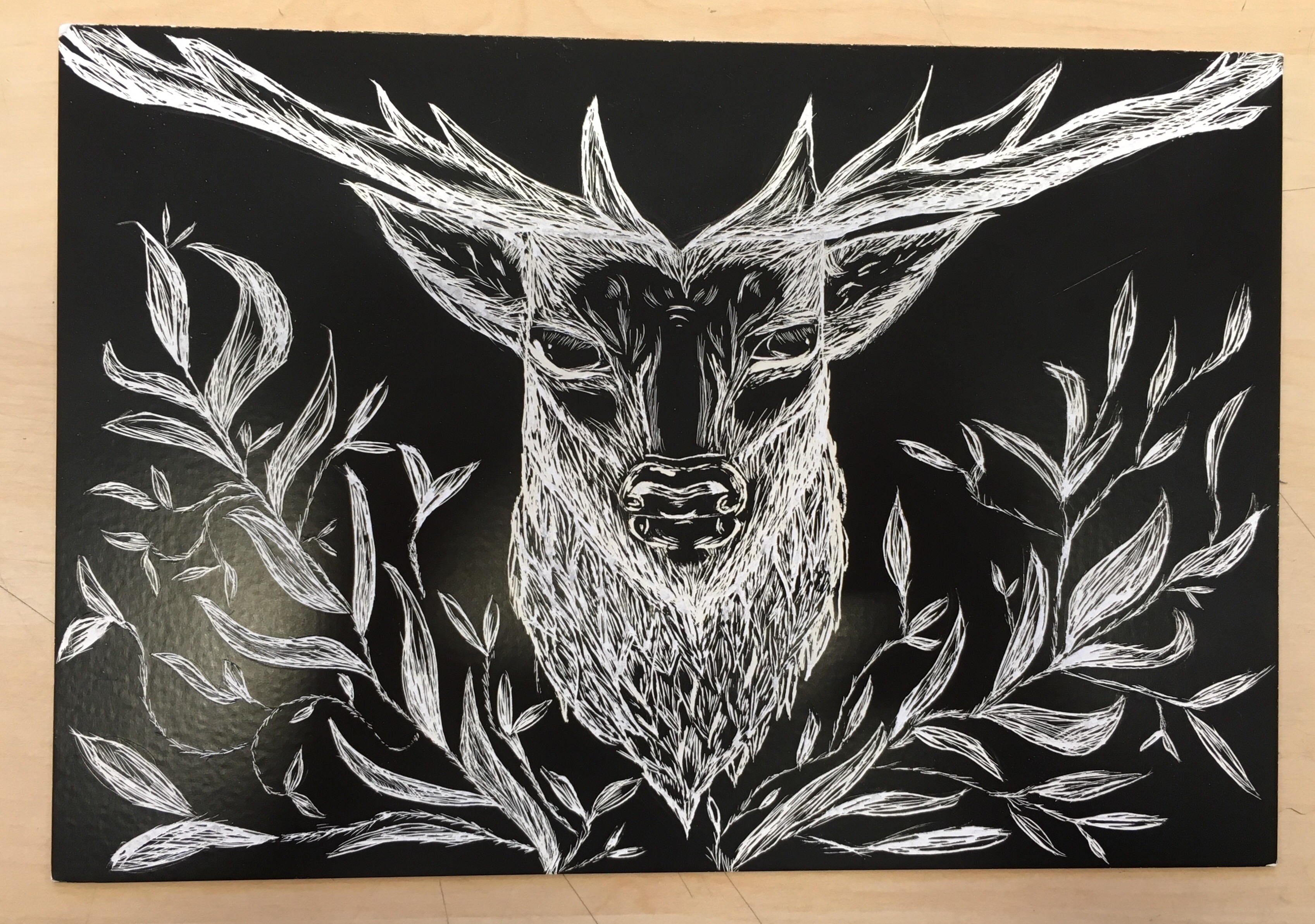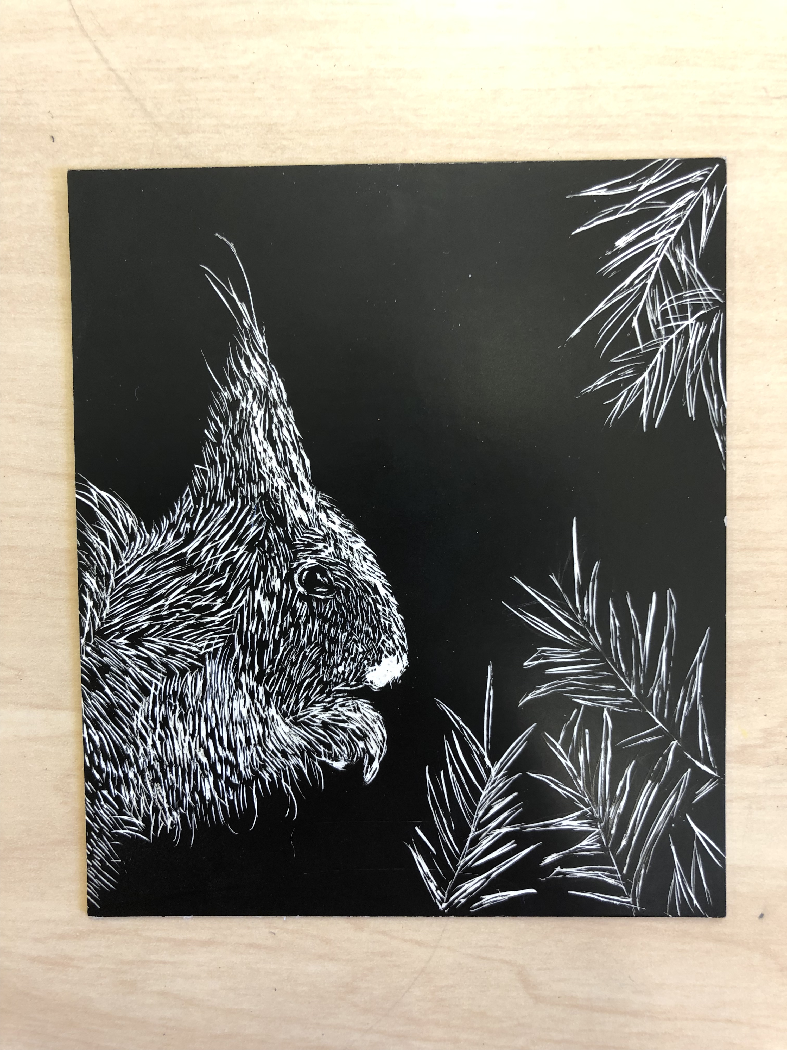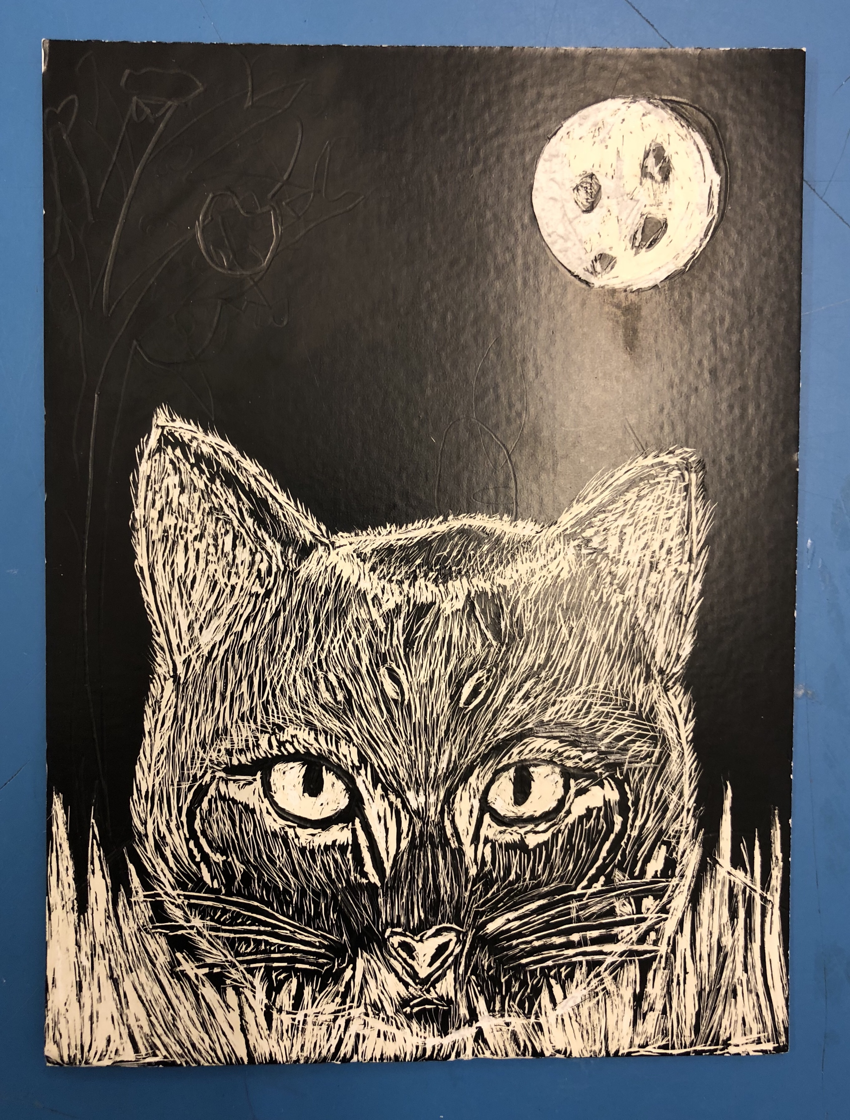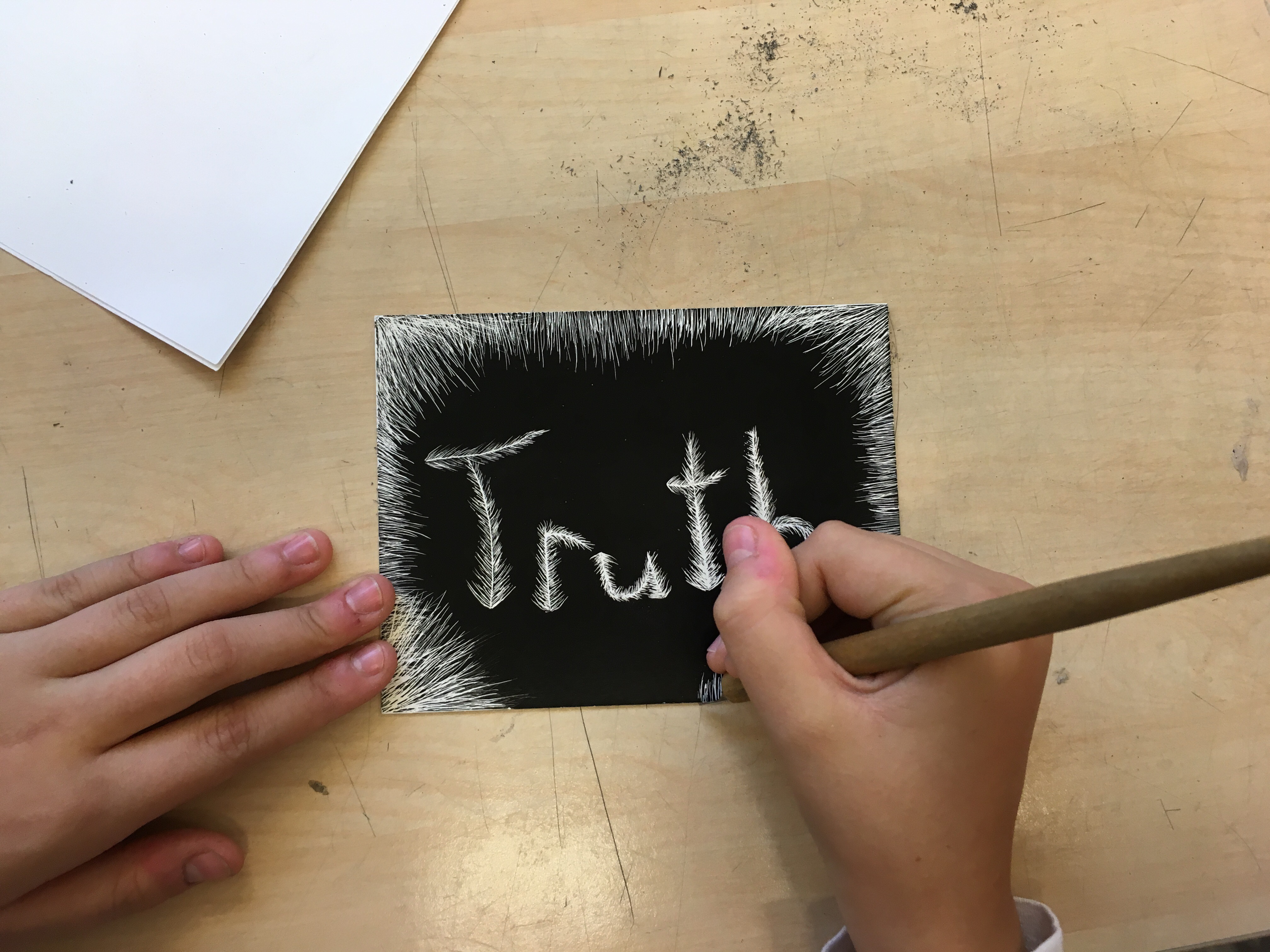 Så här kan det se ut när man spårat sina linjer på skisspappret. Det blir avtryck/spår i skrapkartongen.