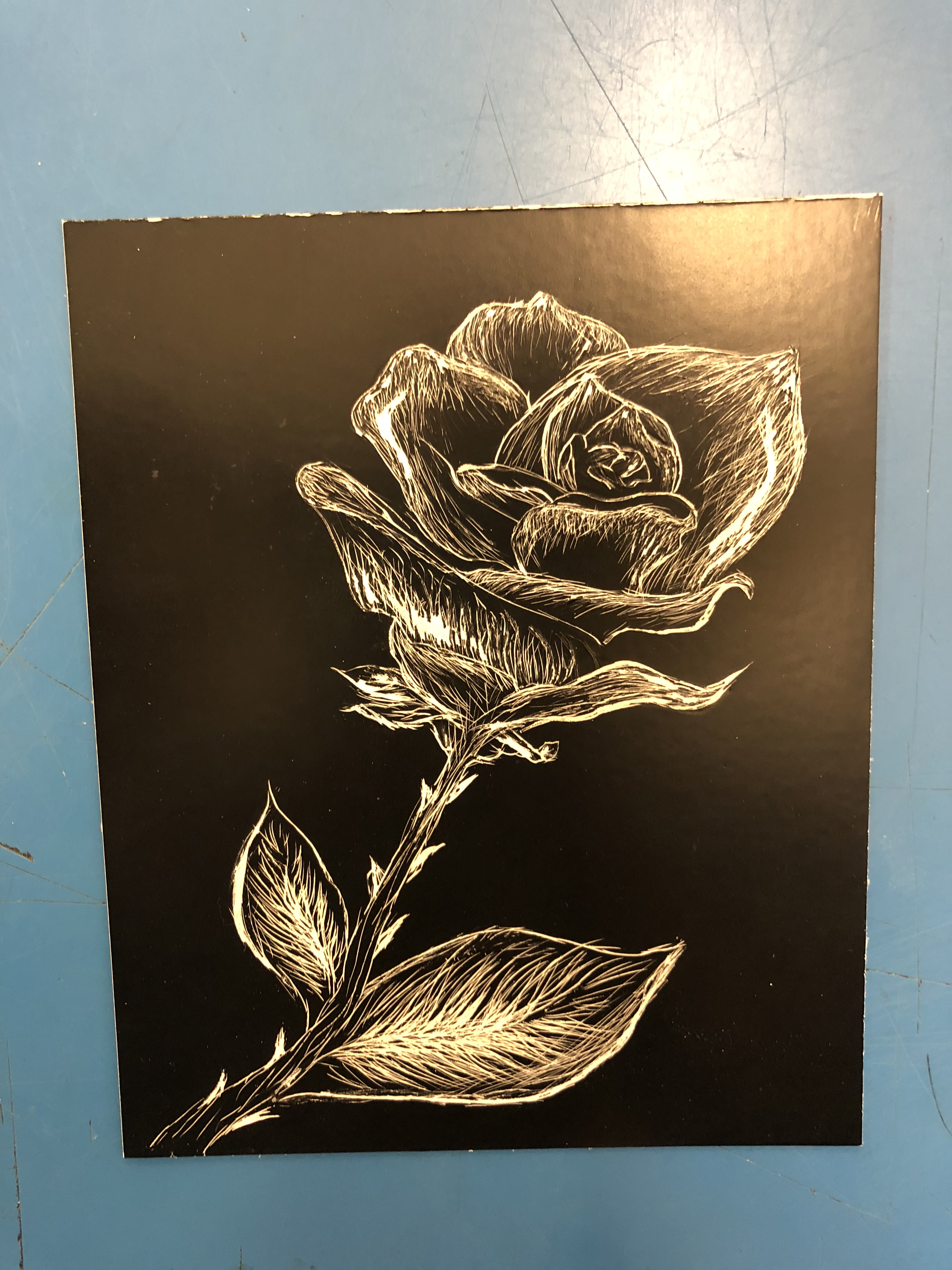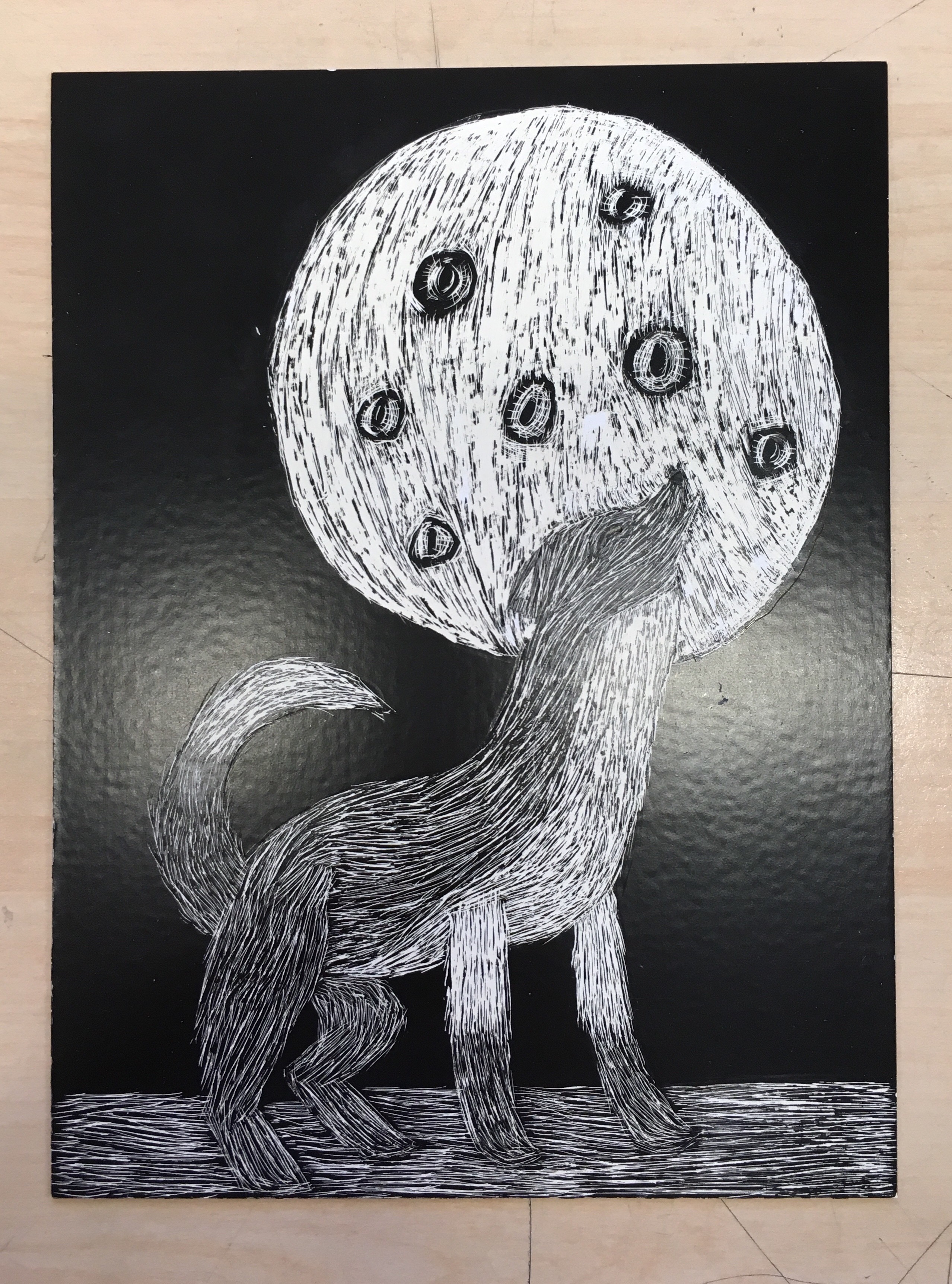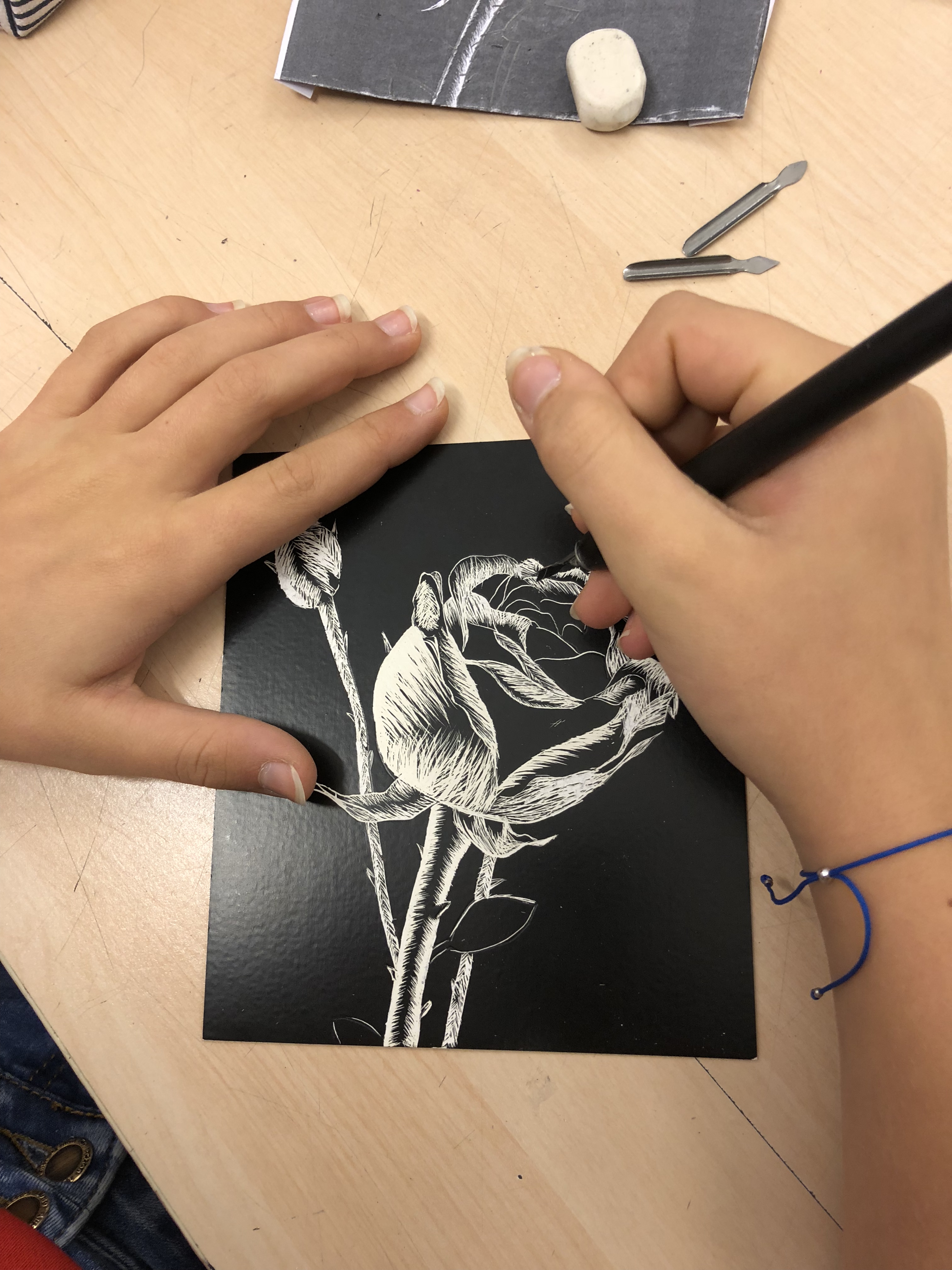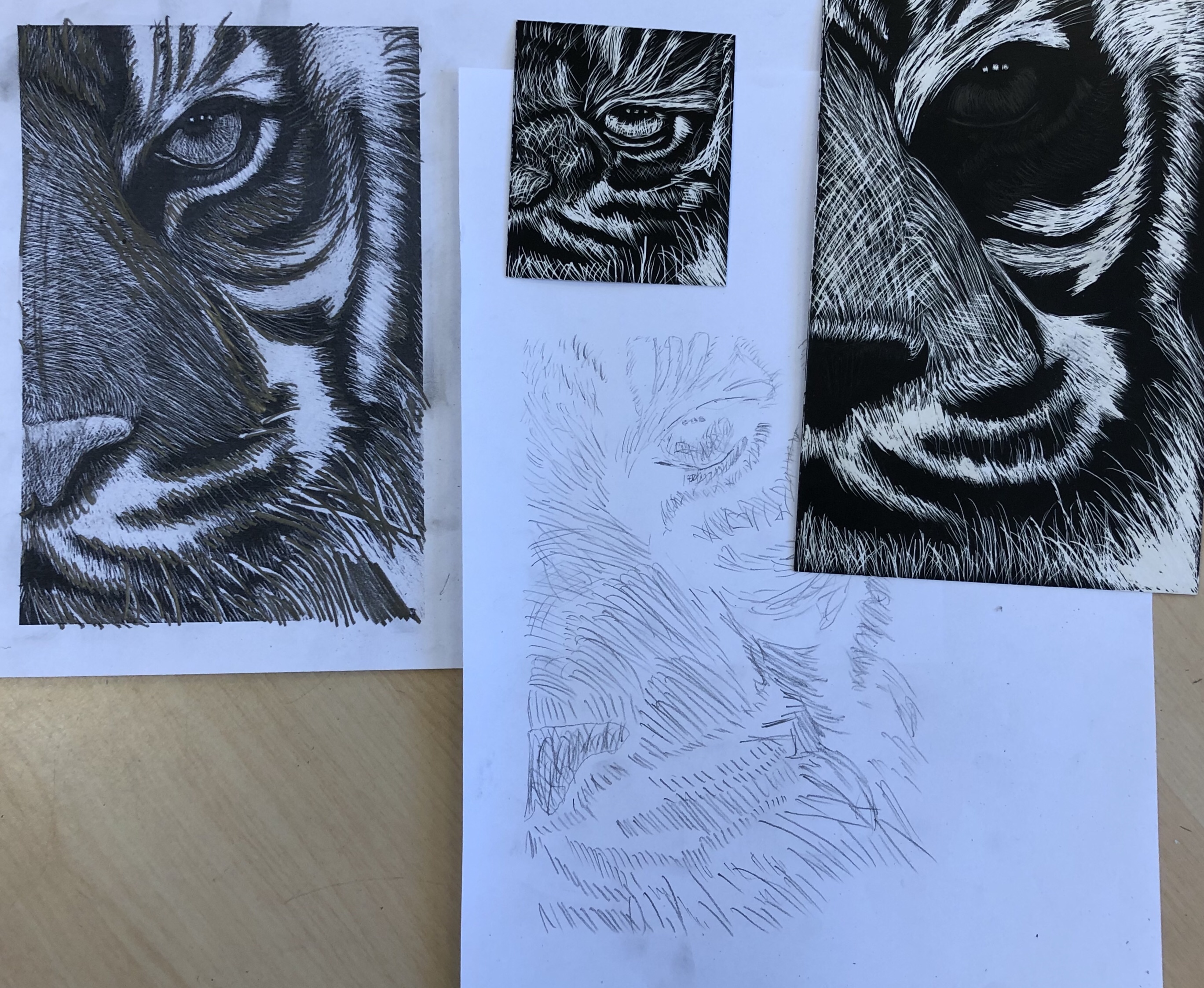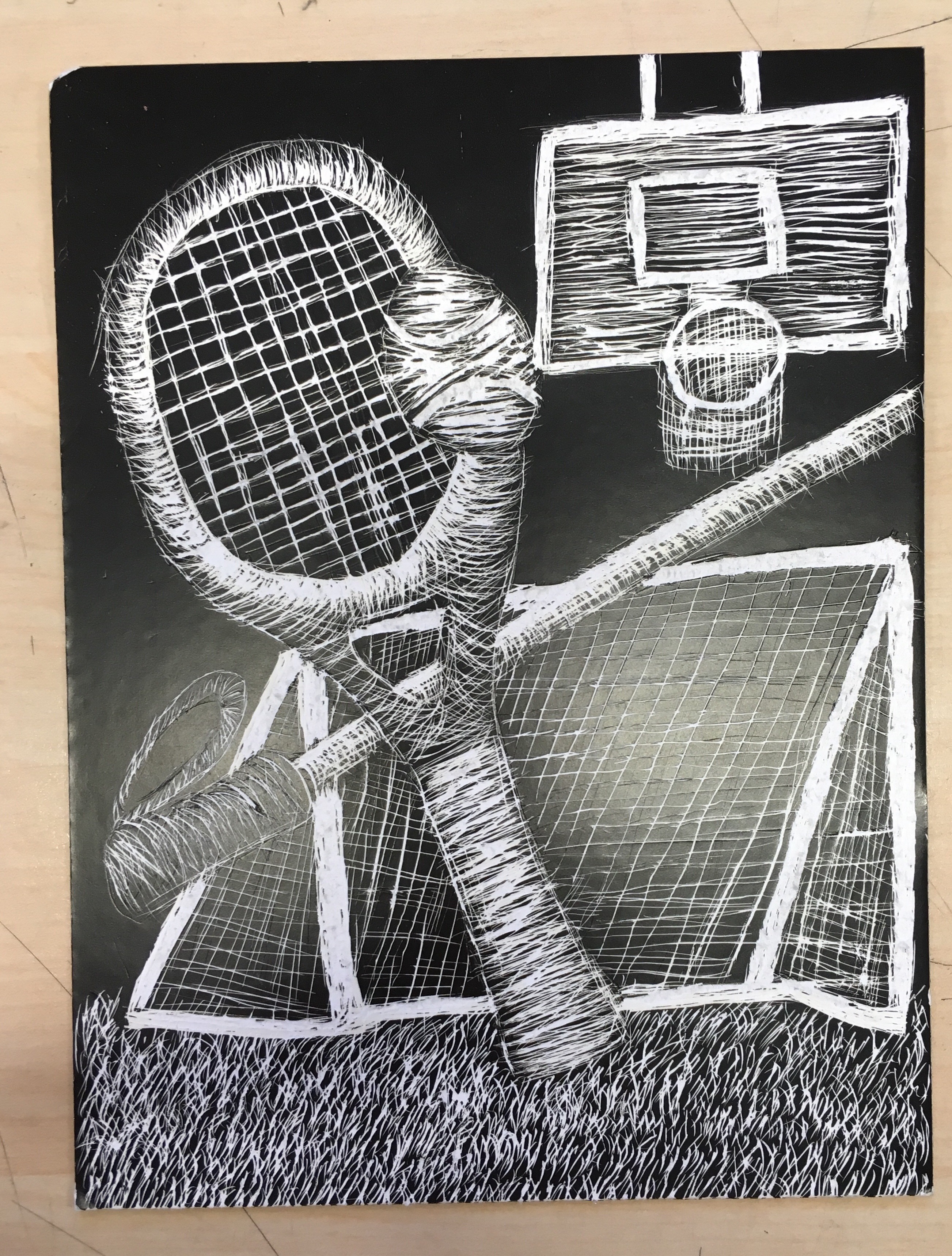Så här kan det se ut när man spårat sina linjer på skisspappret. Det blir avtryck/spår i skrapkartongen.