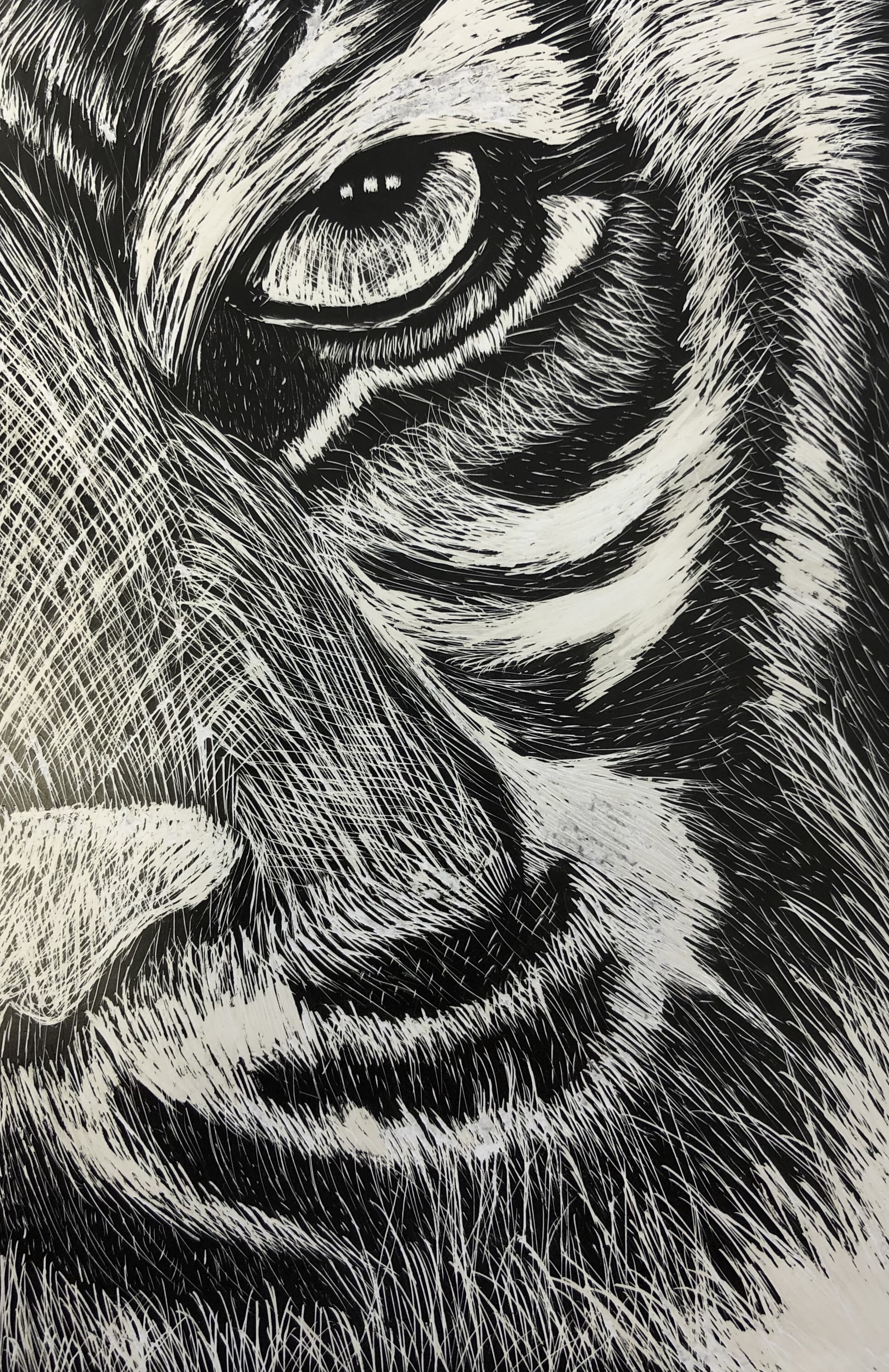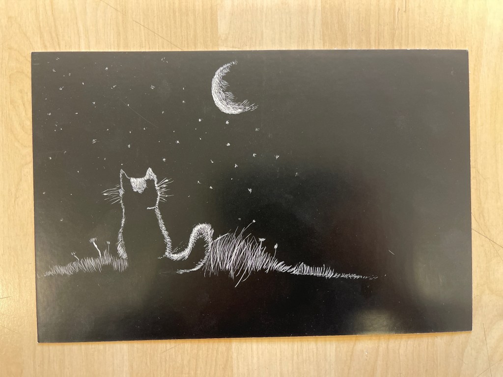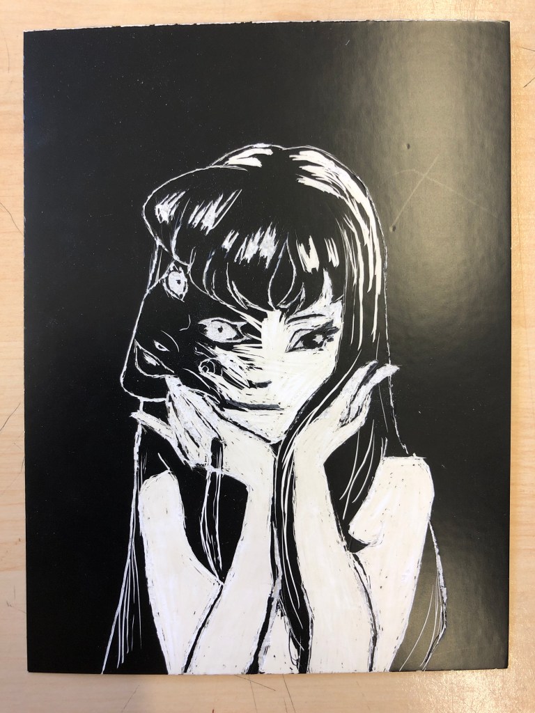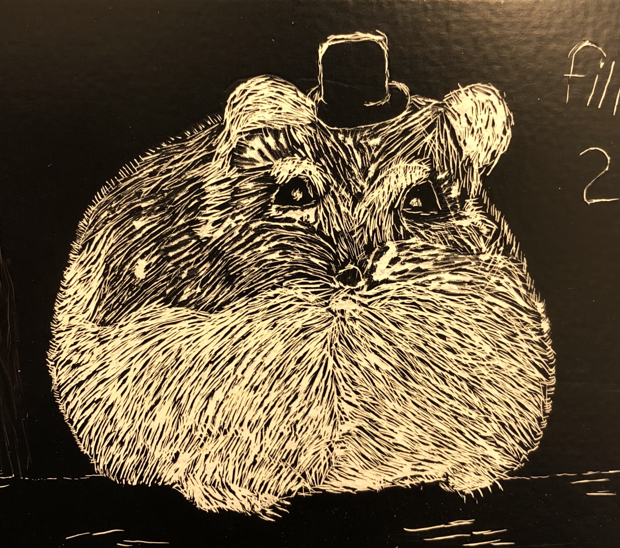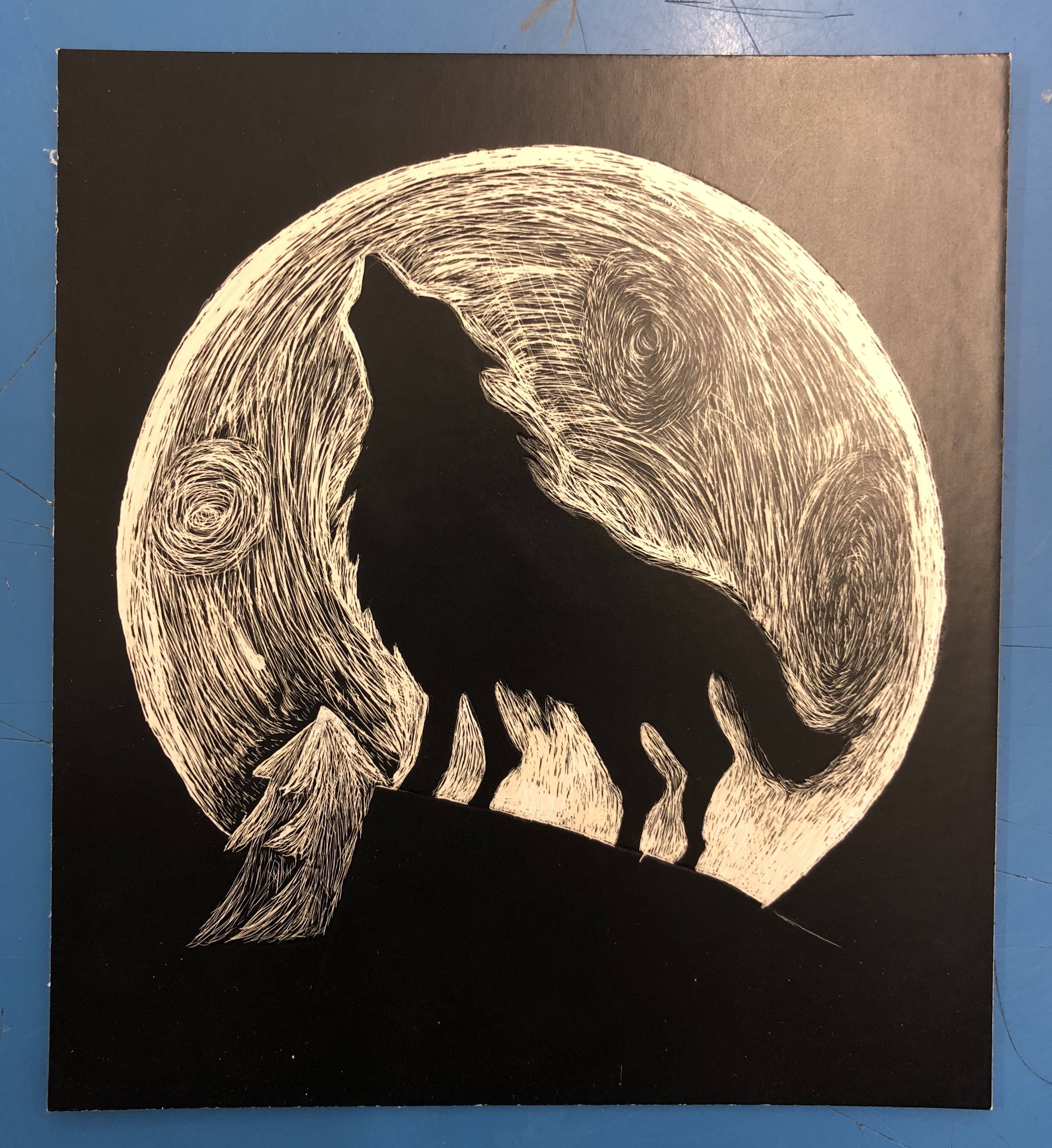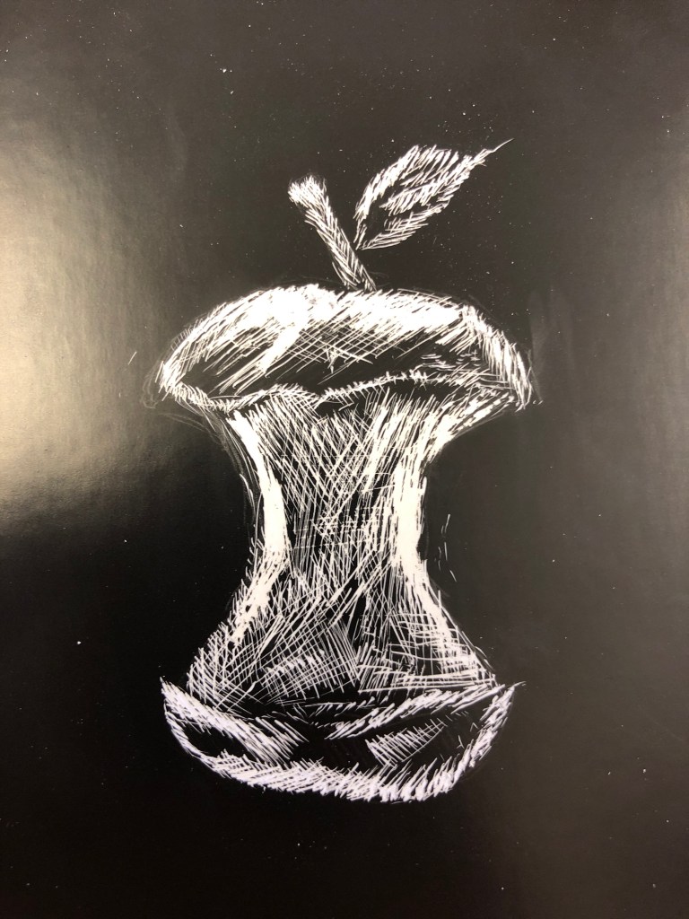 Så här kan det se ut när man spårat sina linjer på skisspappret. Det blir avtryck/spår i skrapkartongen.