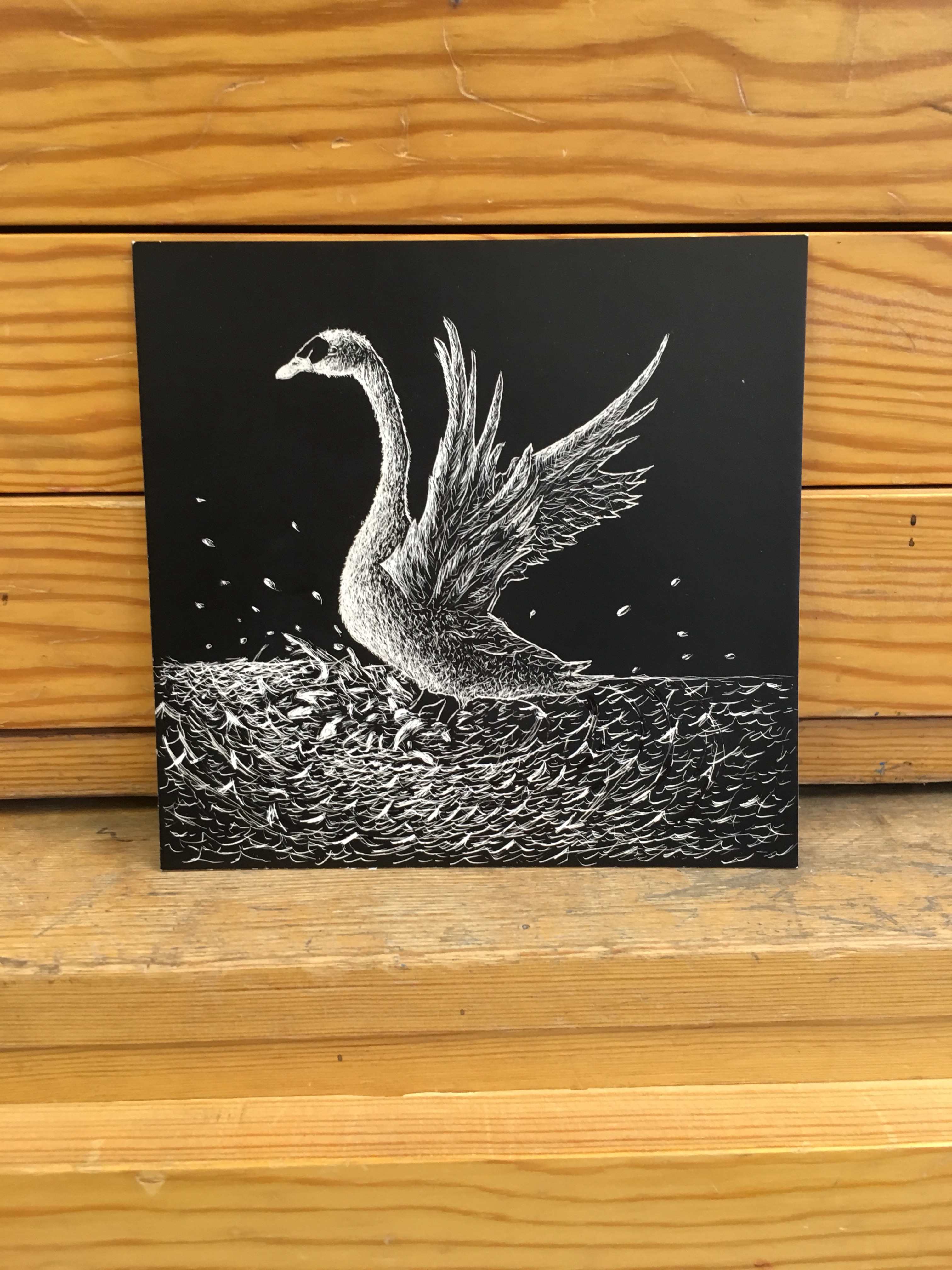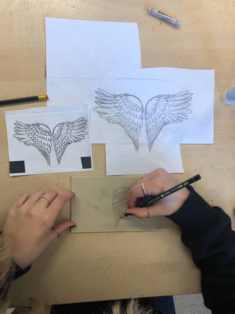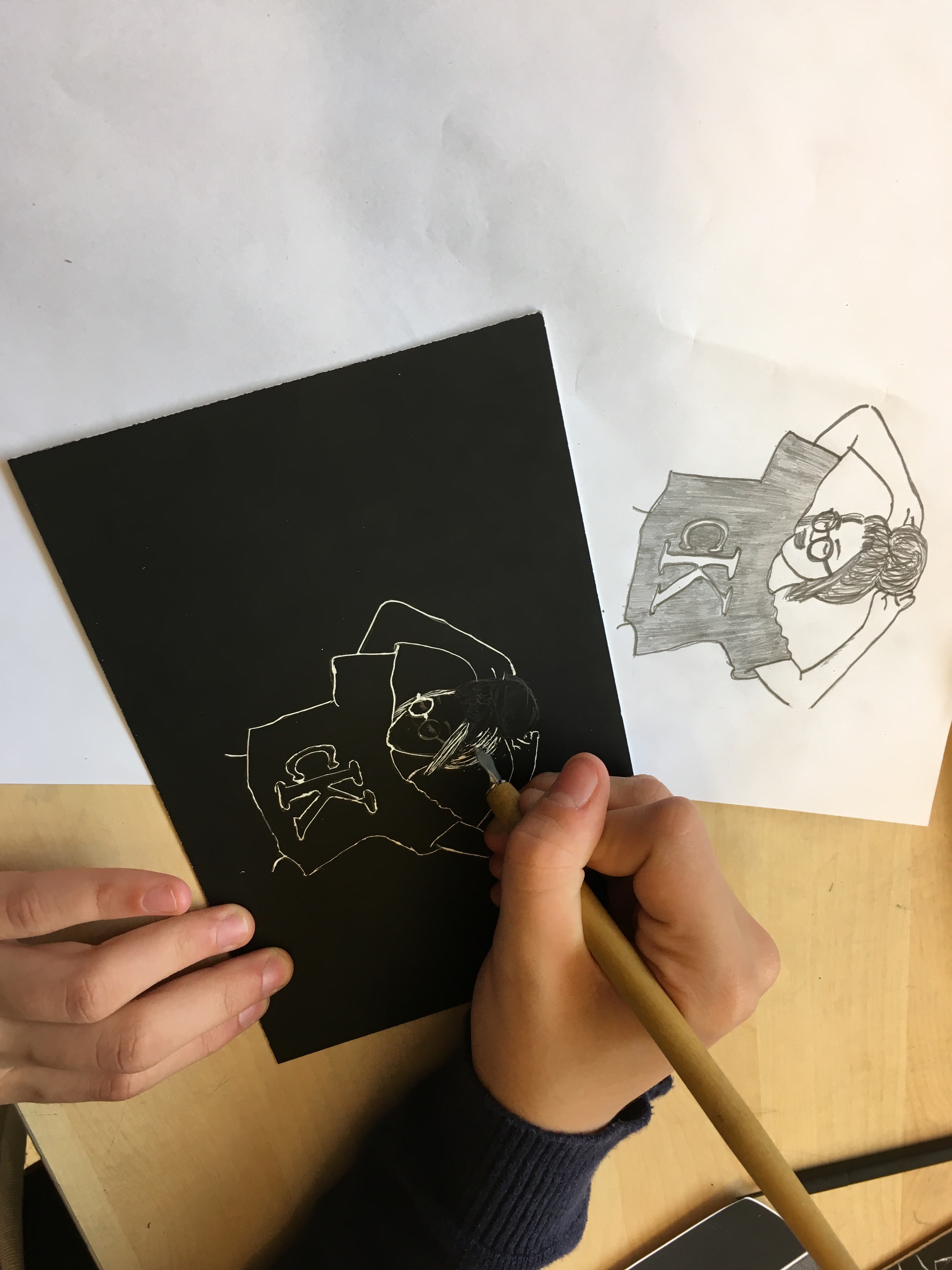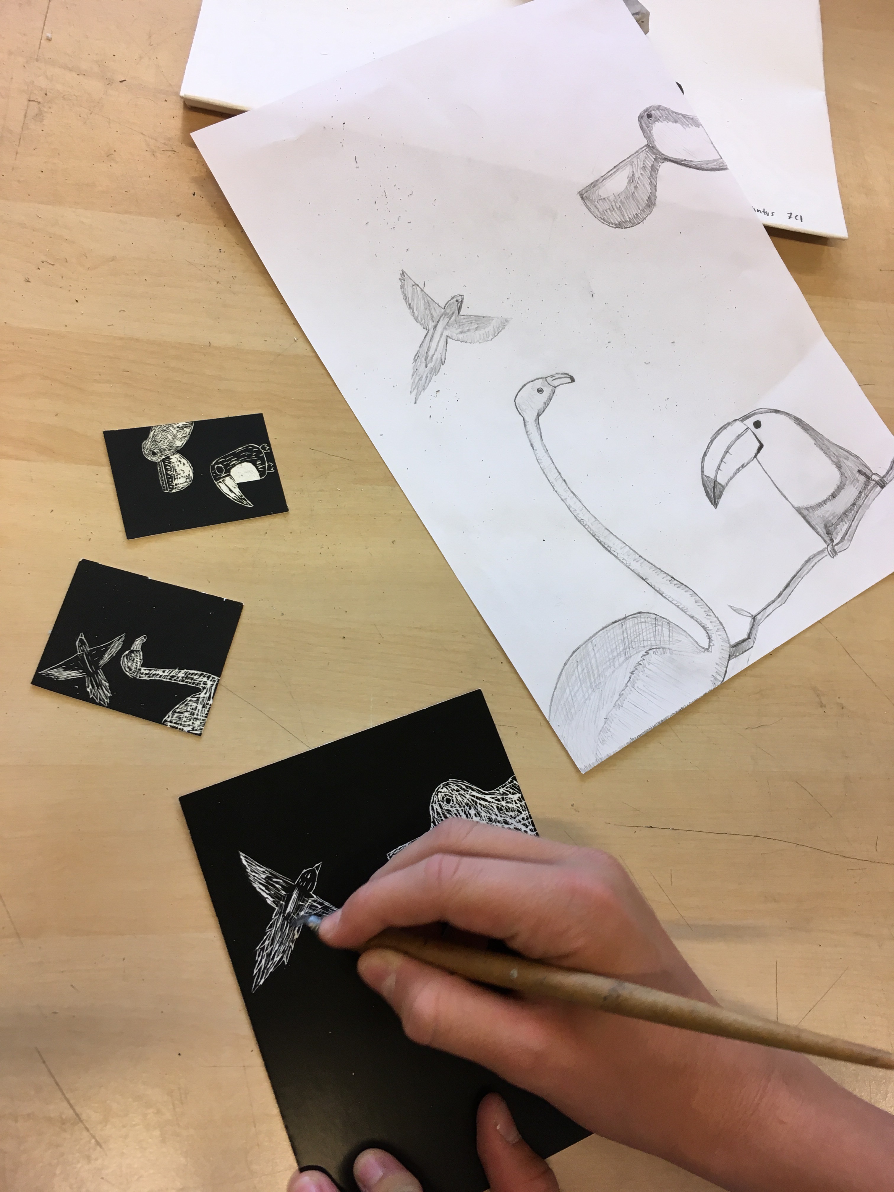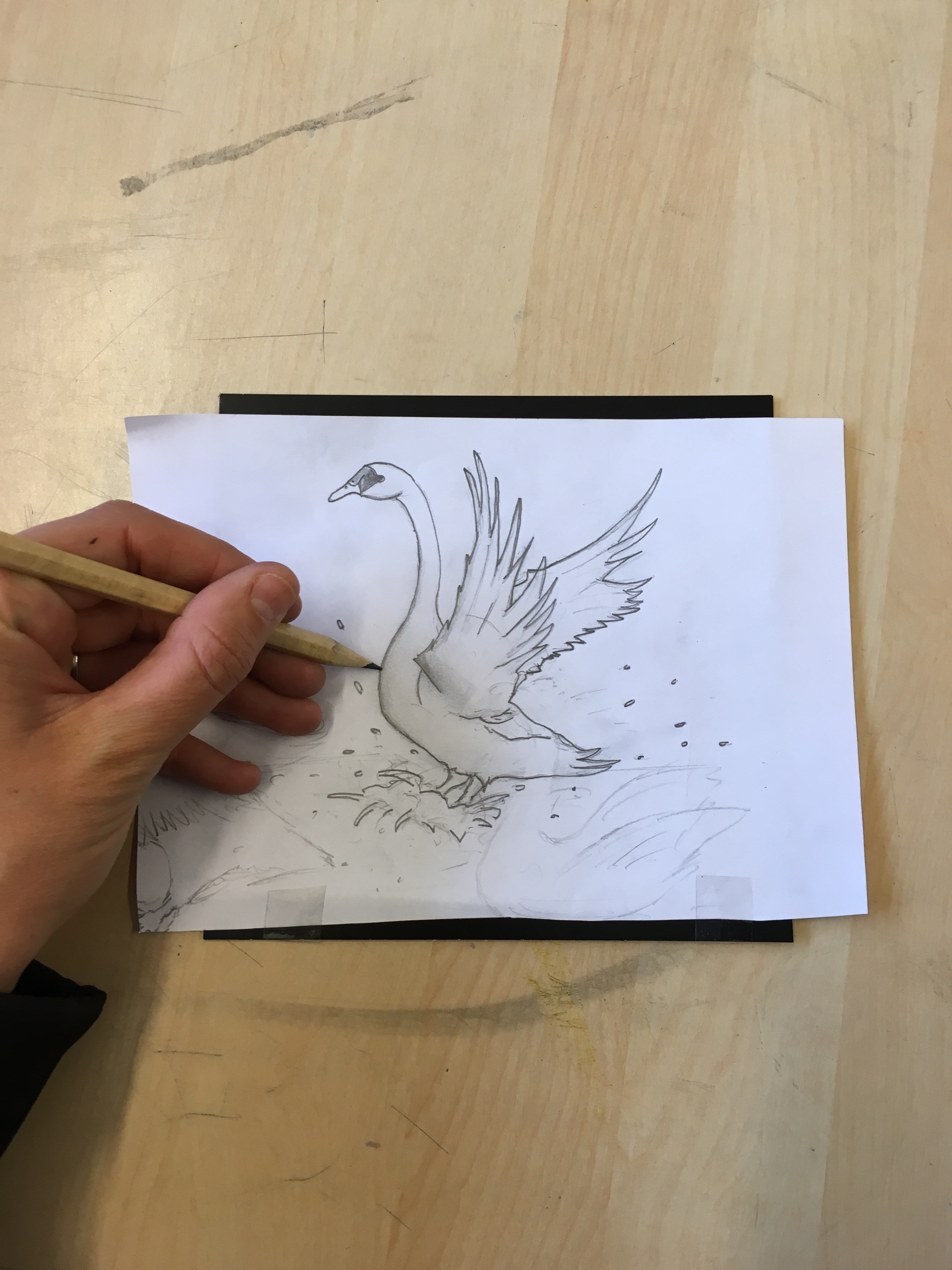 Den här eleven har skissat på en svan. Han lägger skissen på skrapkartongen och drar linjerna med blyerts igen. Då blir det spår i skrapkartongen och lättare att teckna upp innan det är dags att skrapa.