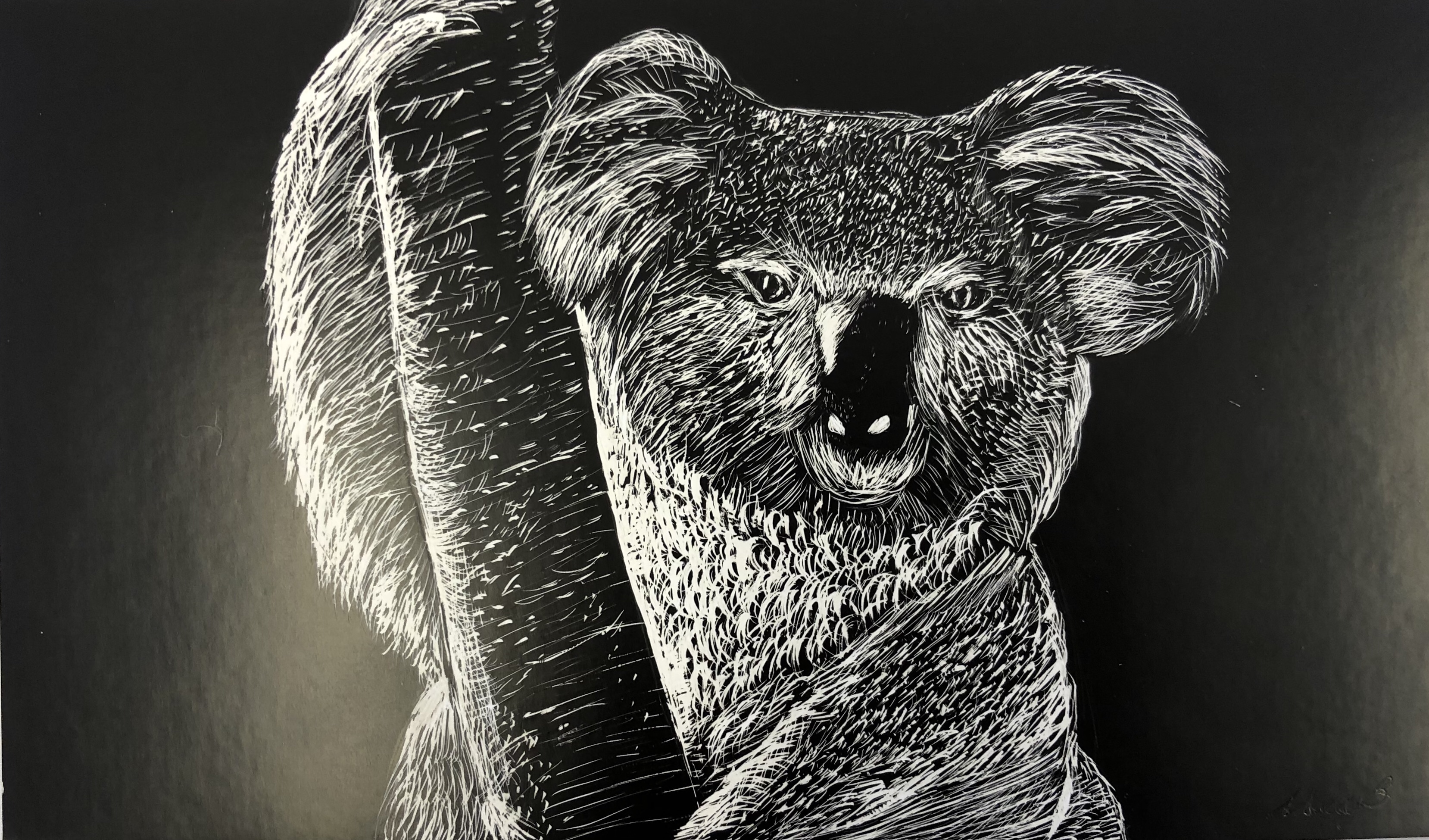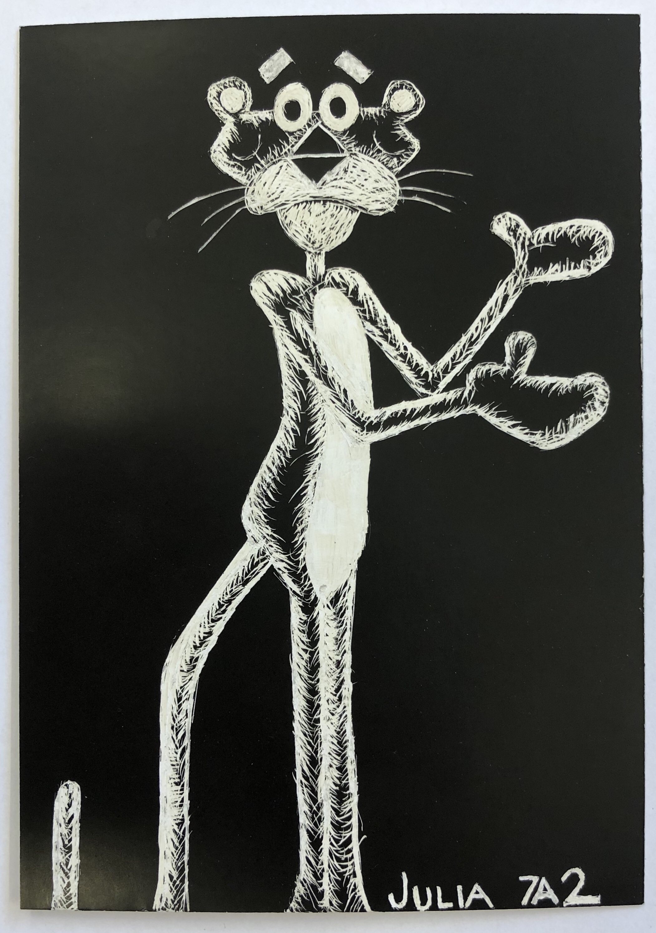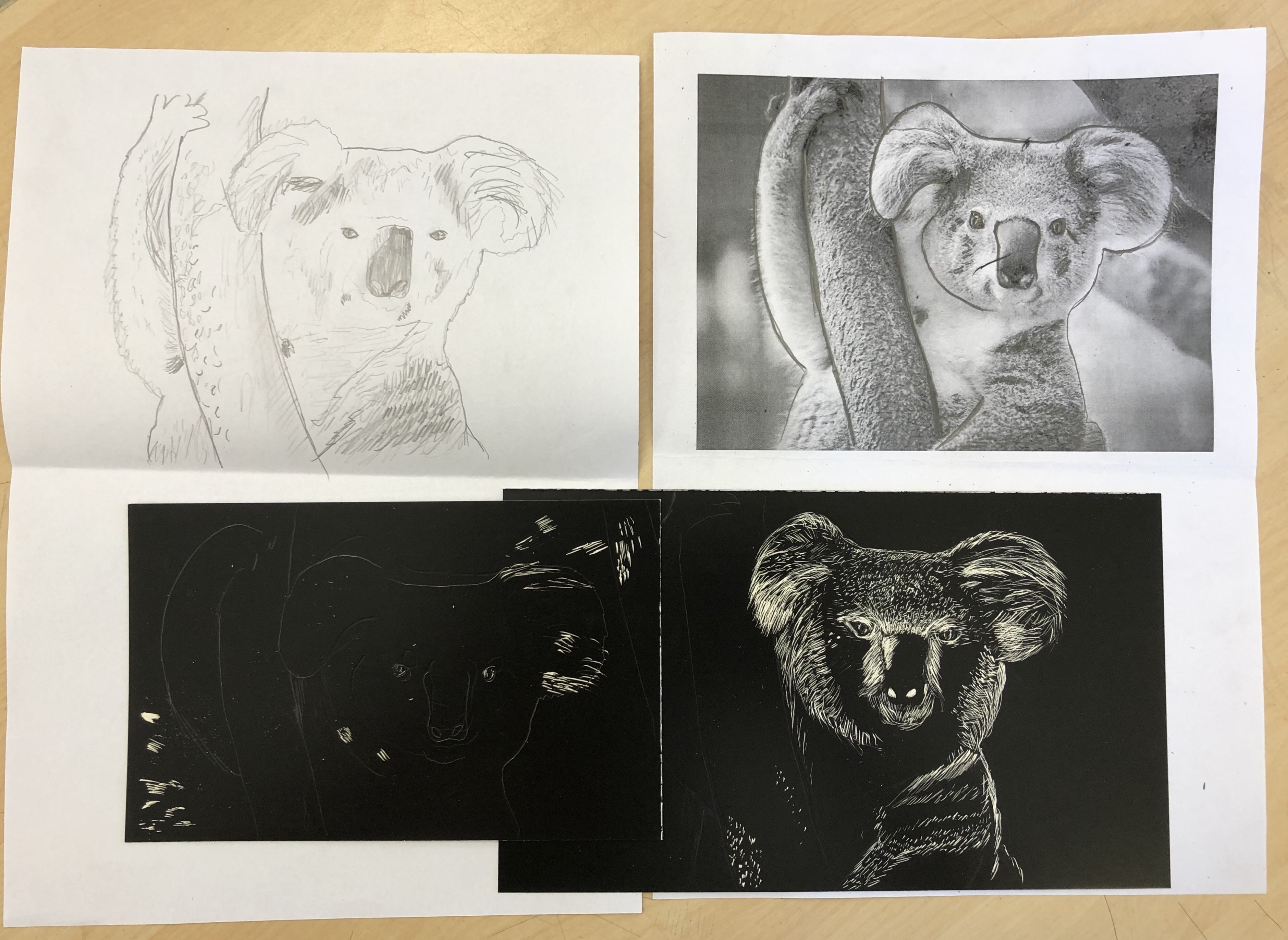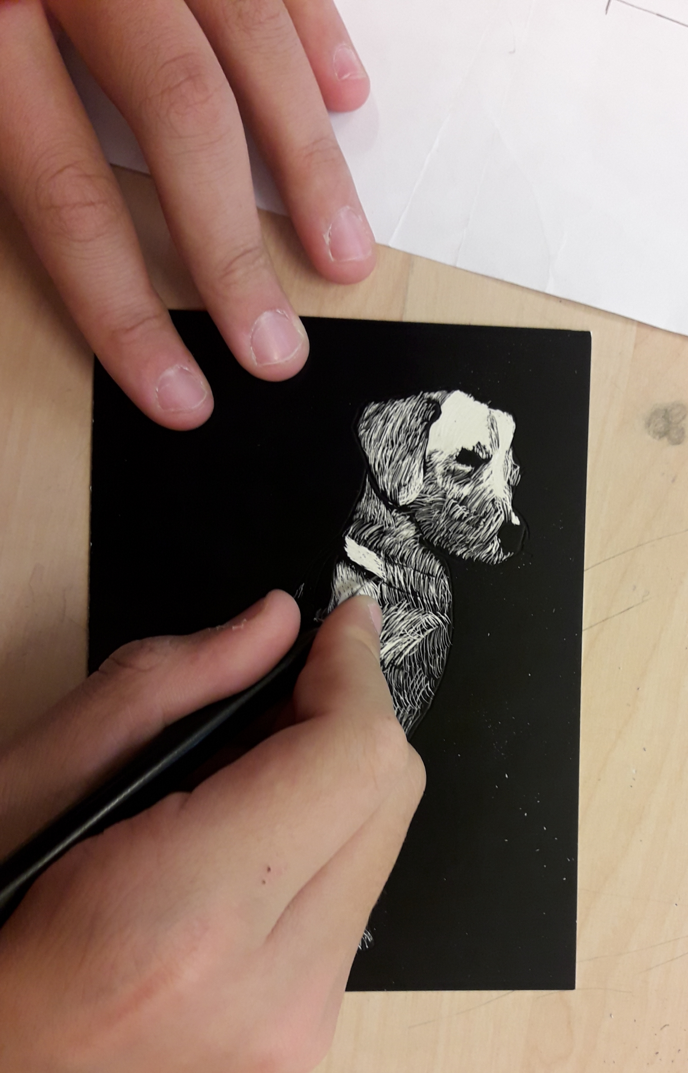 Den här eleven har skissat på en svan. Han lägger skissen på skrapkartongen och drar linjerna med blyerts igen. Då blir det spår i skrapkartongen och lättare att teckna upp innan det är dags att skrapa.