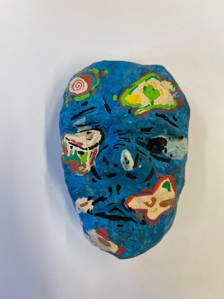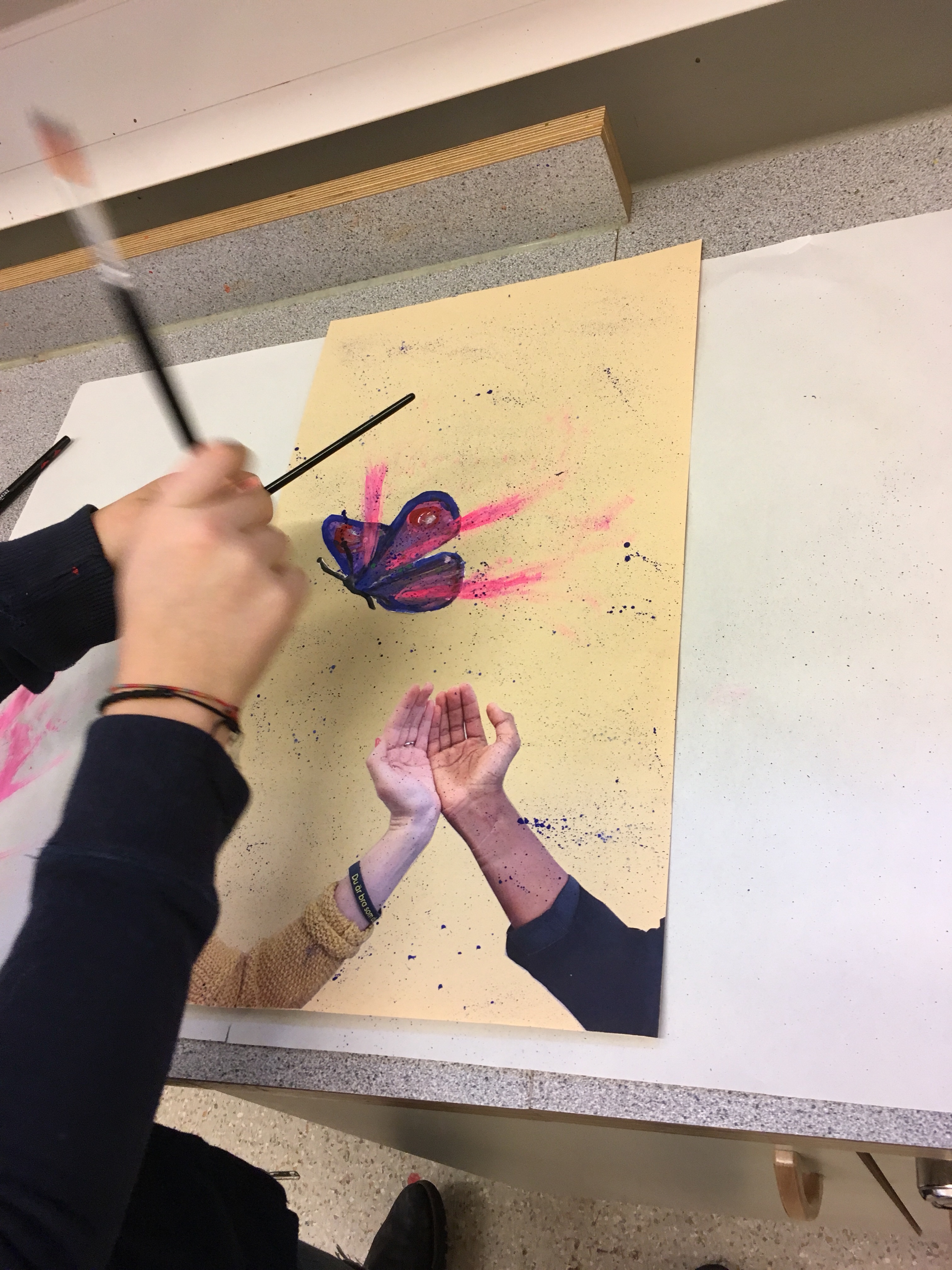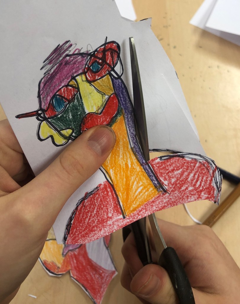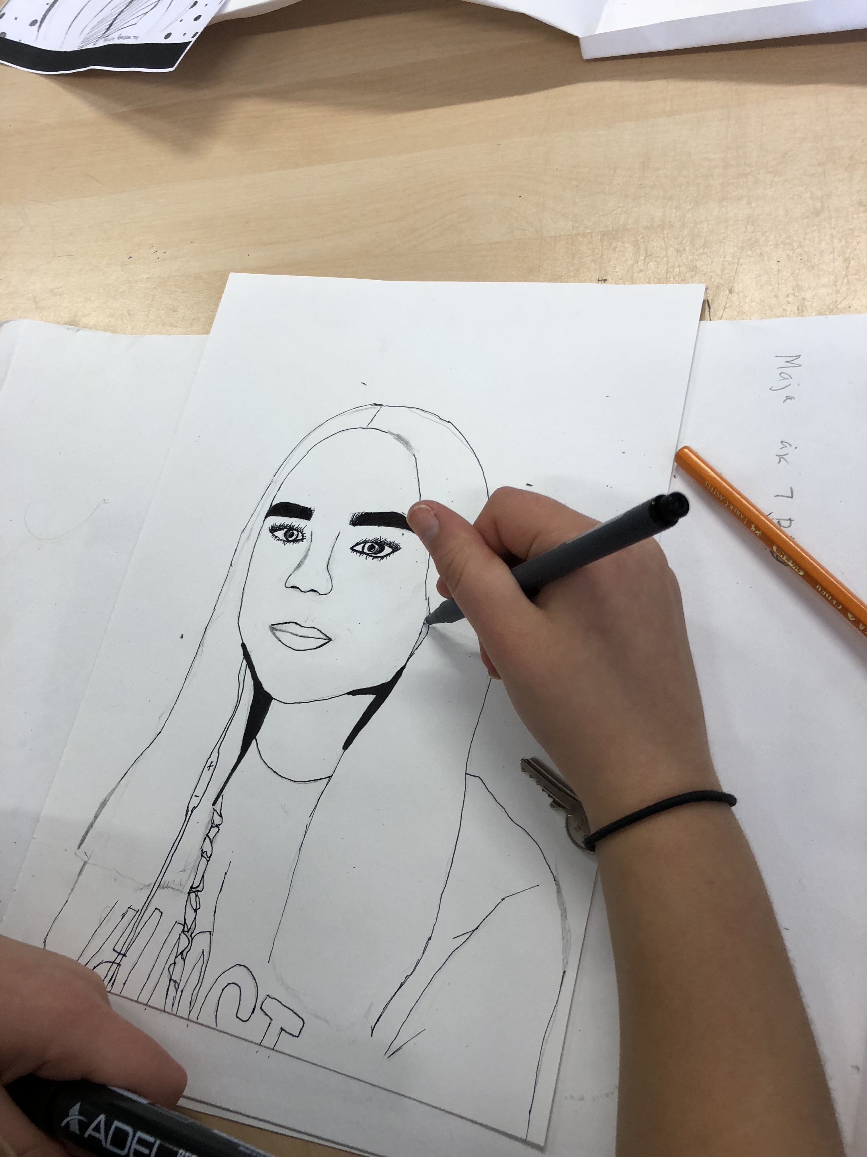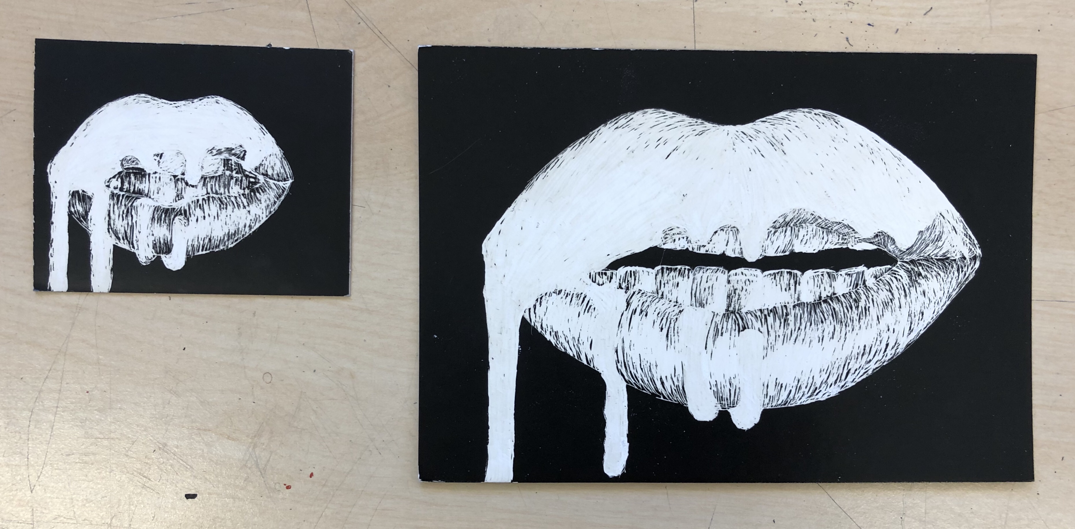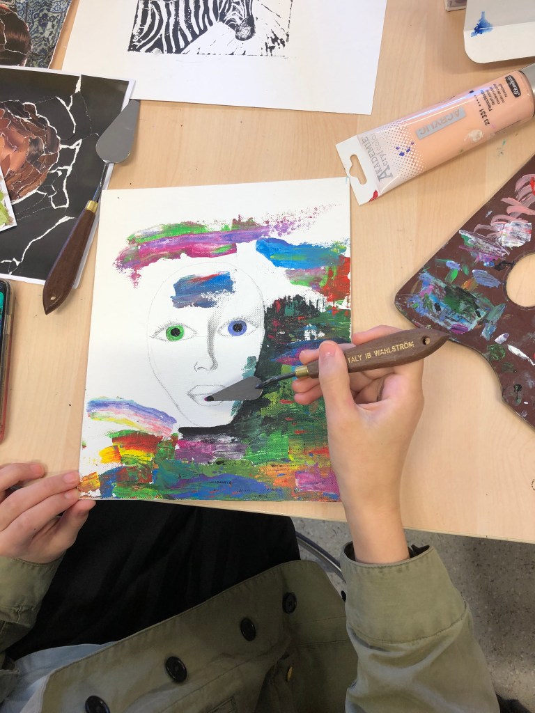 Många lektioner har gått åt till att skapa sig själv som monster mha oljepastell på A3-papper. Projektet avslutas med en digital twist.