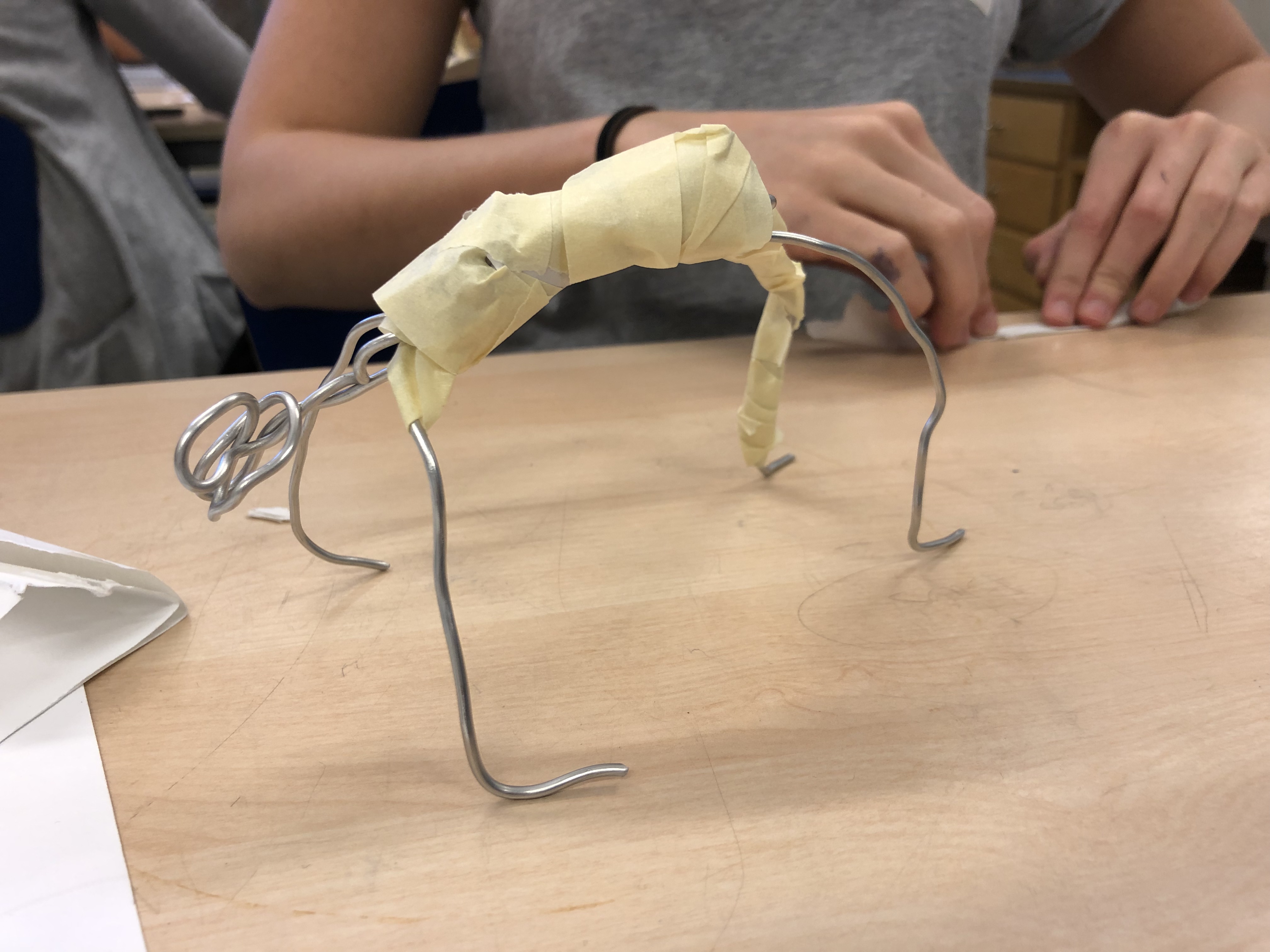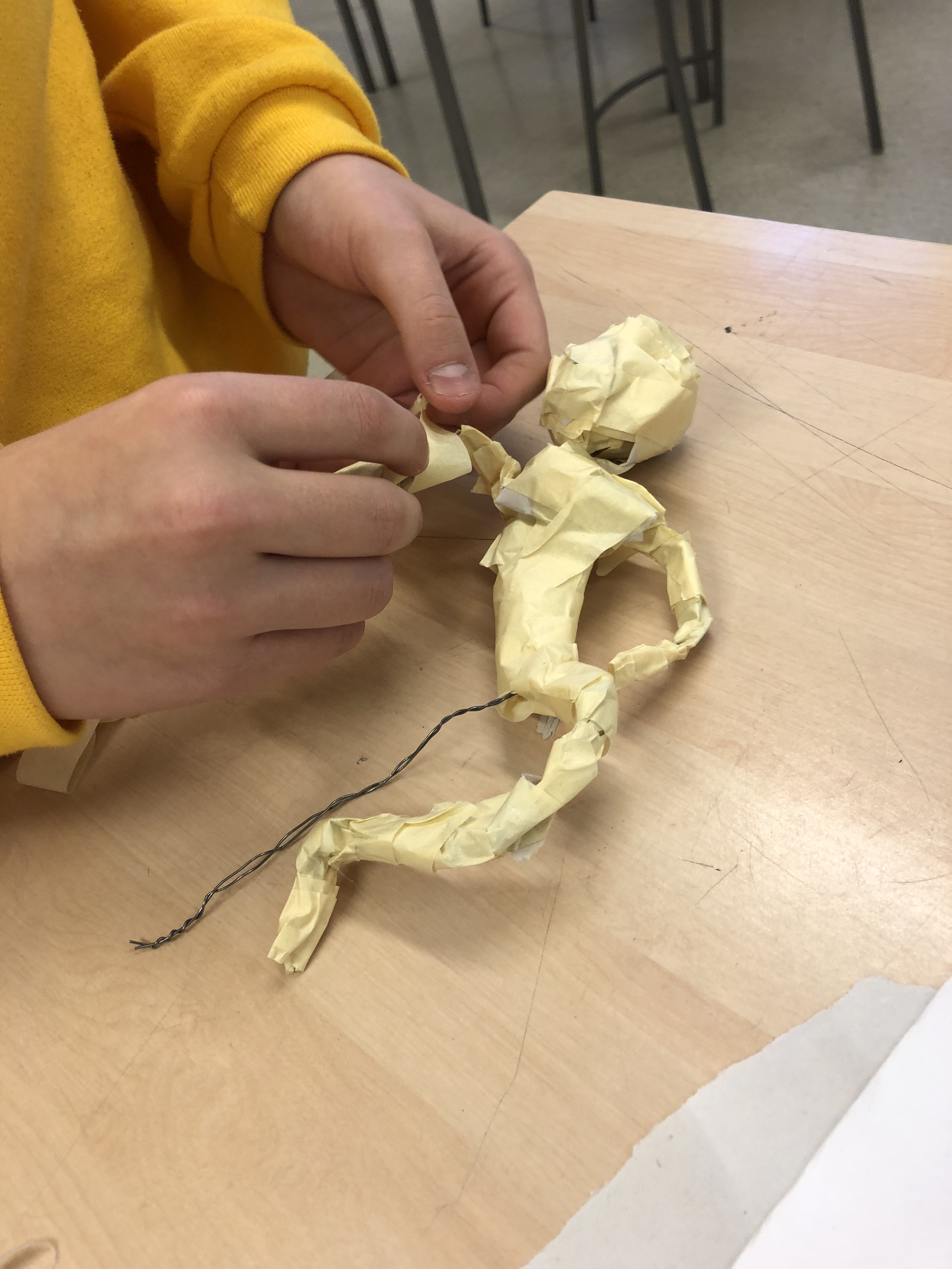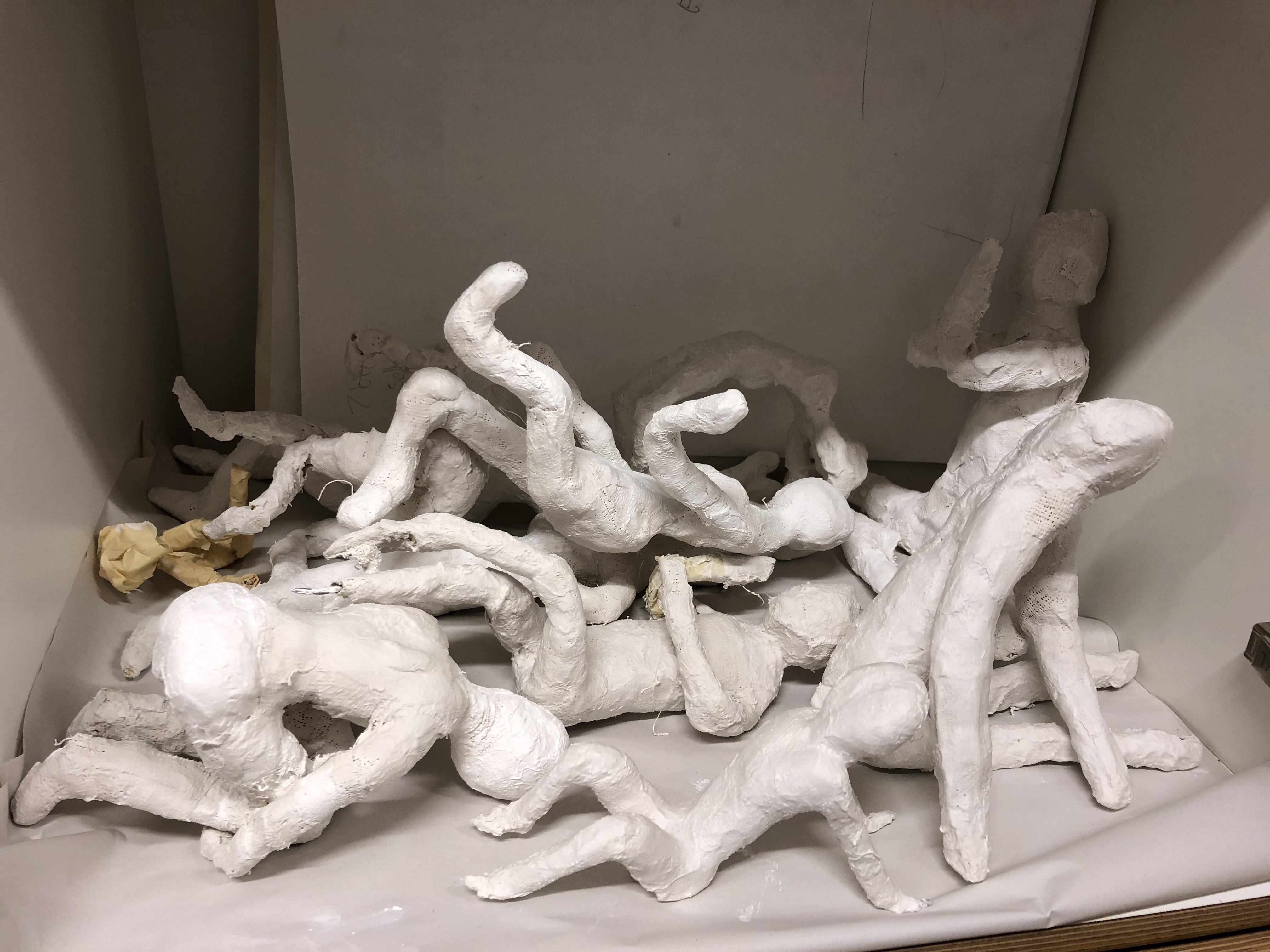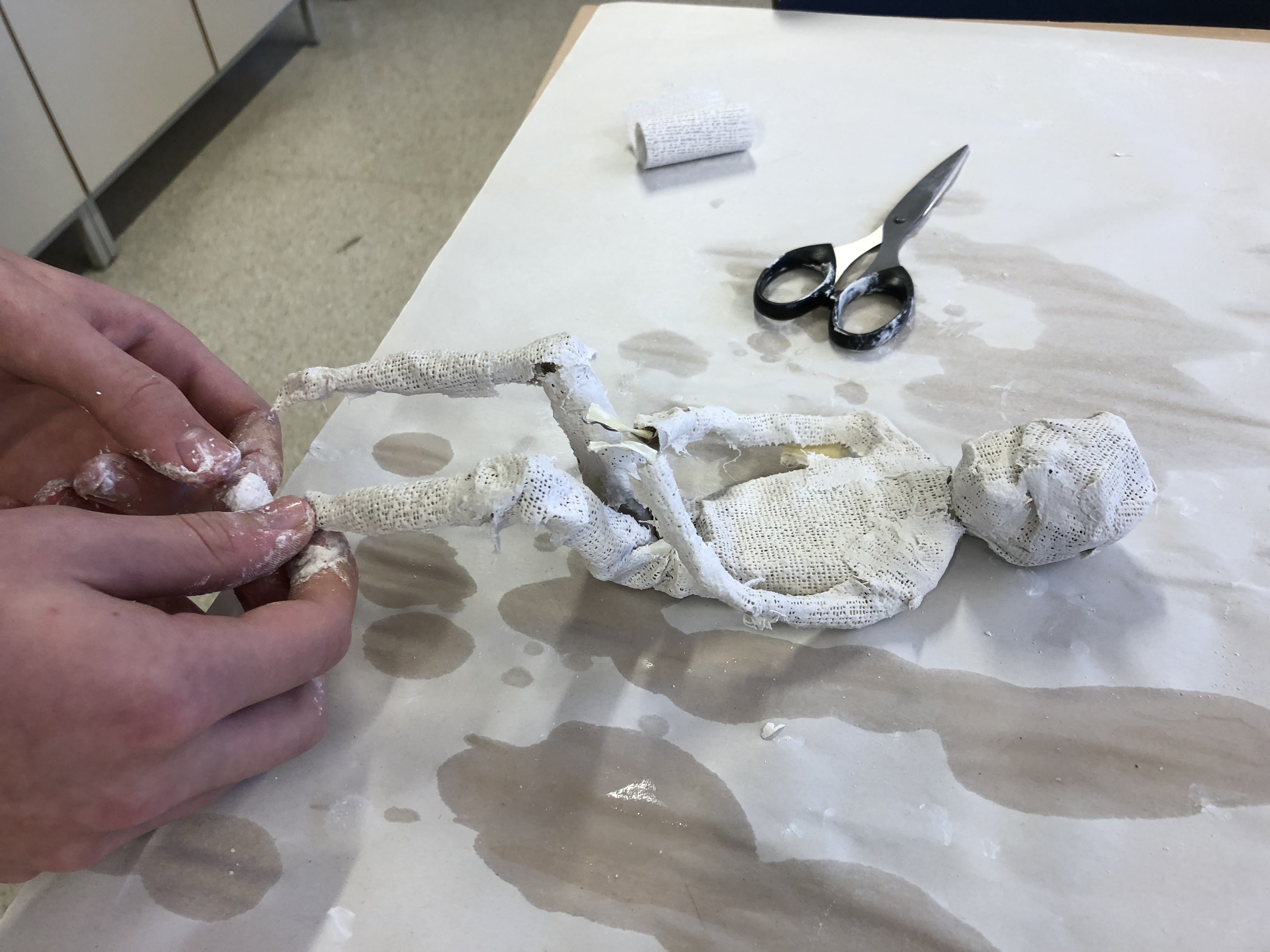 Nu börjar figurerna ta form! Ståltråd, papper och tejp och slutligen gips!