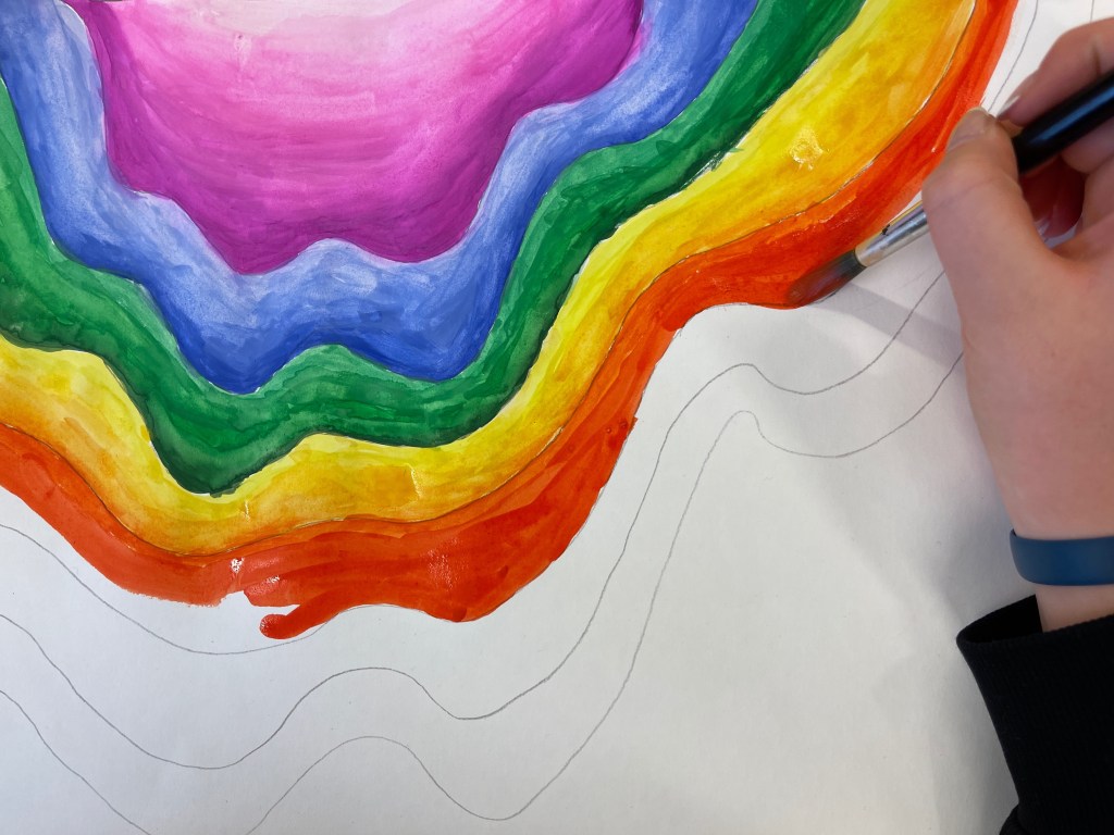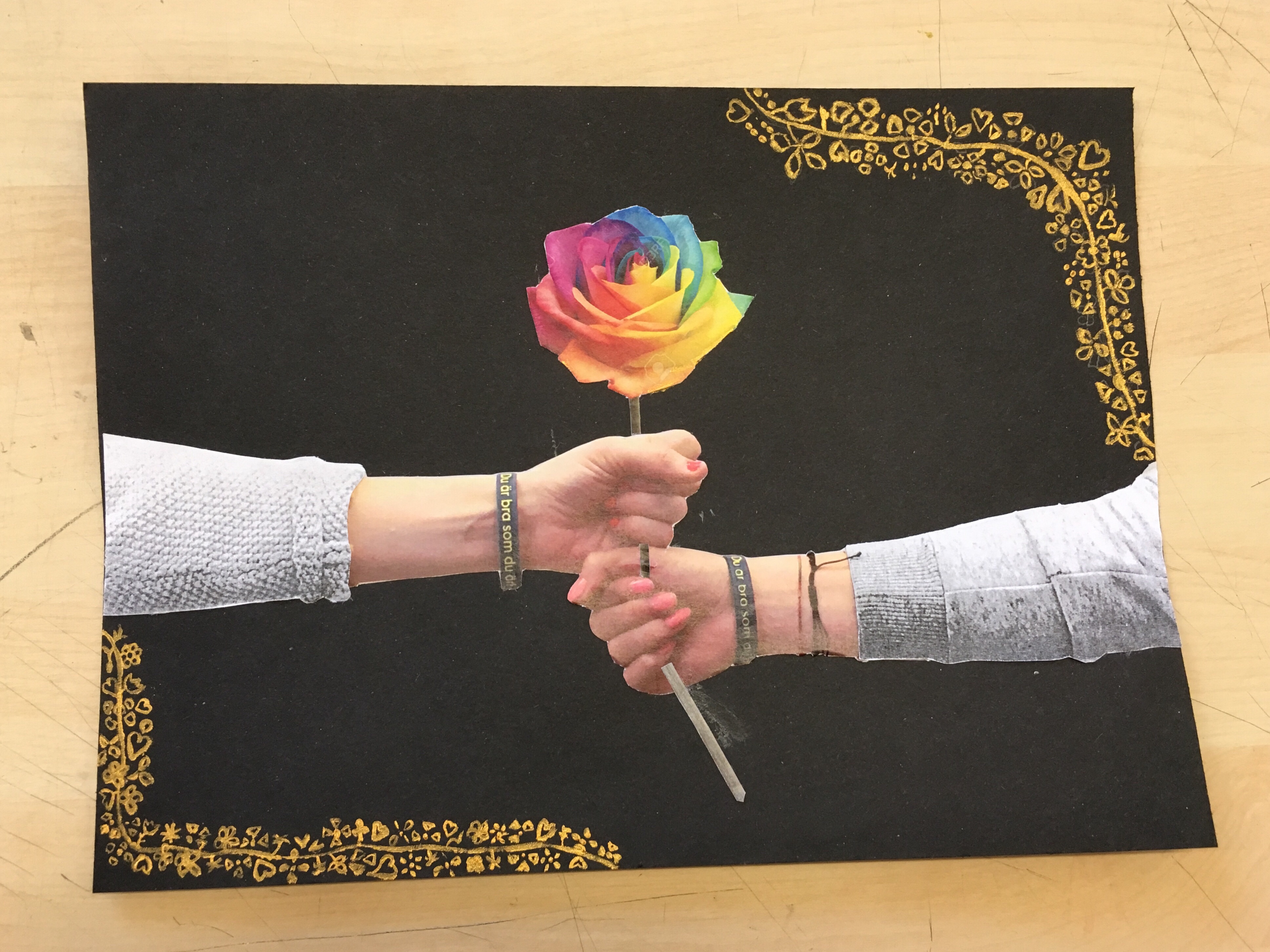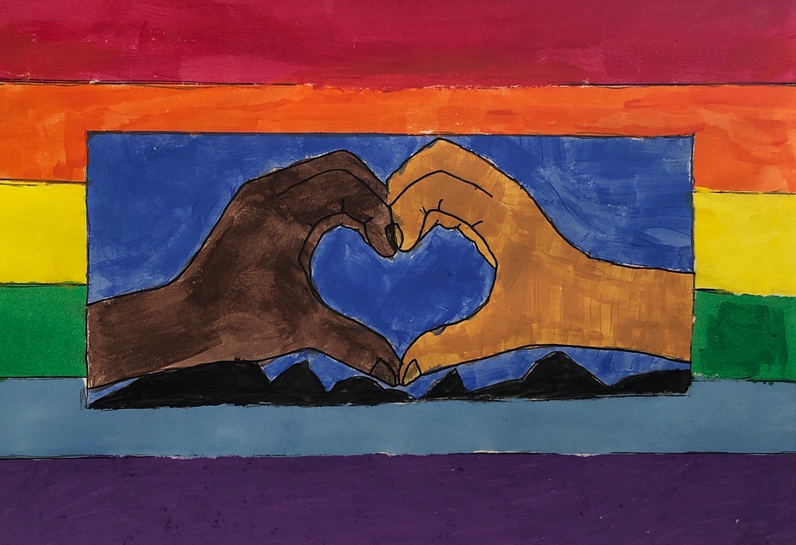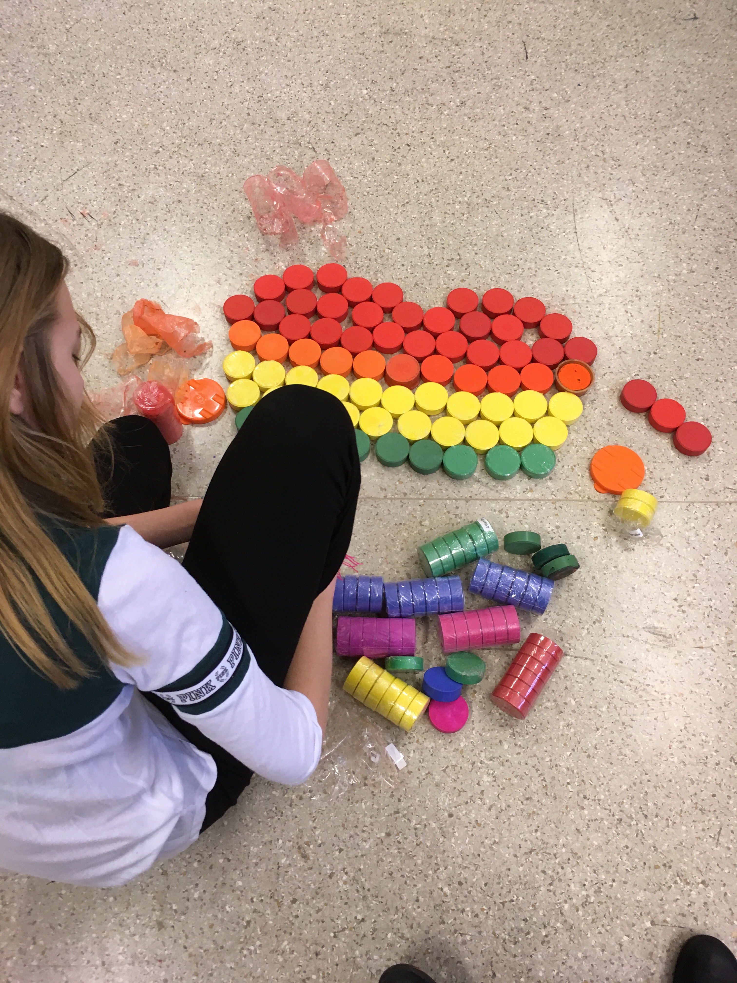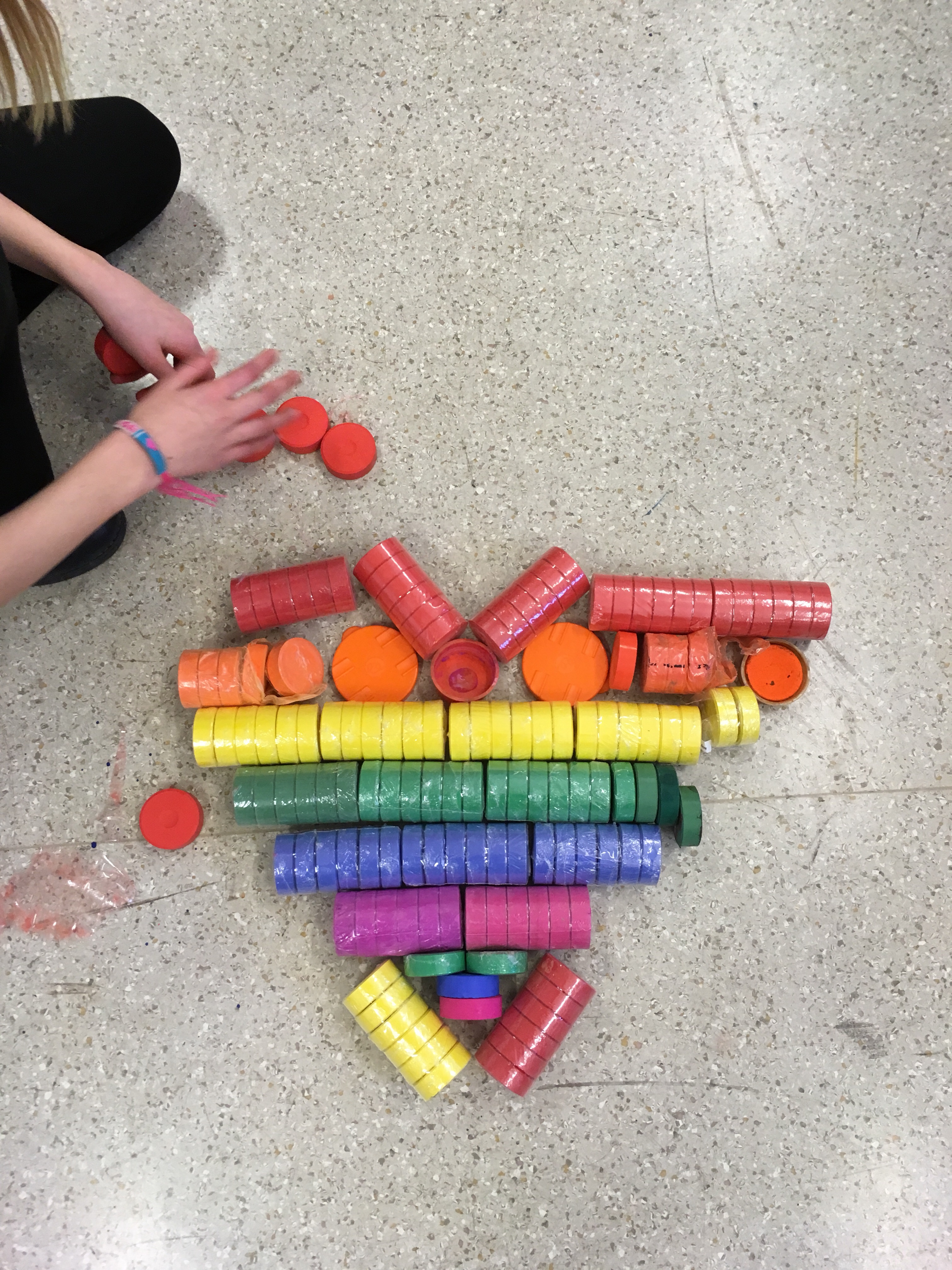 Här testar en elev hjärtat som symbol uppbyggt av regnbågsfärger a.