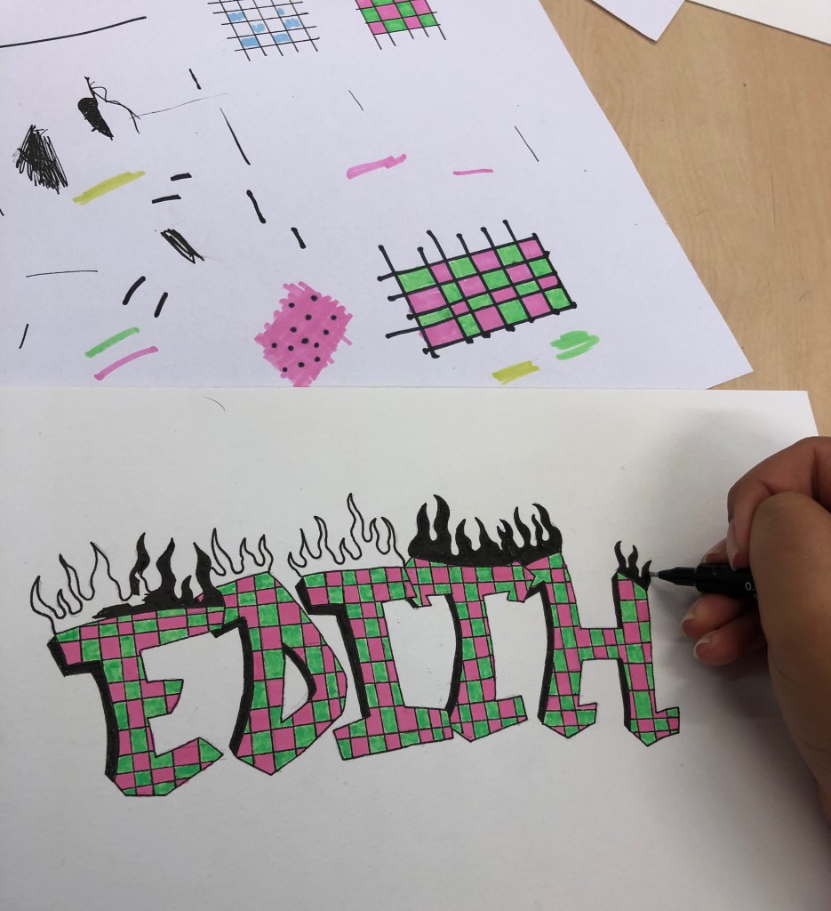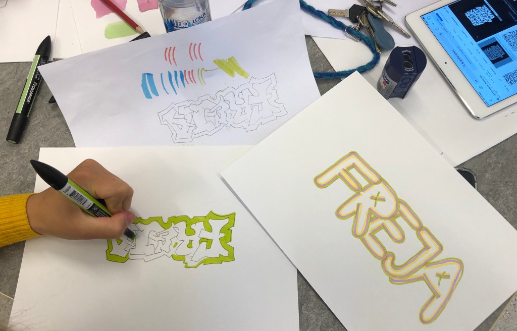 Nu är alla igång med uppgiften att visualisera ett ord dvs ”skriva” tex träd där bokstäverna formas av träd.