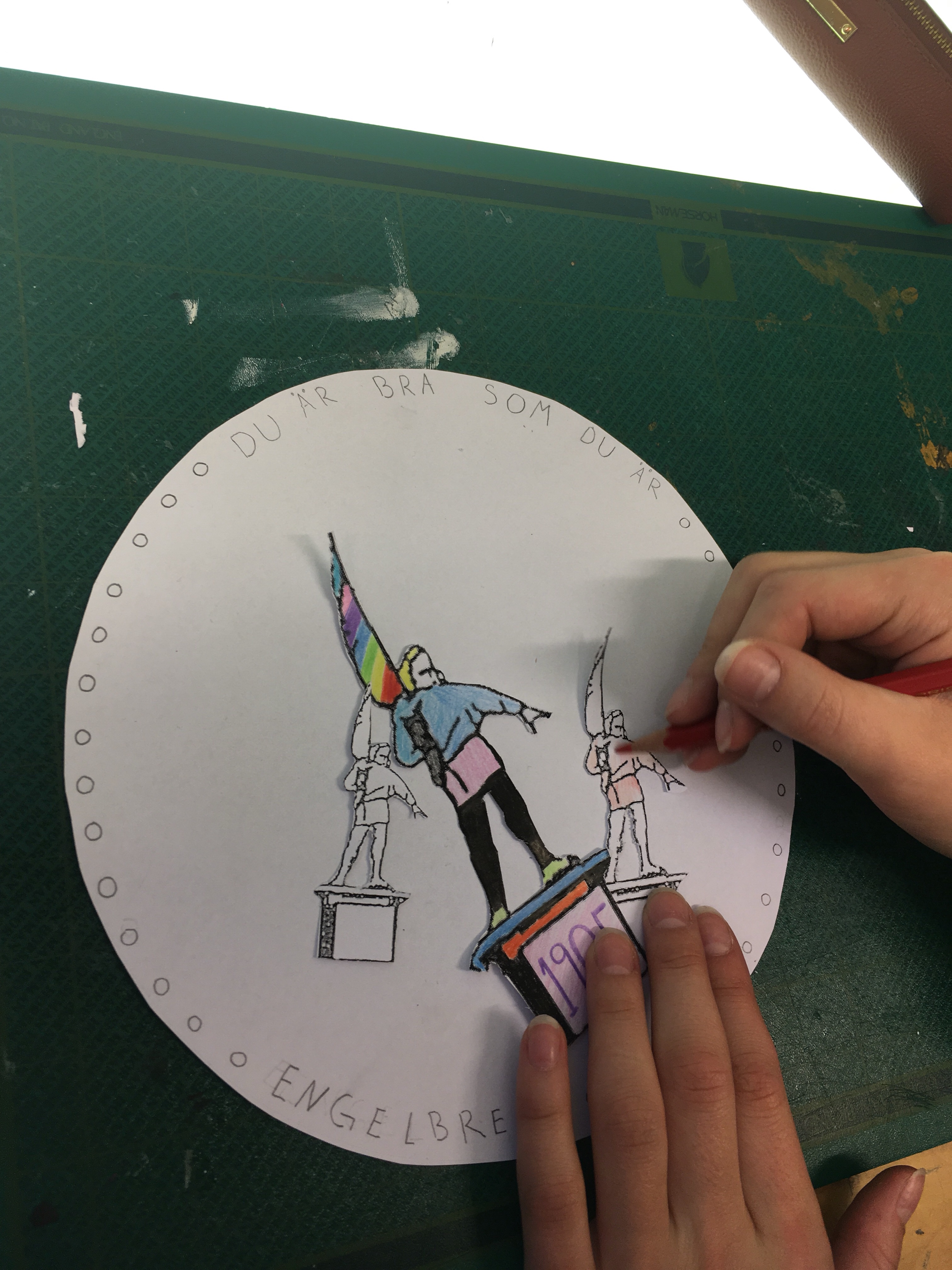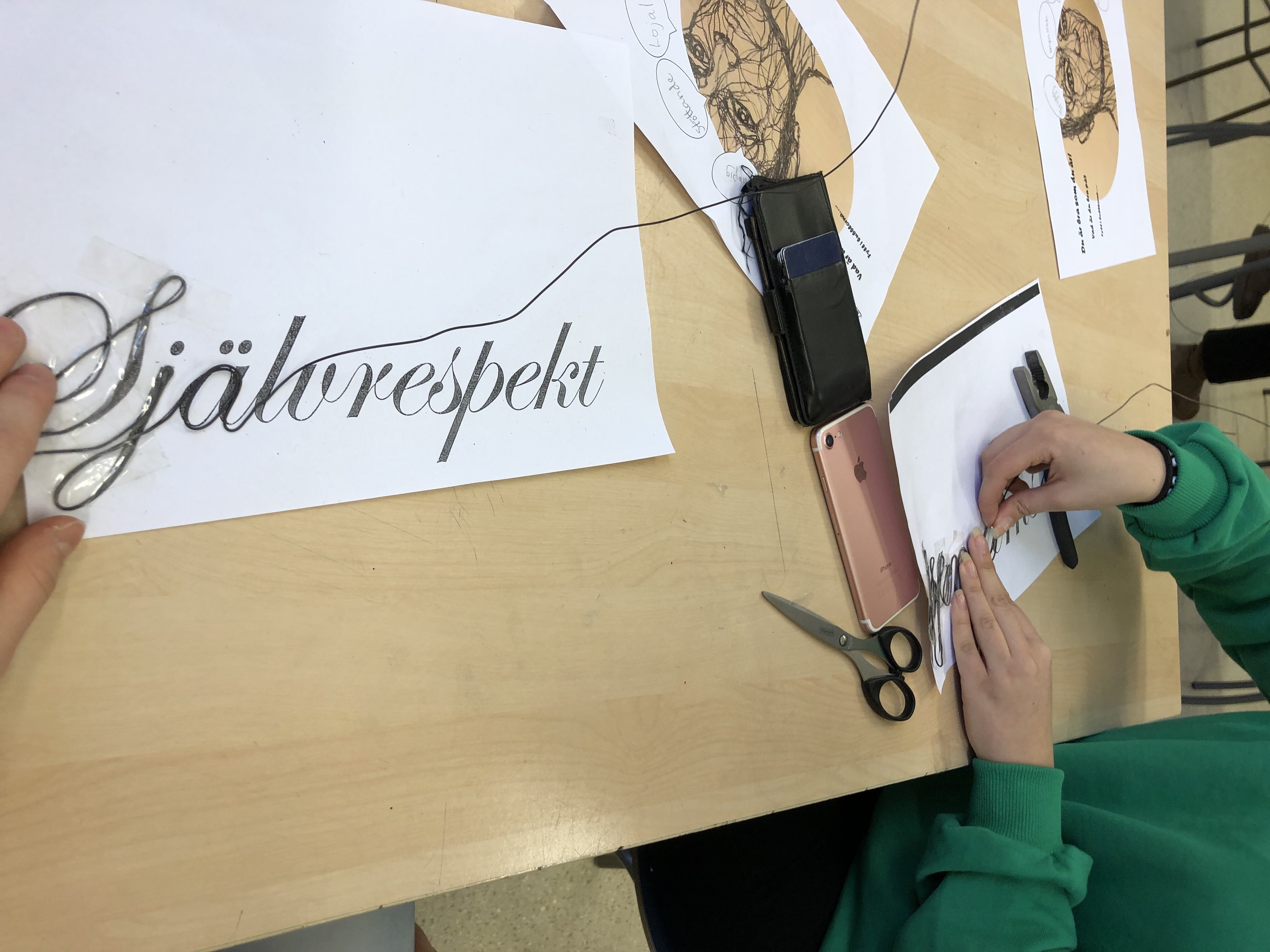 Eleverna har fått identifiera platser på skolan som känns otrygga. De redigerar för hand eller digitalt om dessa platser för att skolan ska vara en tryggare och mer välkomnande plats där man får vara den man är.