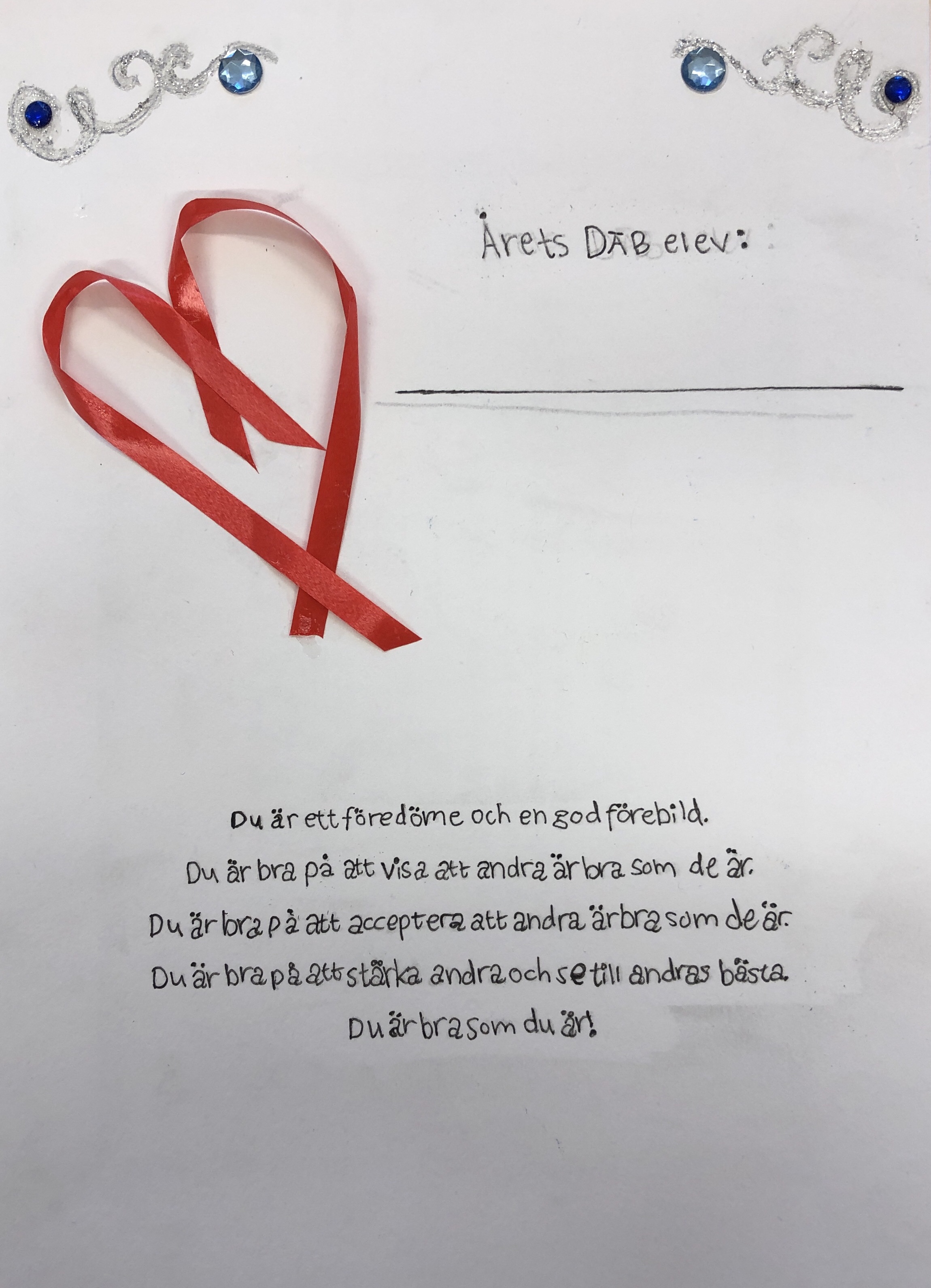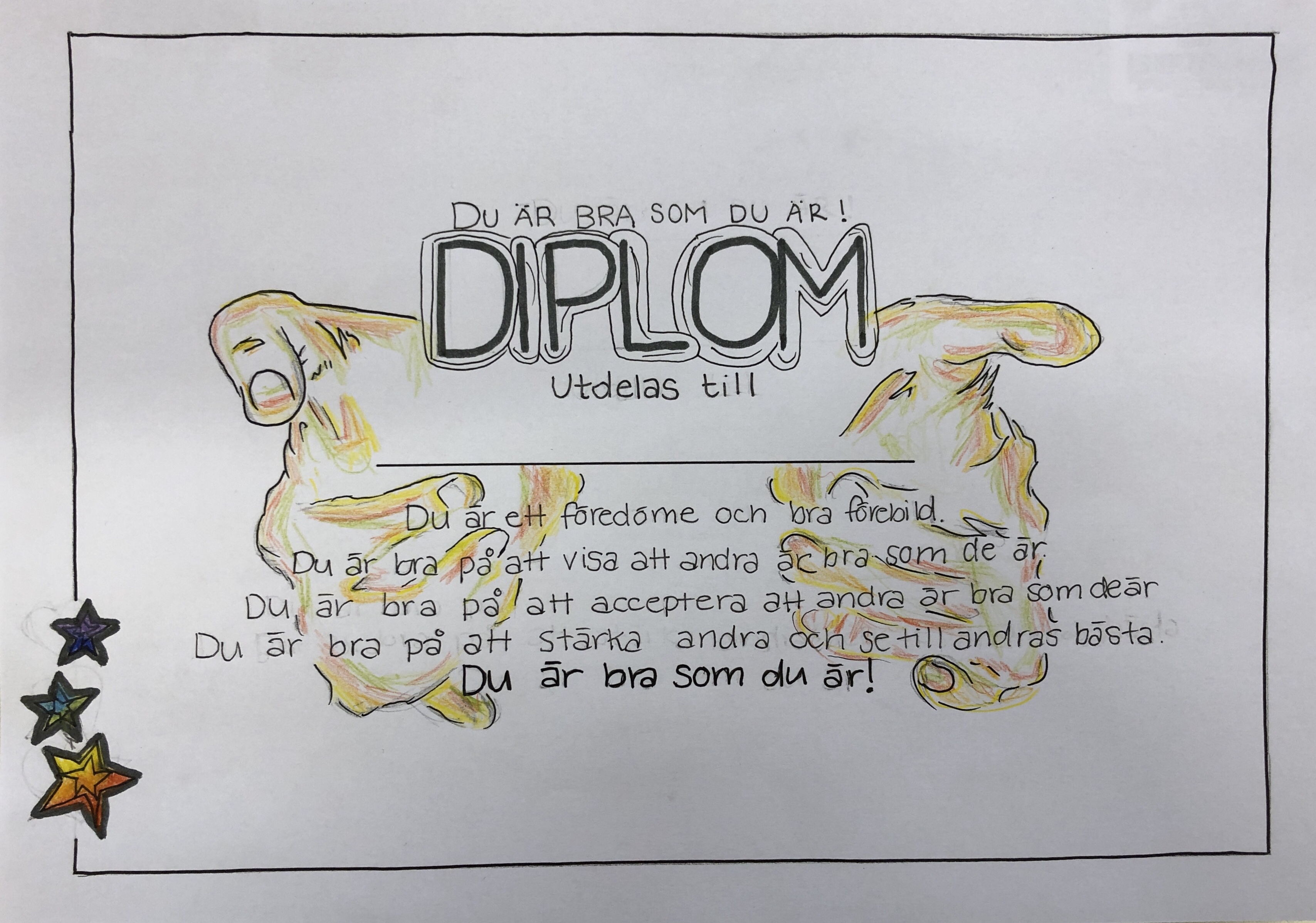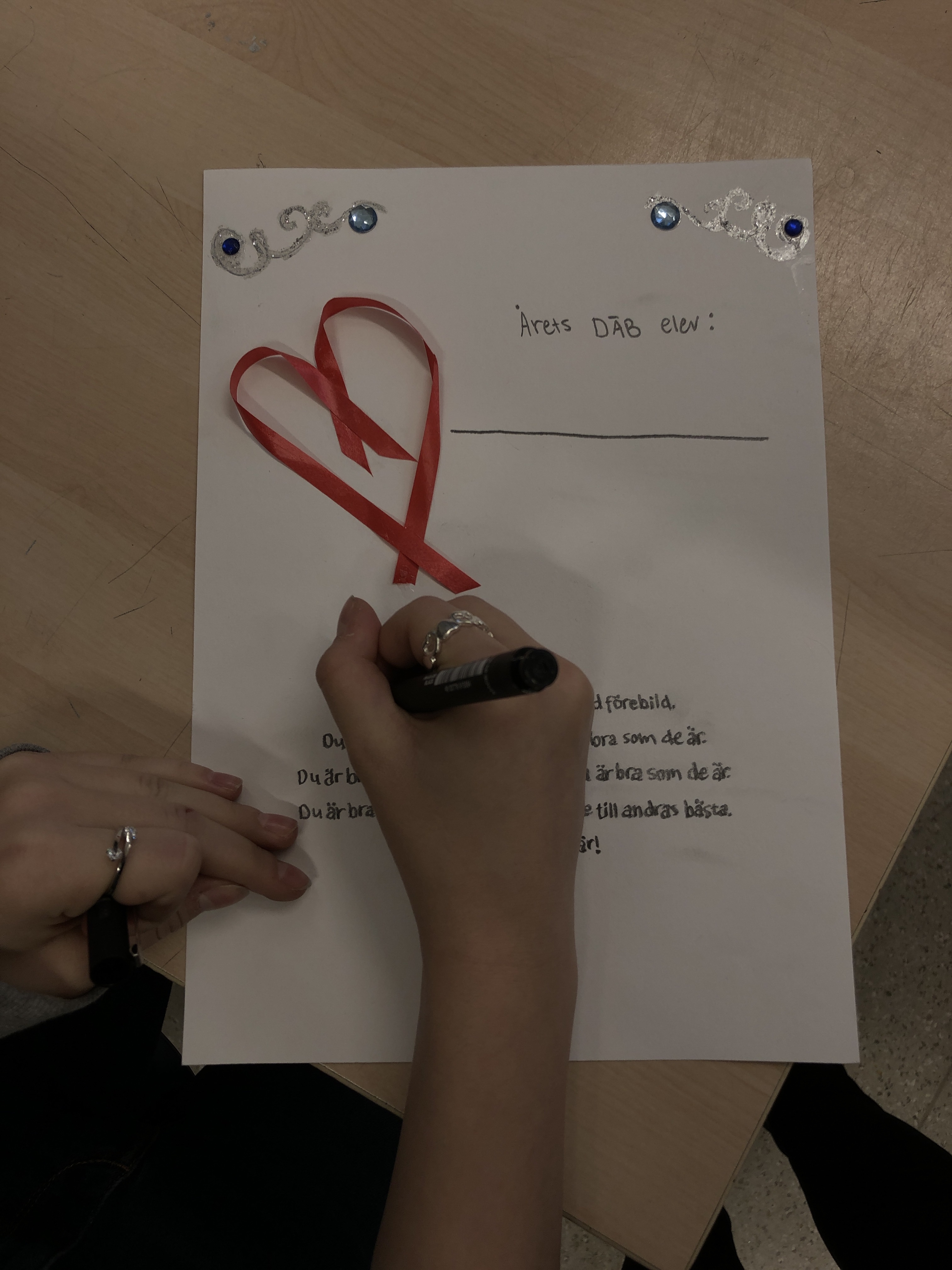 8BFD jobbar med diplomet som ska tilldelas årets DÄB-elev (åk 7-9) på skolavslutningen av rektor Tomas. Vi har tittat på det som utmärker ett diplom och vad som måste vara med samt färger och former som passar så att det blir rätt uttryck.