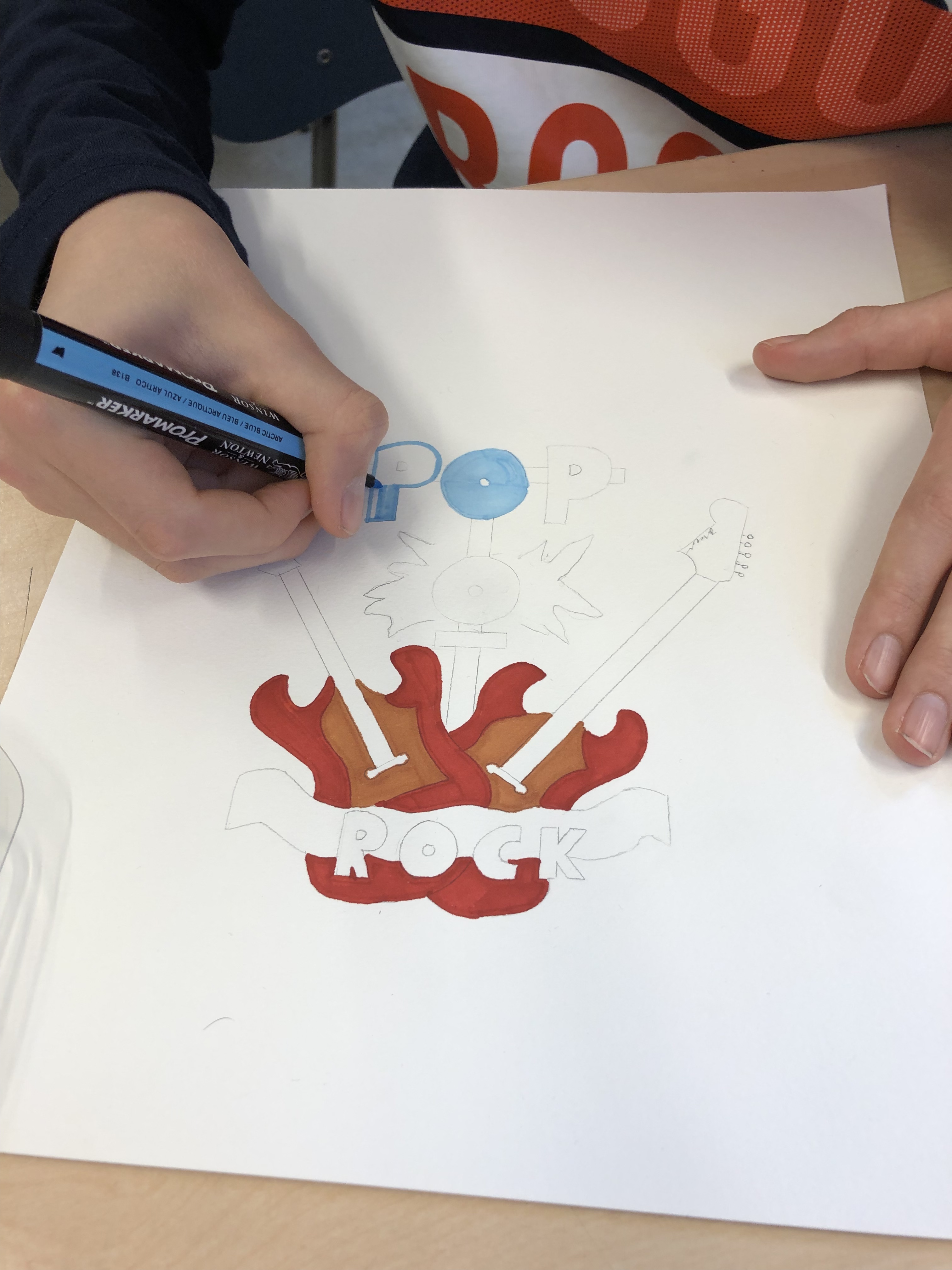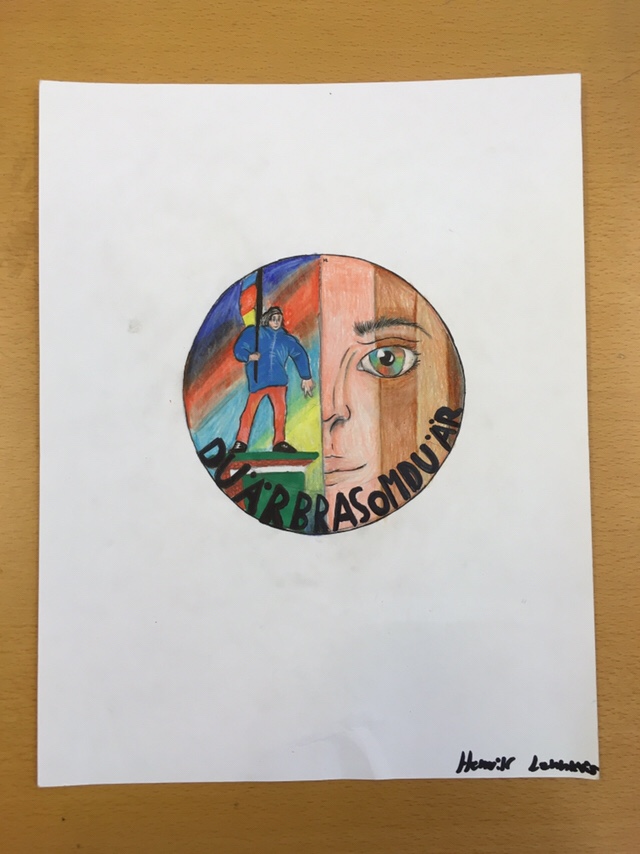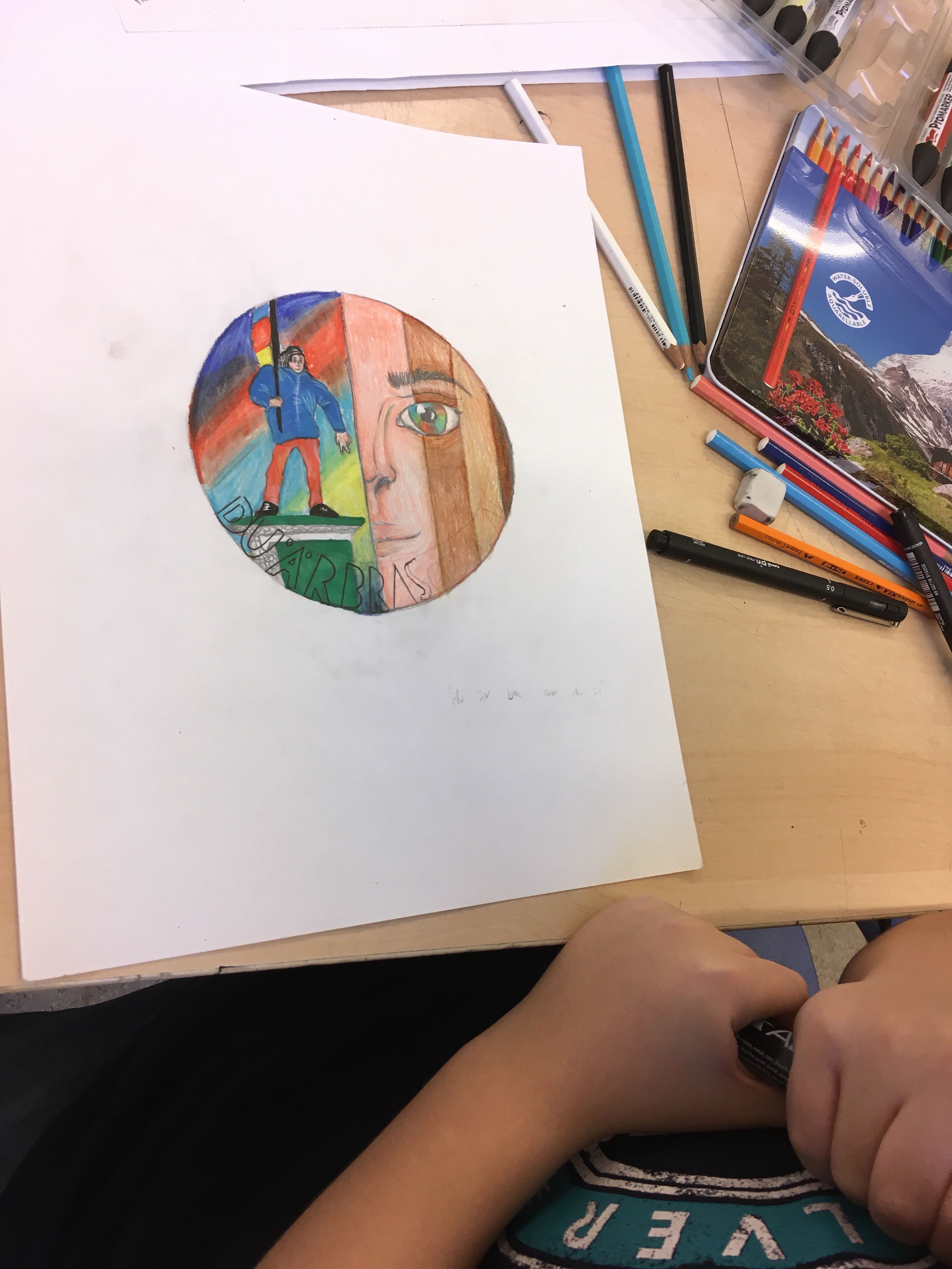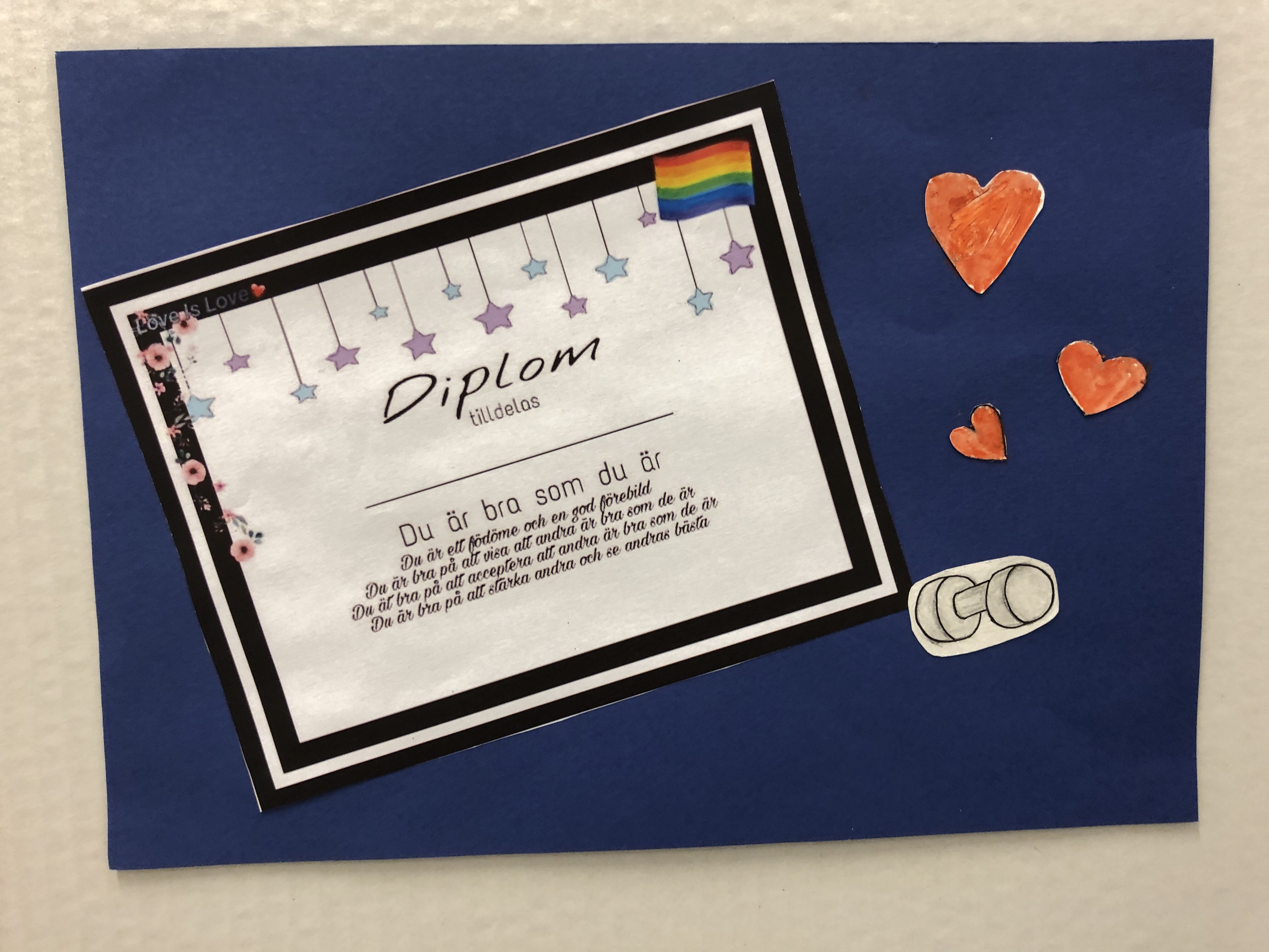 8BFD jobbar med diplomet som ska tilldelas årets DÄB-elev (åk 7-9) på skolavslutningen av rektor Tomas. Vi har tittat på det som utmärker ett diplom och vad som måste vara med samt färger och former som passar så att det blir rätt uttryck.
