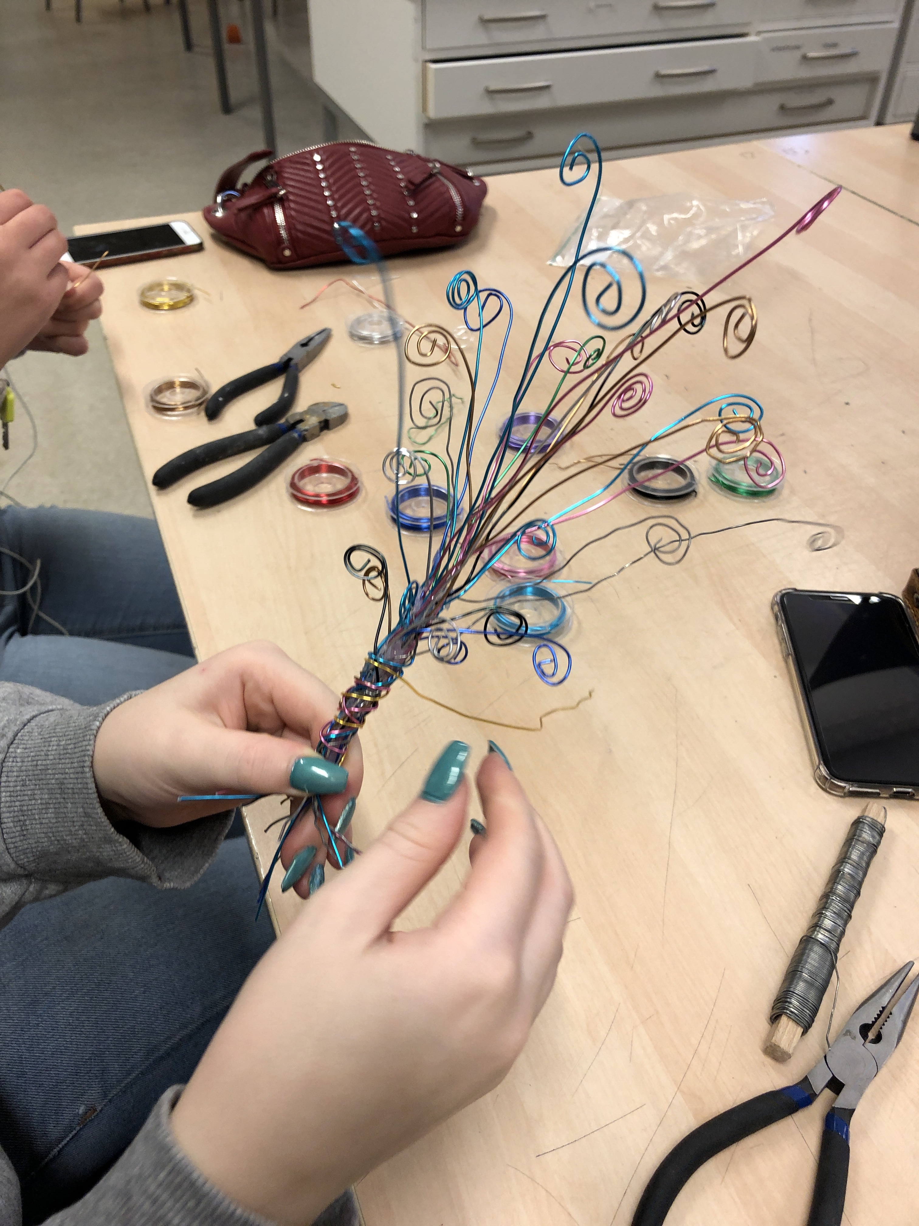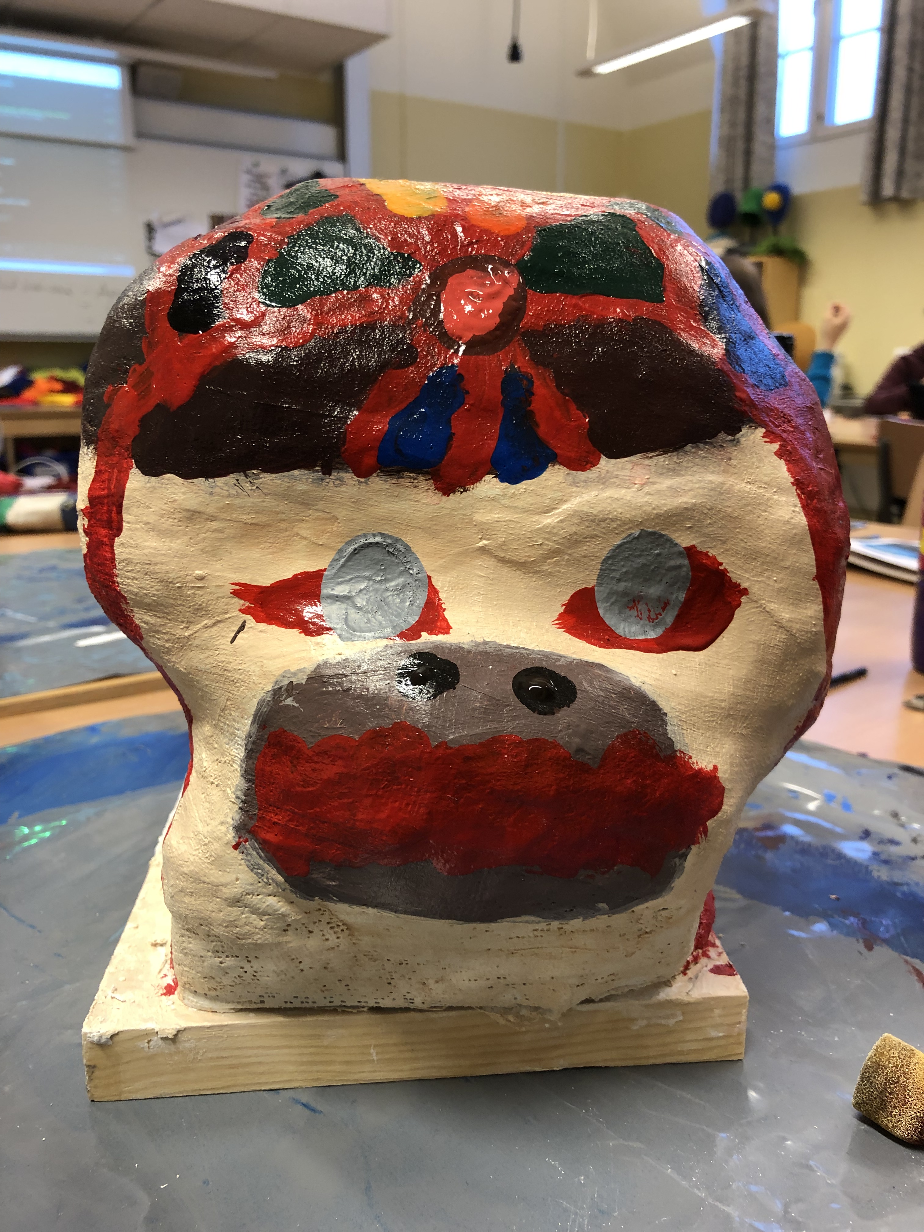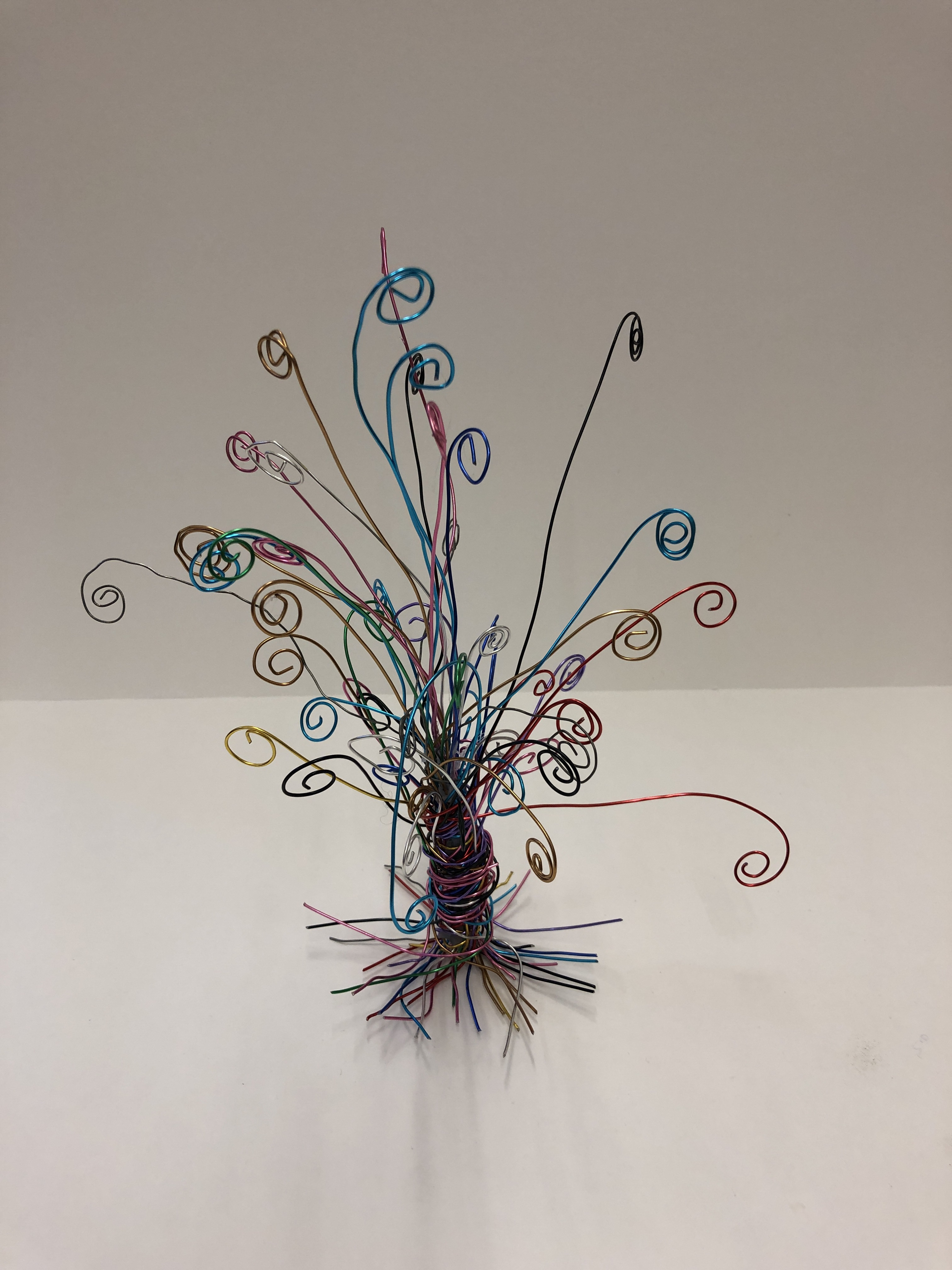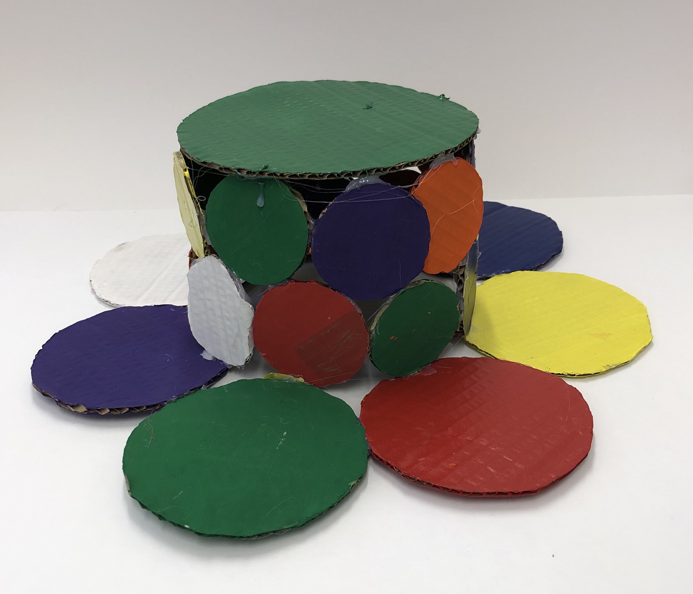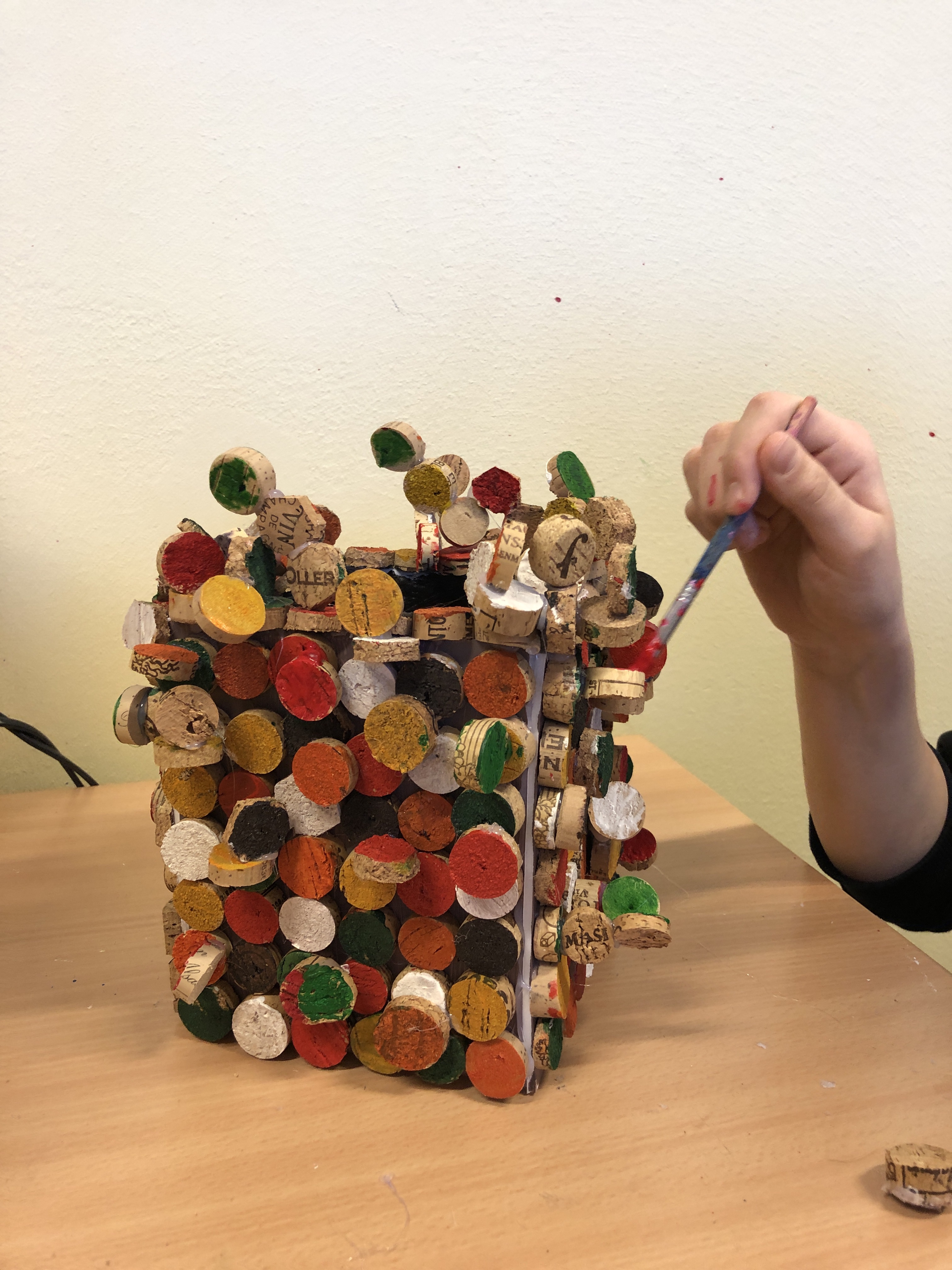 Nu är vi klara! Vi har återbruket kartong, ståltråd, tyg, silkespapper, fluffbollar och tejprullar. Genom att upprepa formen så skapar vi ett bruksföremål eller verk.