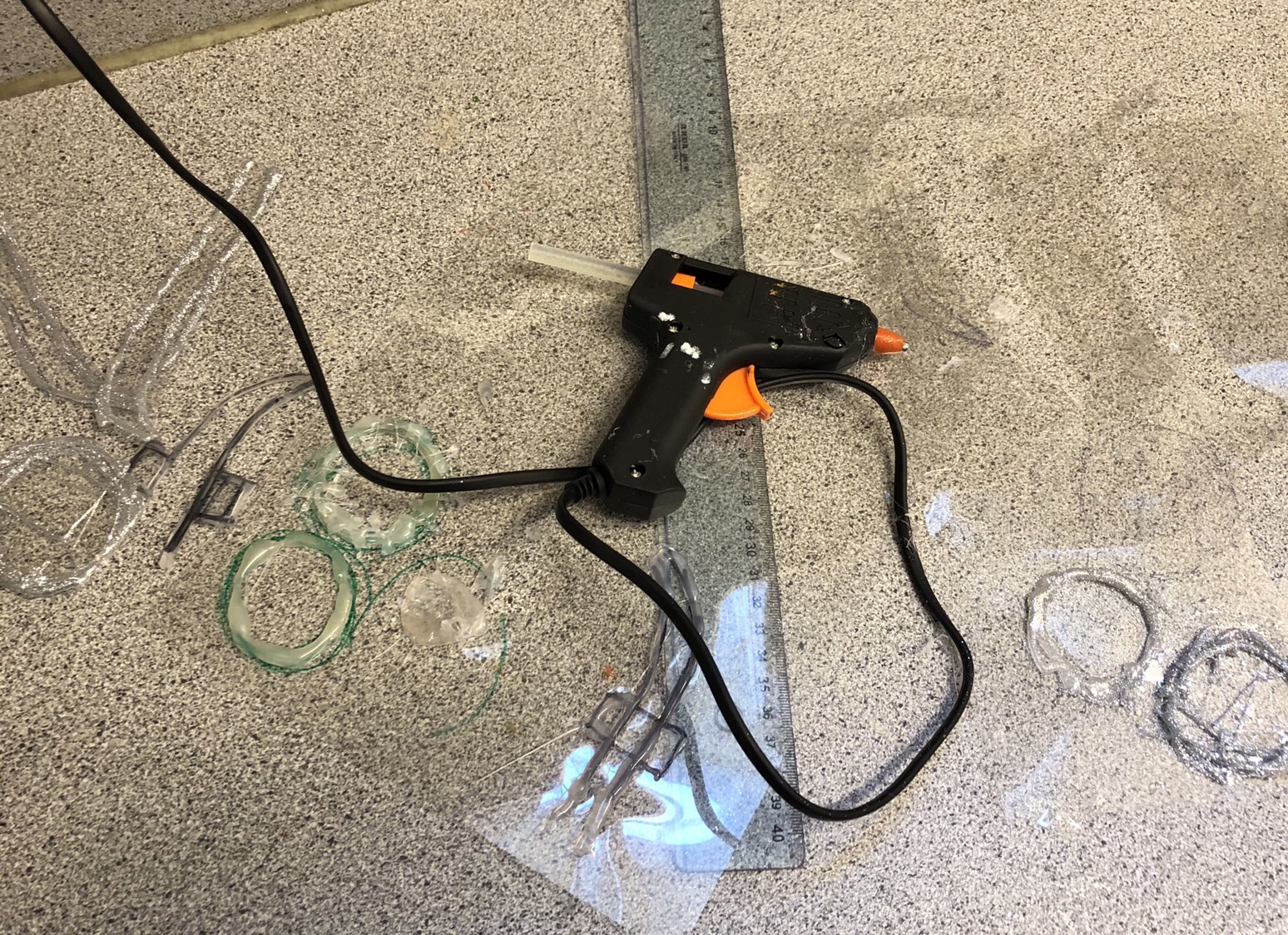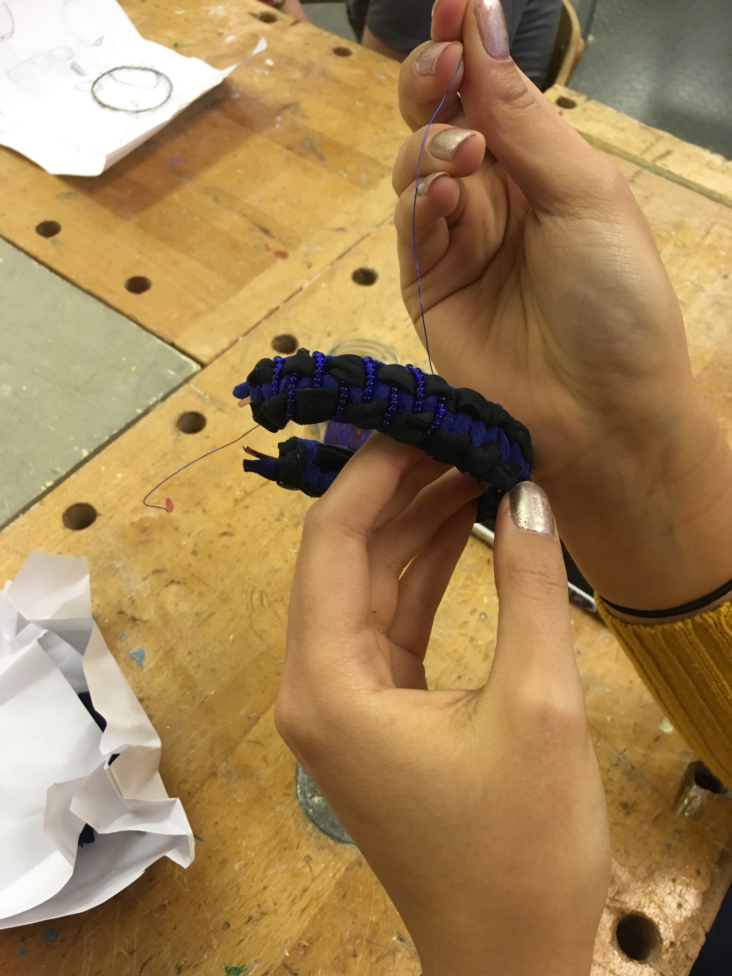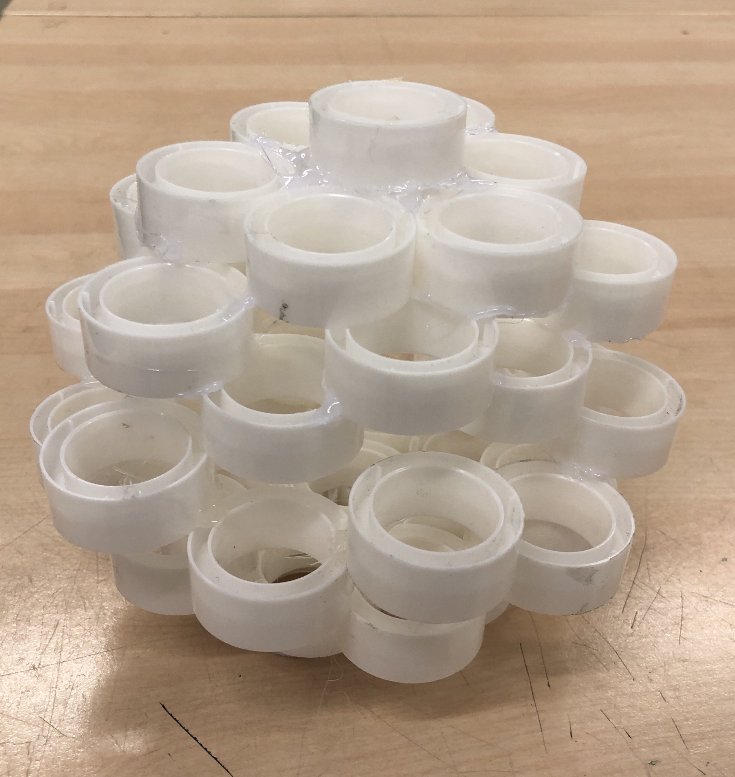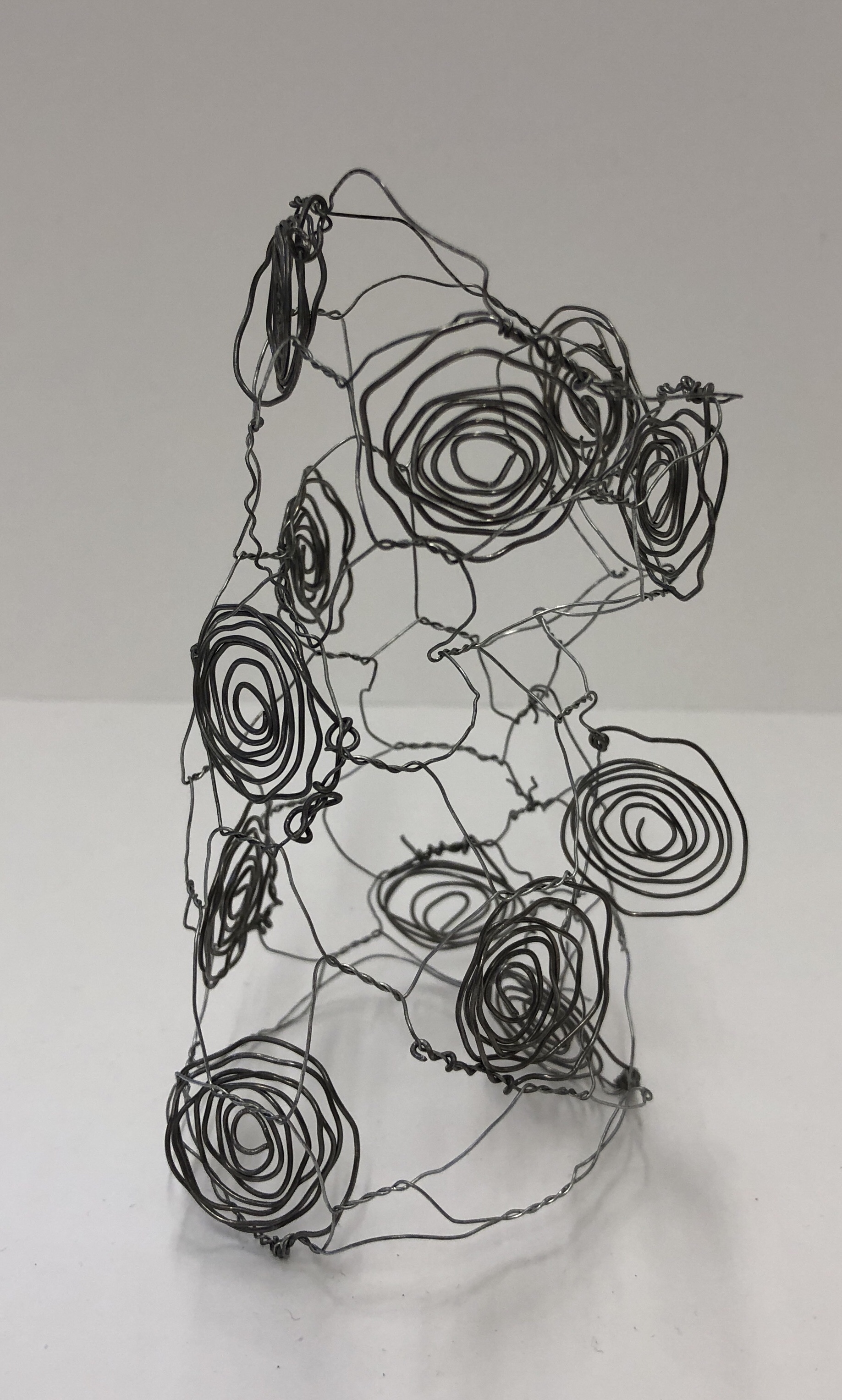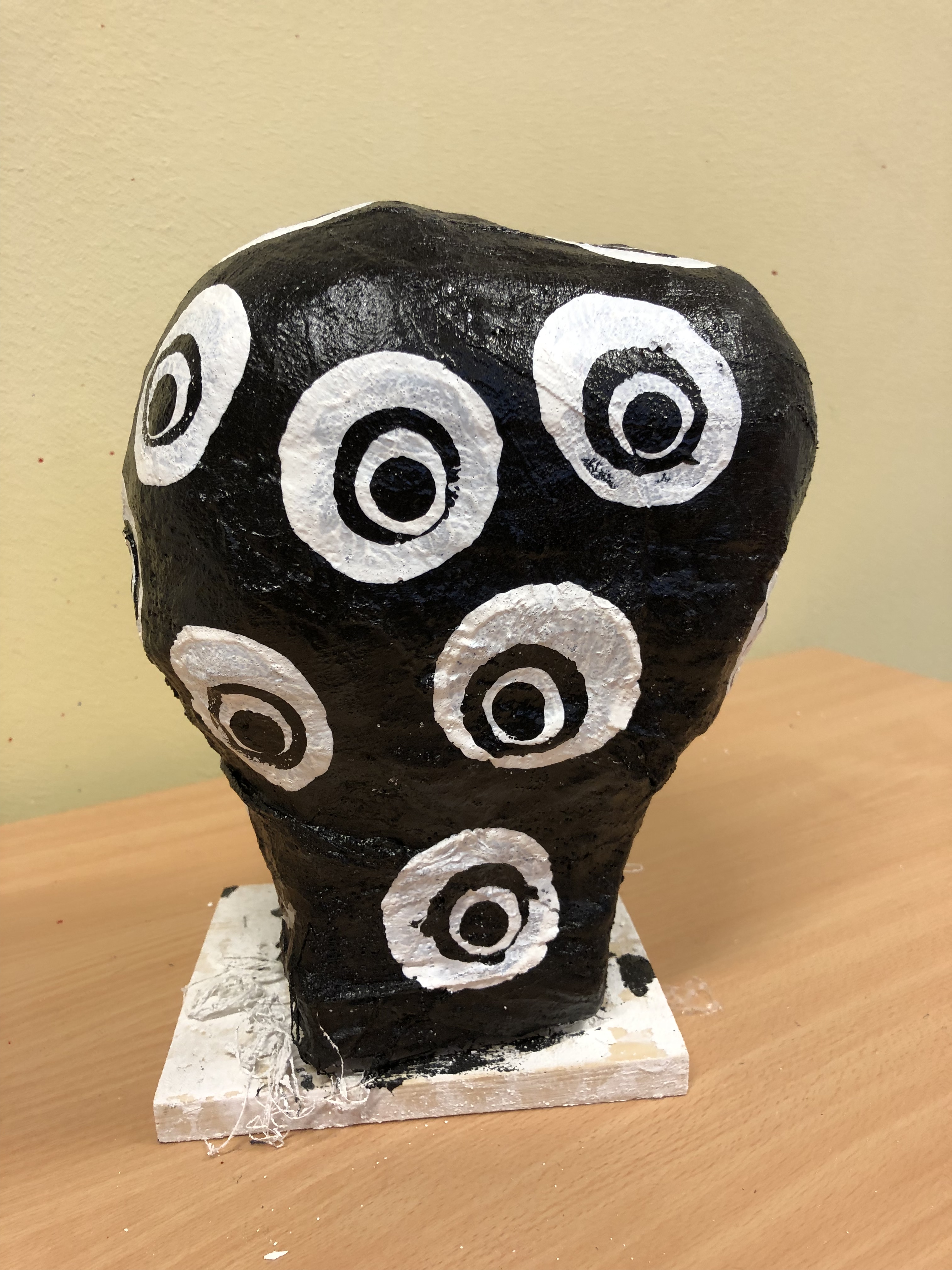 Nu är vi klara! Vi har återbruket kartong, ståltråd, tyg, silkespapper, fluffbollar och tejprullar. Genom att upprepa formen så skapar vi ett bruksföremål eller verk.