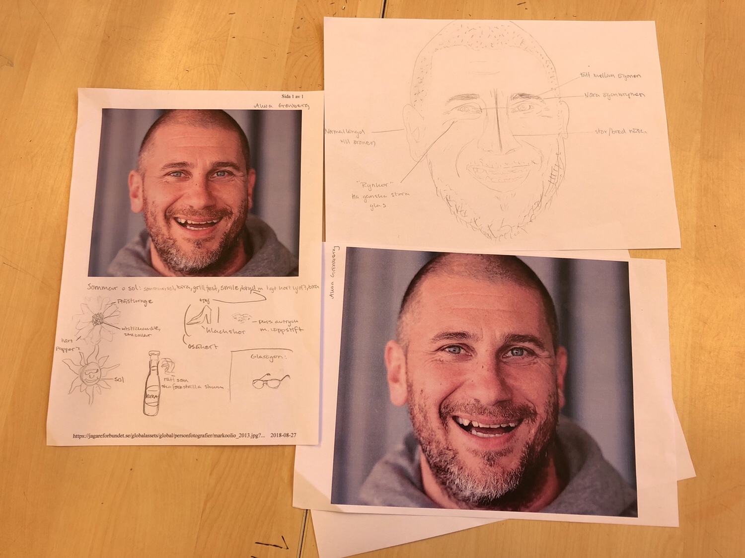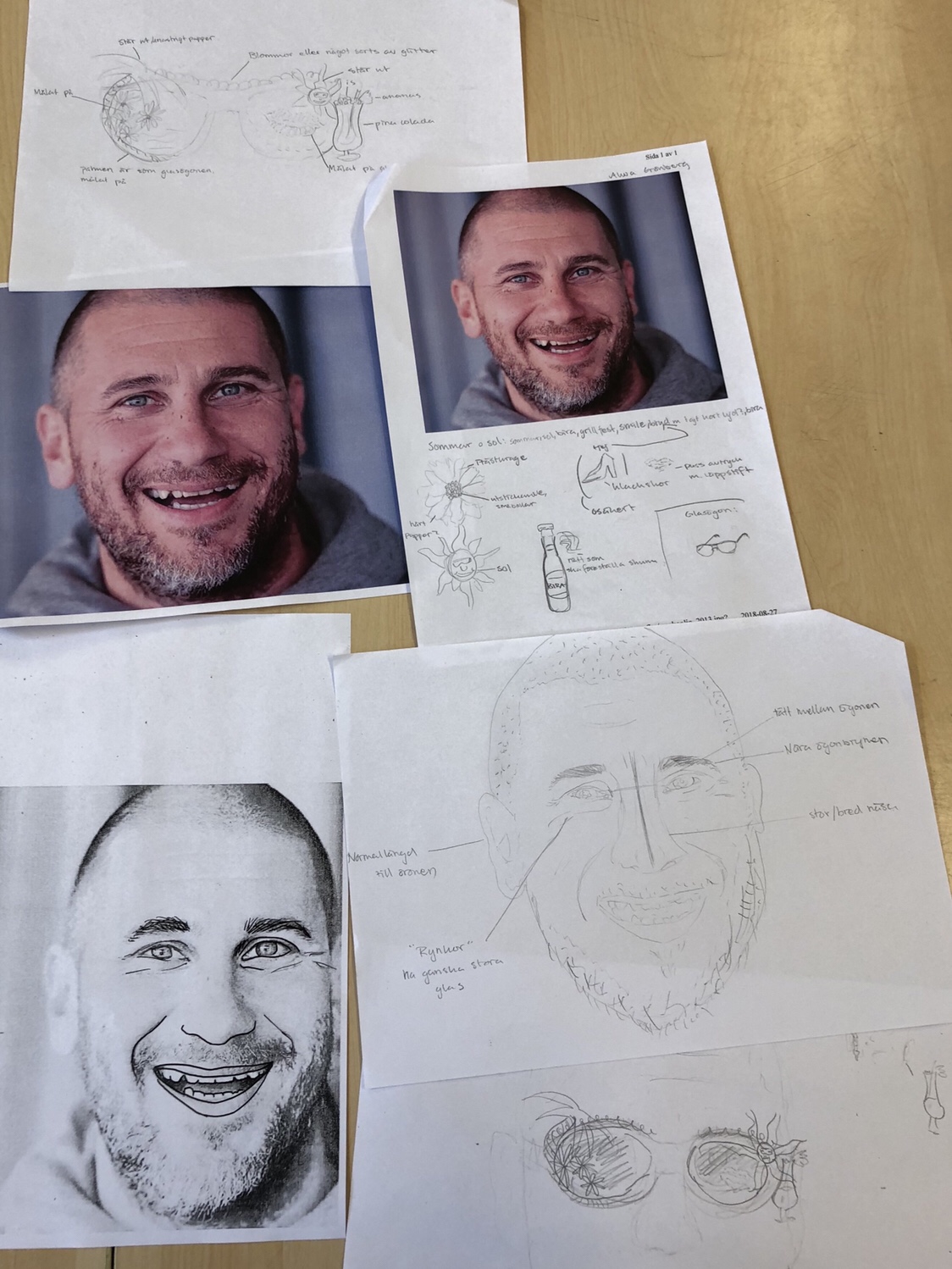 Här ser ni delar av skissfasen där tex Markoolio ska få ”sola och bada och pinacola”- glasögon!