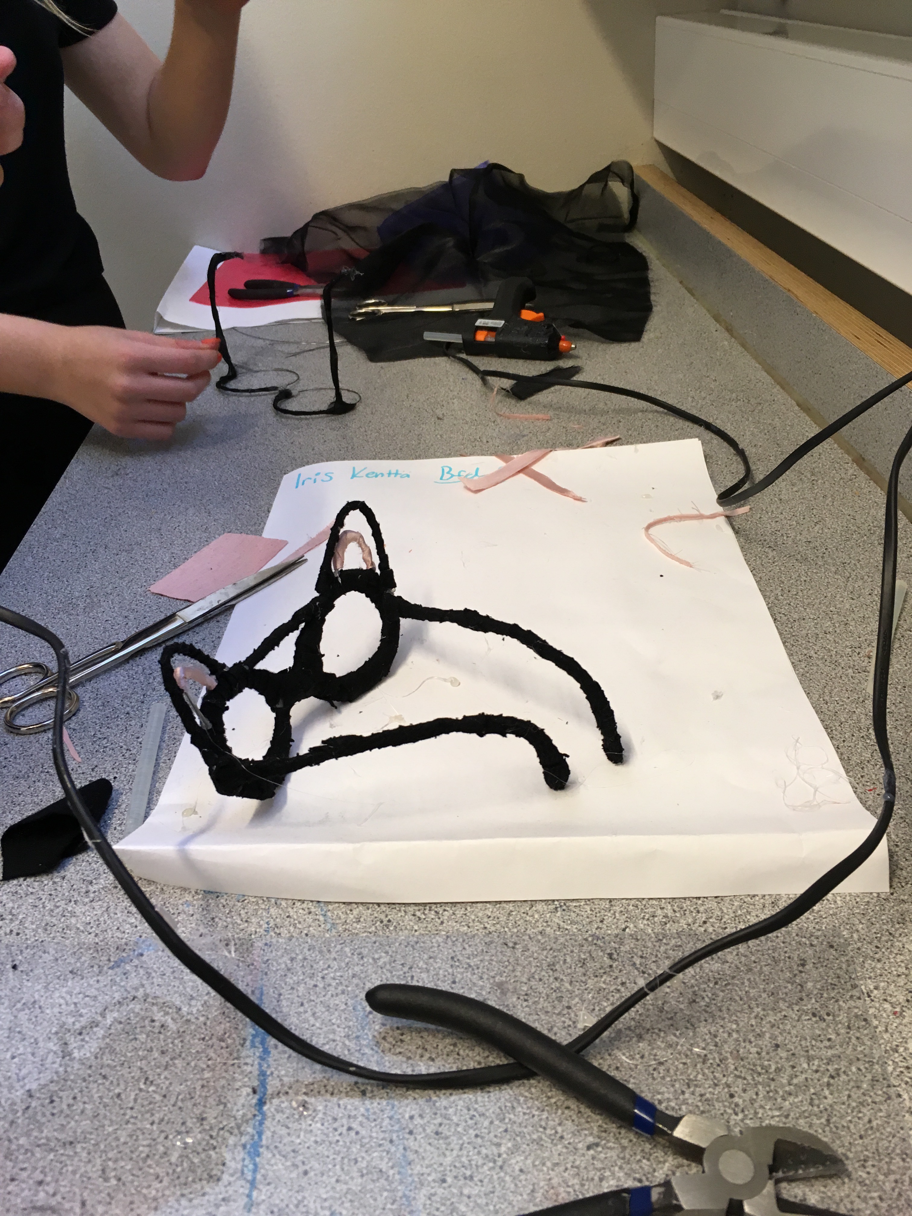 Nu är vi klara! Vi har återbruket kartong, ståltråd, tyg, silkespapper, fluffbollar och tejprullar. Genom att upprepa formen så skapar vi ett bruksföremål eller verk.