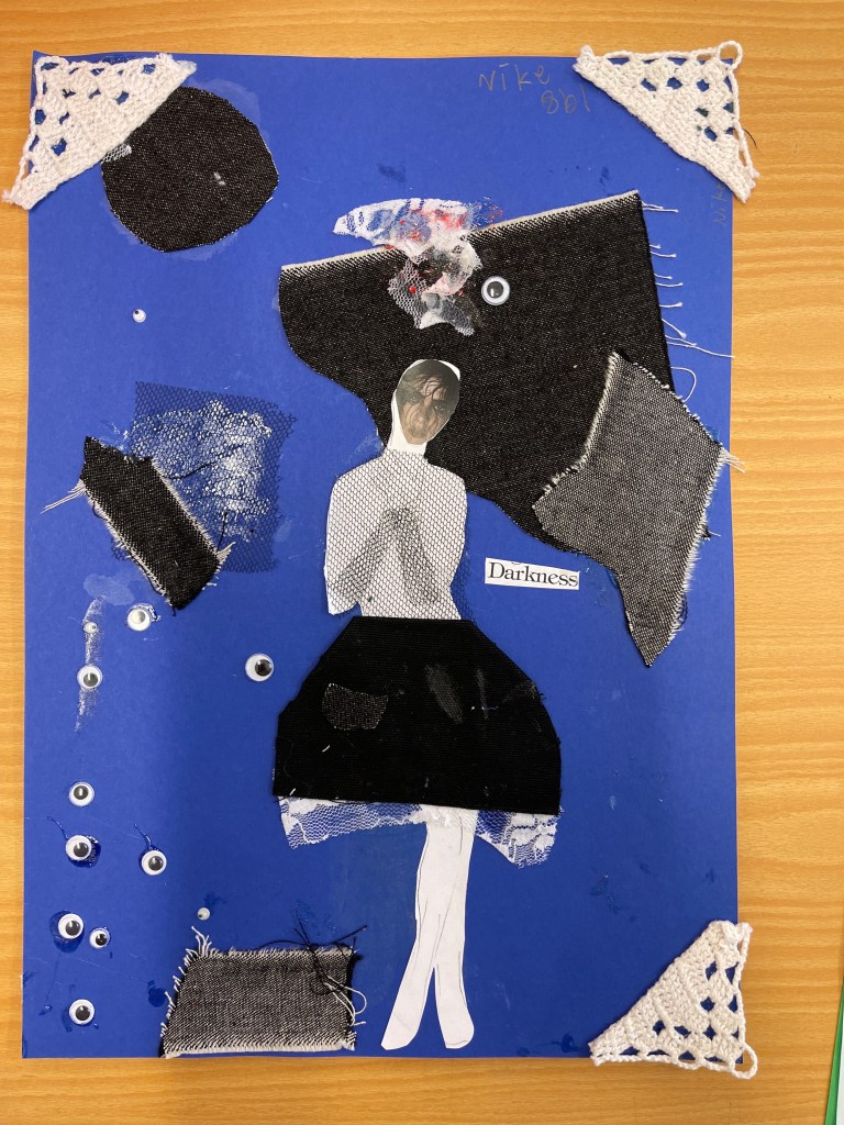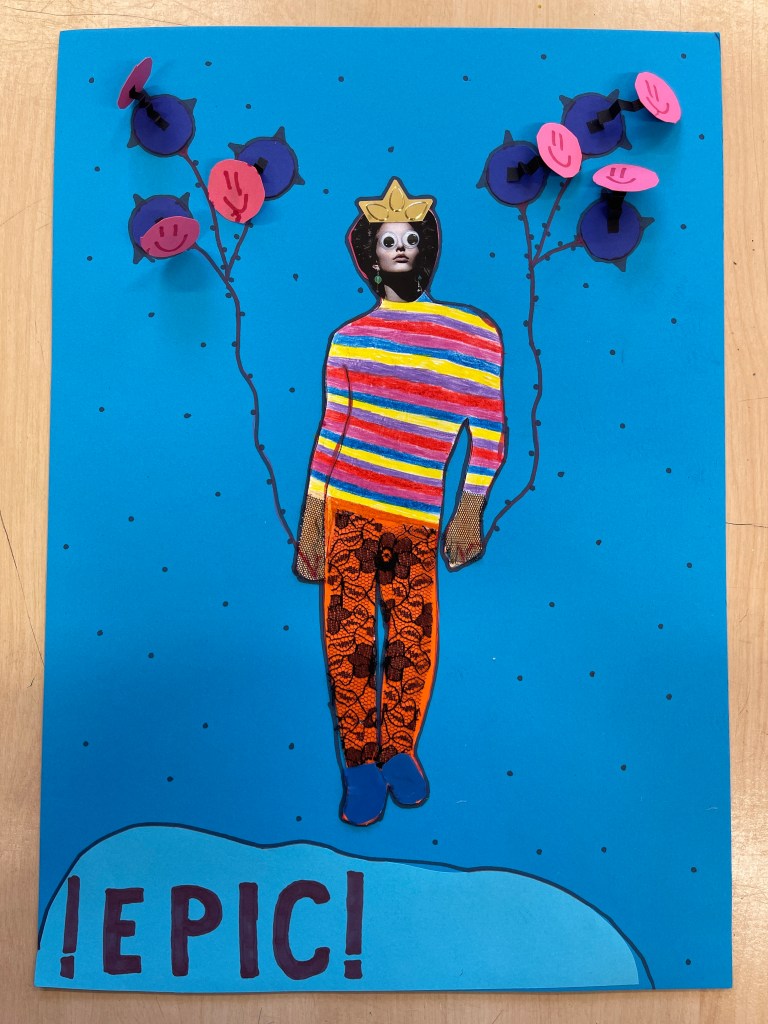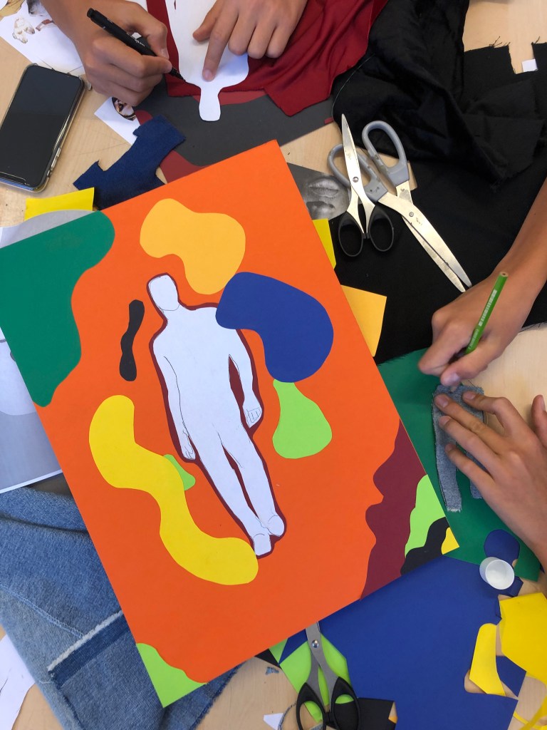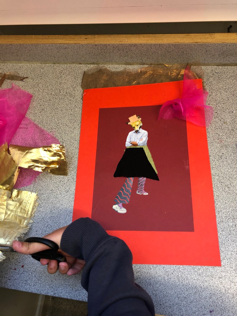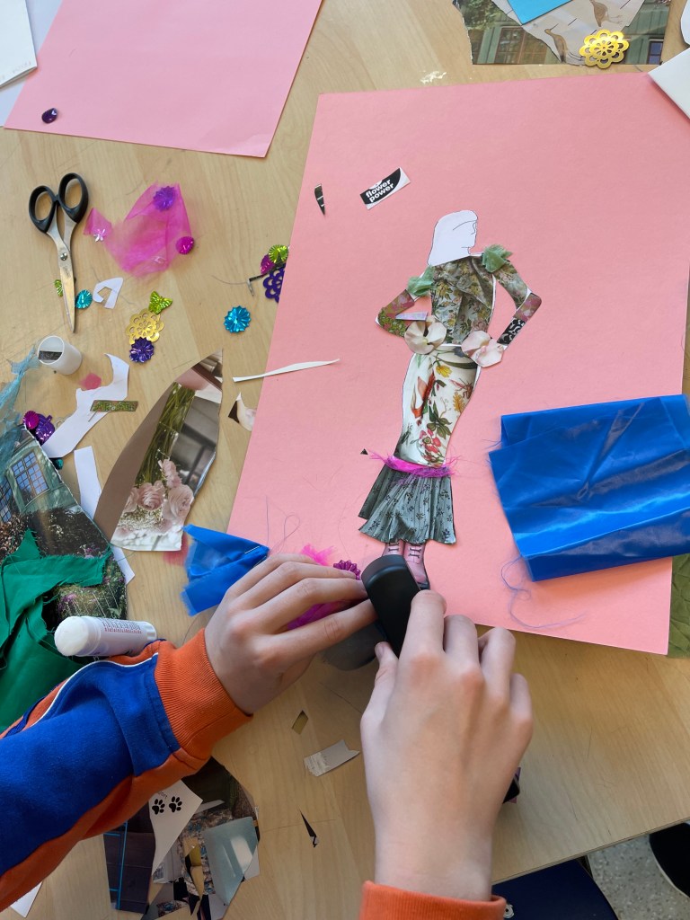 Vi håller på att avsluta siluette-uppgiften och övergår till collage. Vi har tittat på elevexempel där olika former, färger och storlekar på små pappersbitar kan skapa en rörelse (även fast allt är fastlimmat =) )