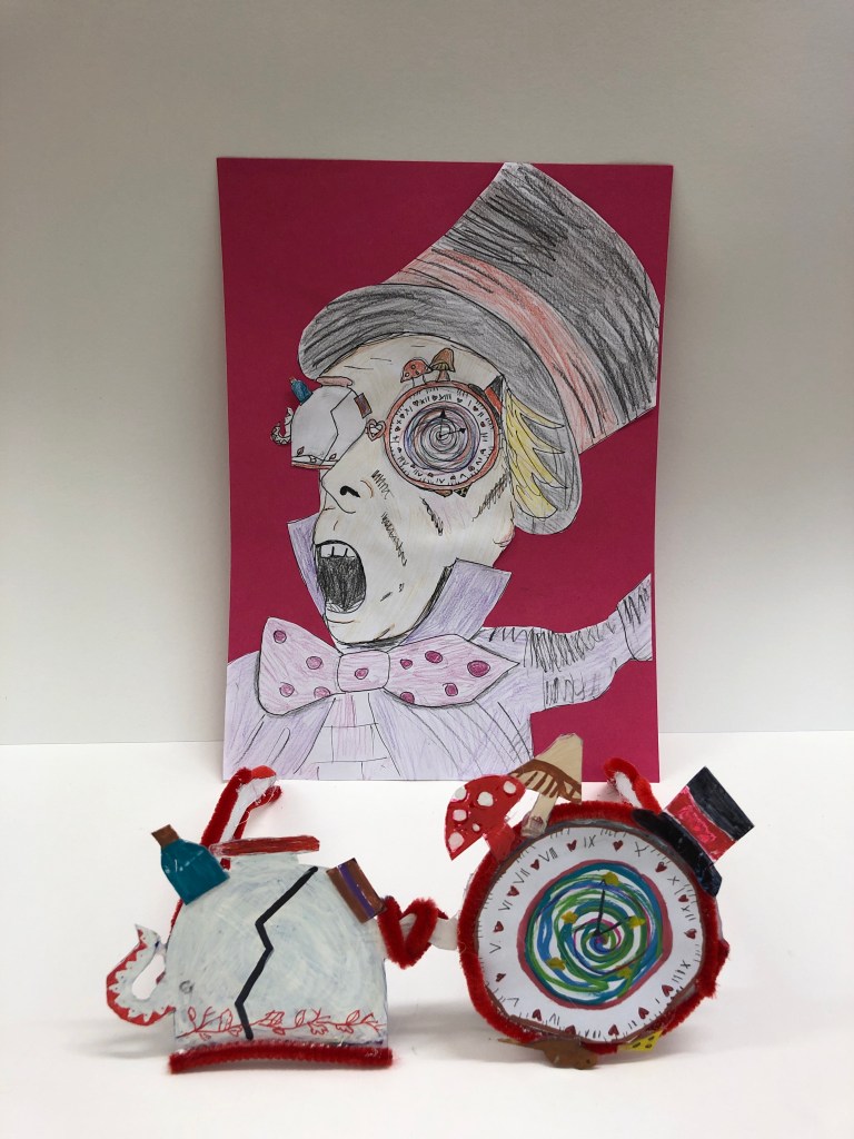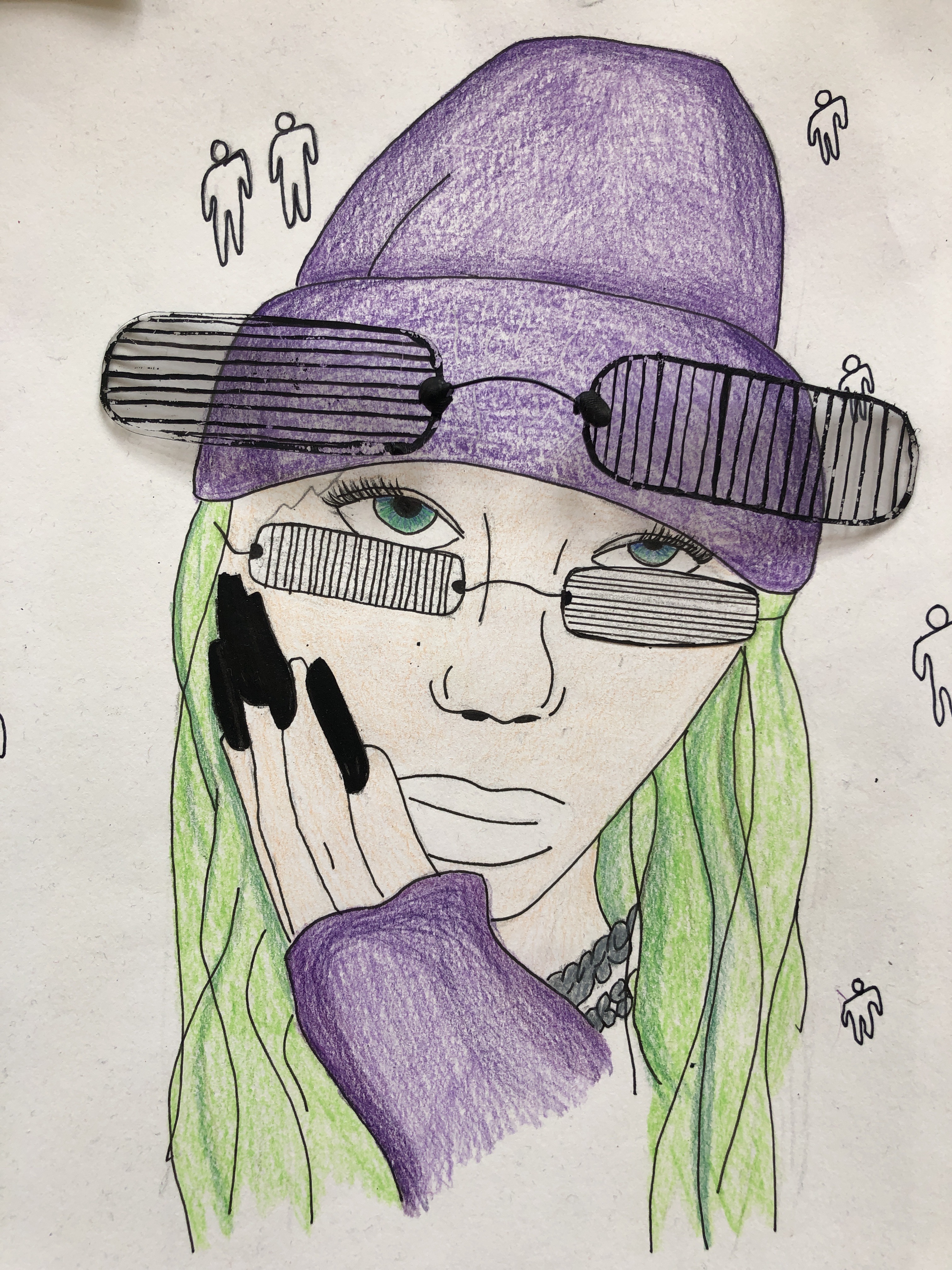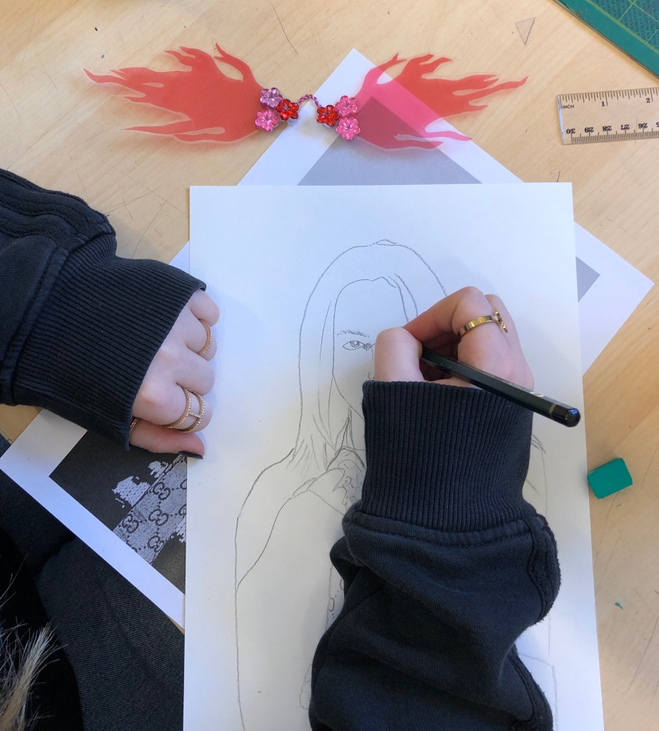 En uppgift i ”Boken om mig” går ut på att först teckna ut ditt ansiktes profillinje och sen fylla ”huvudet” men saker man gillar, gör, tänker på. Vi har jobbat med komposition och att försöka placera föremålen framför eller bakom så vi kan skapa ett djup.