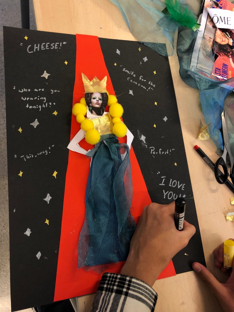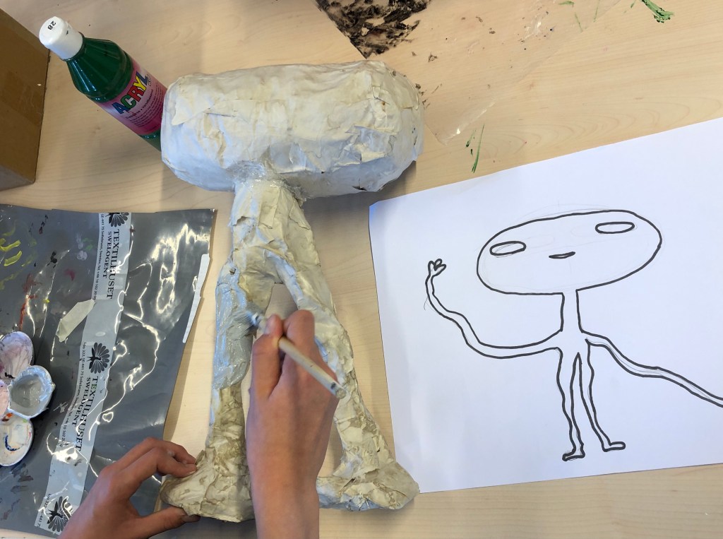 Vi har designat skor av kartong/hönsnät/papiermache/kapaskiva/tyg och väldigt mycket lim!
