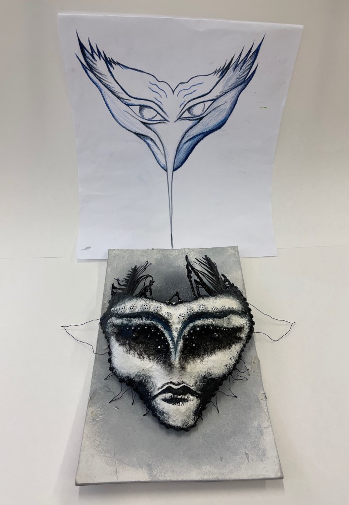 Nästa steg är att titta på sin skiss, försöka rita upp det igen på bakgrunden när den har torkat. Tryck inte hårt med blyertspennan och se till att snurra runt penseln ordentligt i den svarta färgen. Det ska bli kolsvarta sillutter!