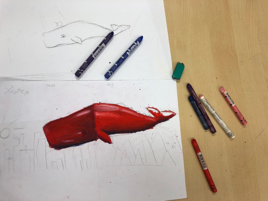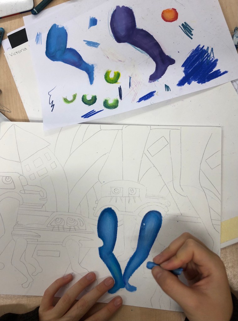 Nu är sjuorna igång med pokemons och oljepastell. Att jobba med oljepastell är inte lätt så det krävs övning vid sidan om originalet.
