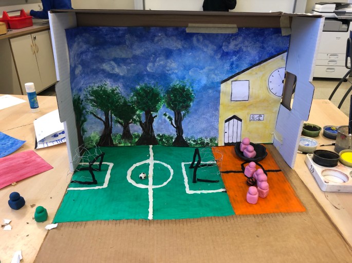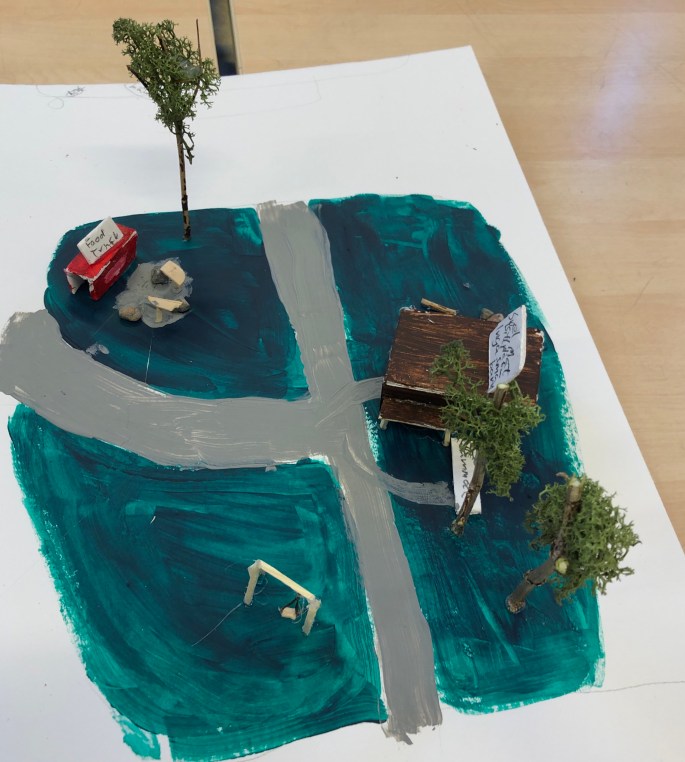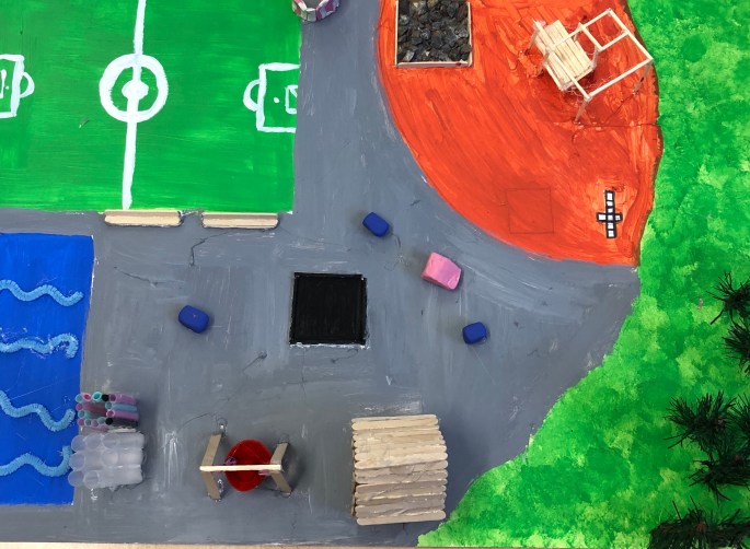 Ett team från bla KTH, som forskar om utomhuslekplatser för barn gjorde fältstudier samt workshop med våra design-grupper. Eleverna fick dels bli intervjuade ute på skolgården där de fick berätta om vad som gör en plats bra/mindre bra samt delta i en workshop där de med ord, tanke och visuellt fick berätta/bygga en drömskolgård. Här ser ni förslag på foodtrucks, poolområden, flygrör mm!