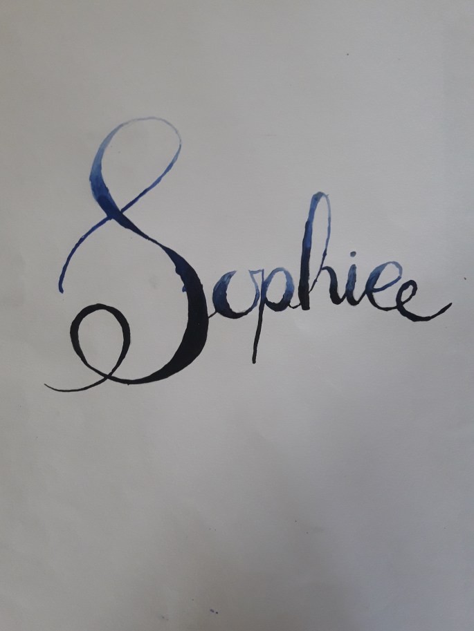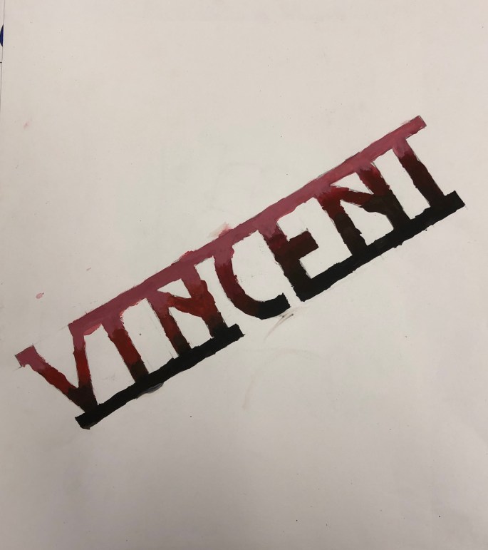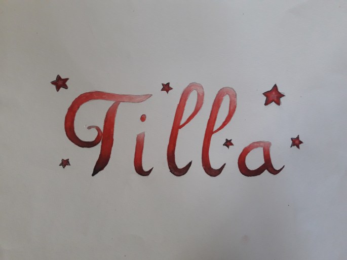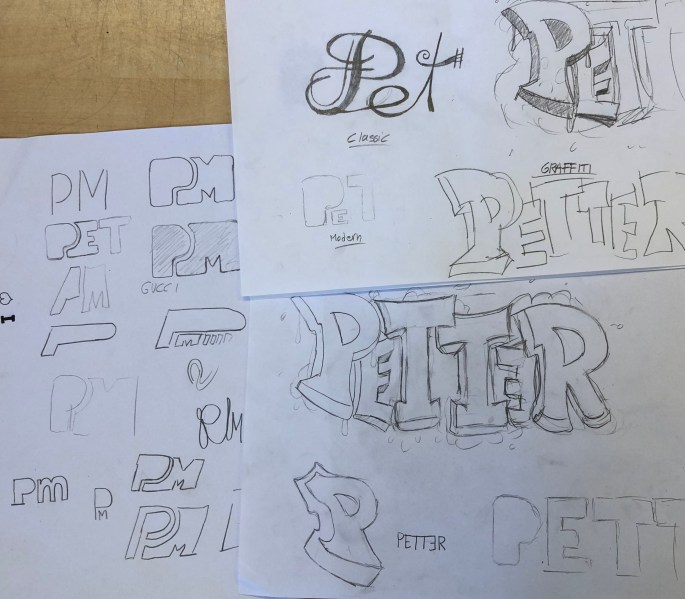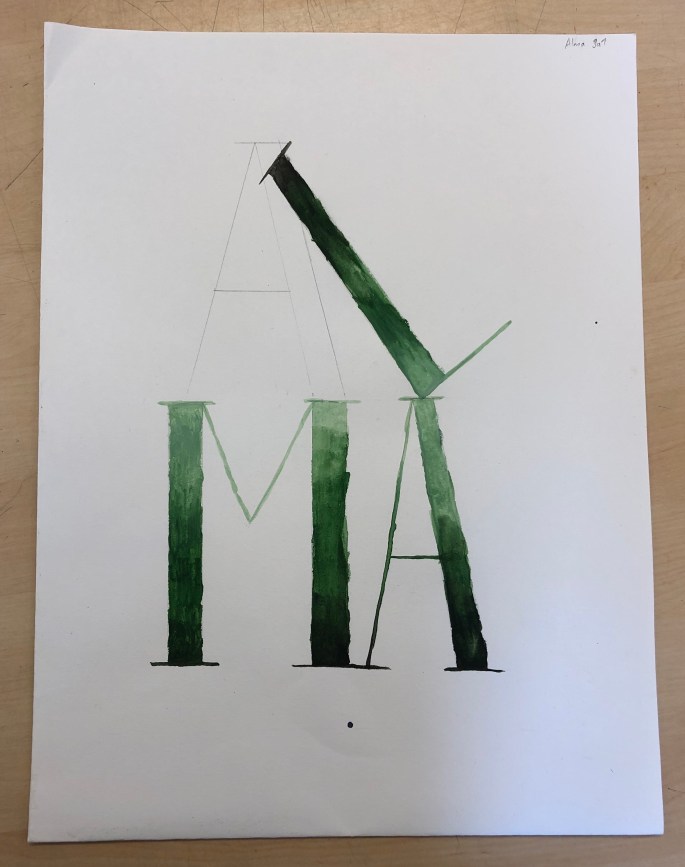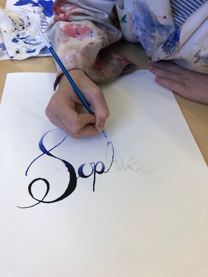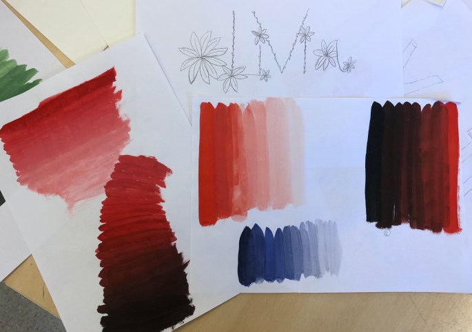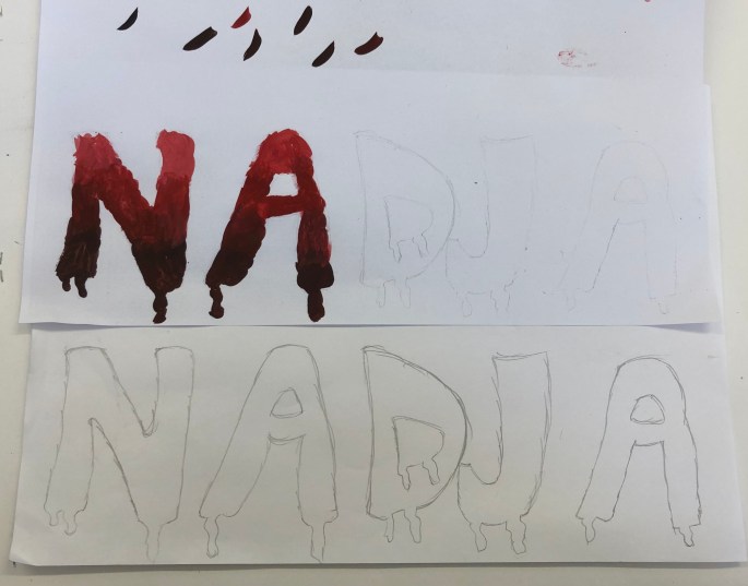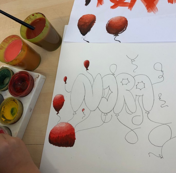 Mina nior designar sitt namns bokstäver och tecknar upp dem på mappen. De får testa färgblandning på papper bredvid först, en grundfärg + svart eller vit.