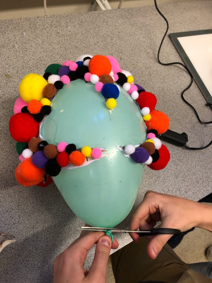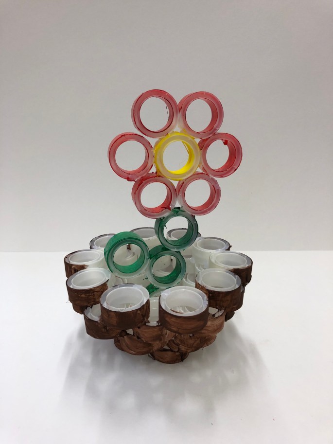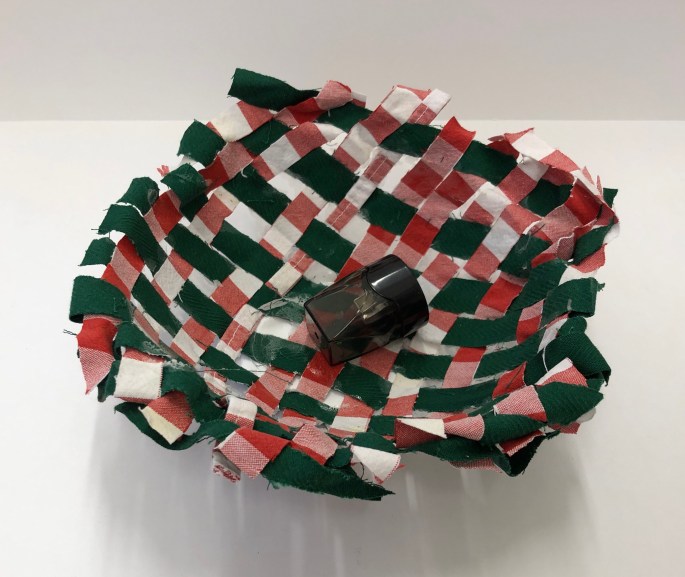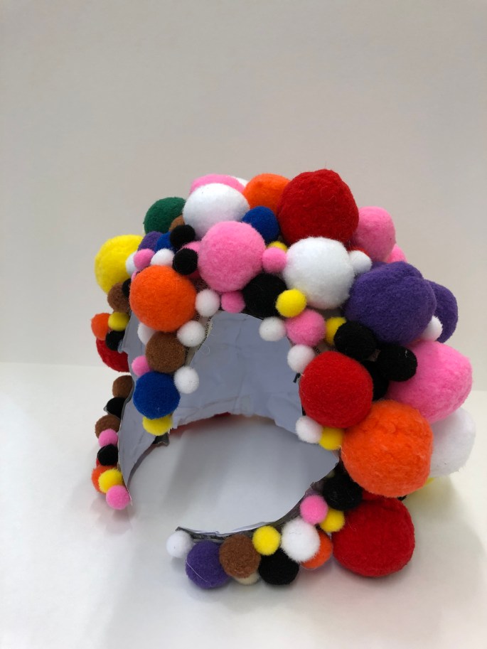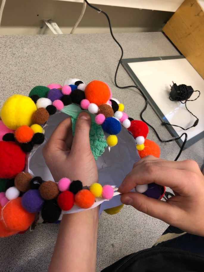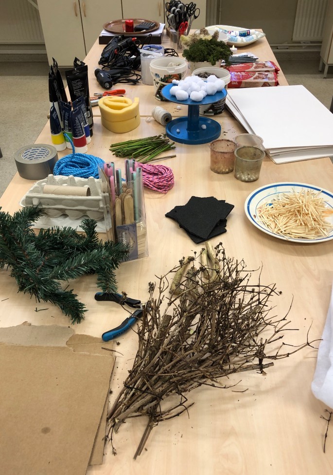 Nu är vi klara! Vi har återbruket kartong, ståltråd, tyg, silkespapper, fluffbollar och tejprullar. Genom att upprepa formen så skapar vi ett bruksföremål eller verk.