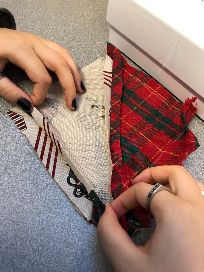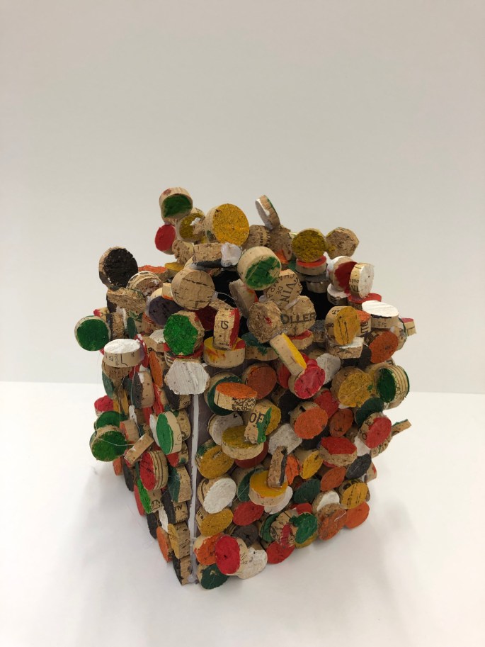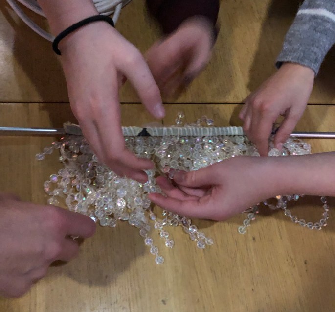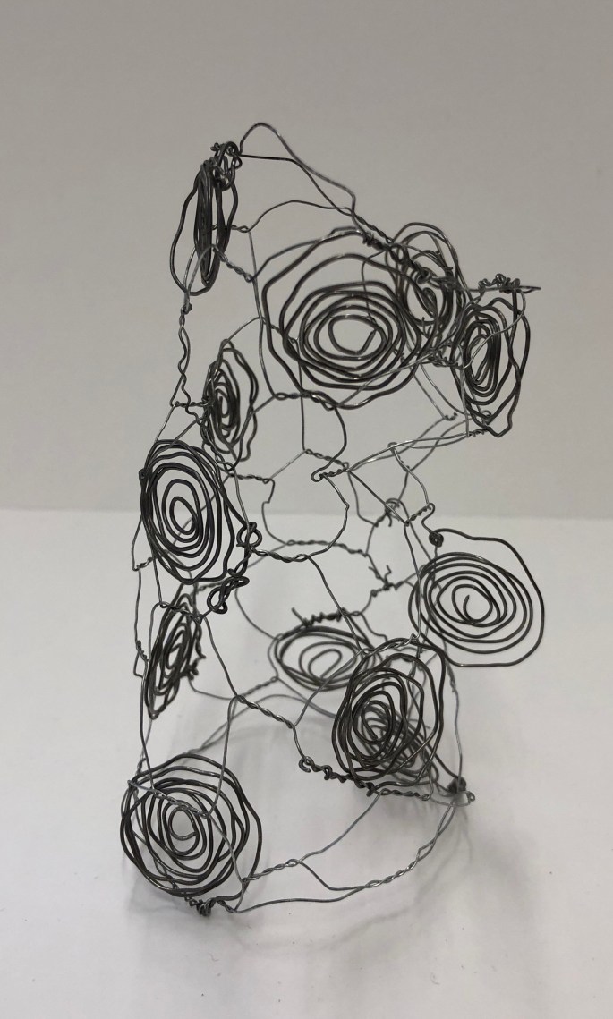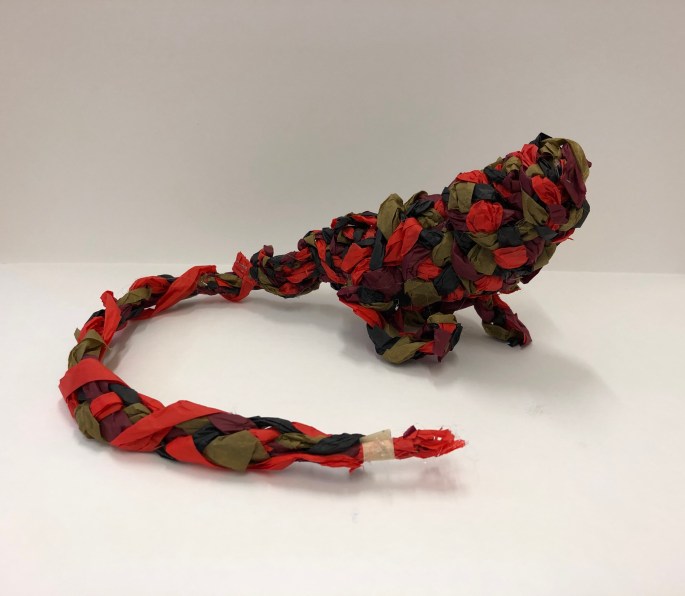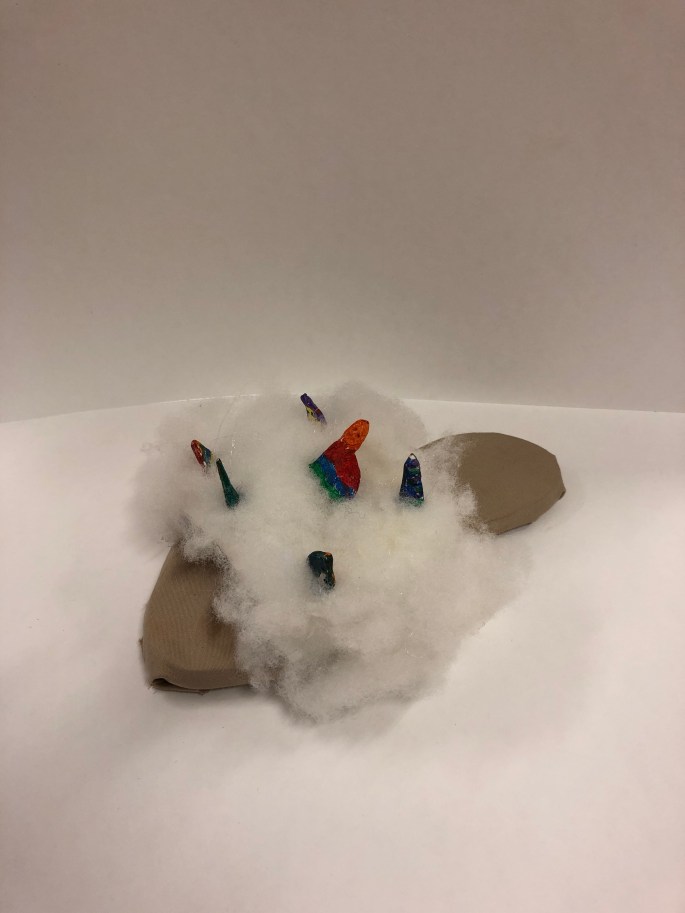 Nu är vi klara! Vi har återbruket kartong, ståltråd, tyg, silkespapper, fluffbollar och tejprullar. Genom att upprepa formen så skapar vi ett bruksföremål eller verk.