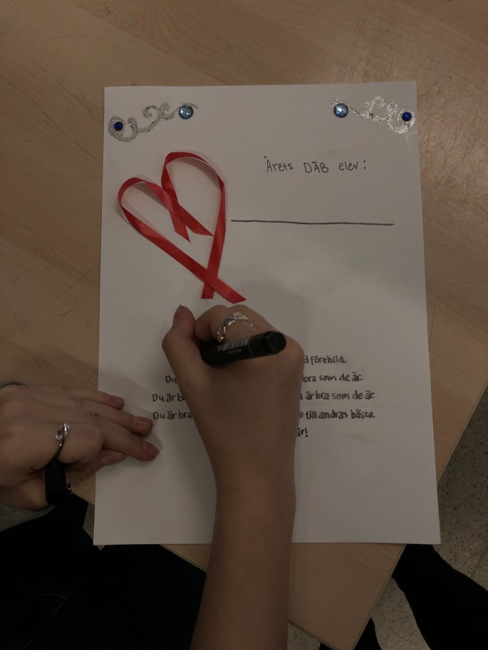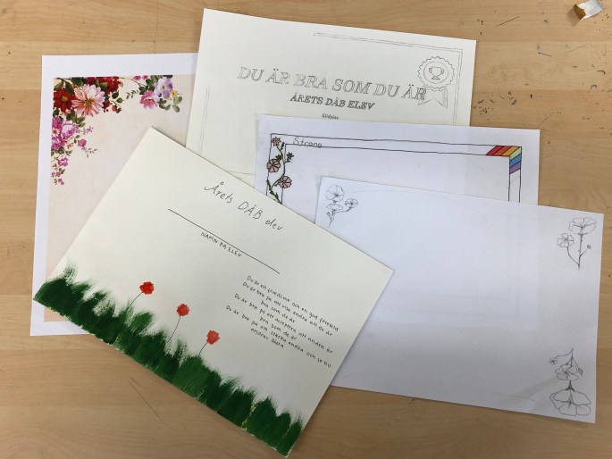 8BFD jobbar med diplomet som ska tilldelas årets DÄB-elev (åk 7-9) på skolavslutningen av rektor Tomas. Vi har tittat på det som utmärker ett diplom och vad som måste vara med samt färger och former som passar så att det blir rätt uttryck.