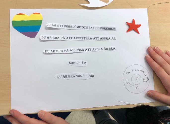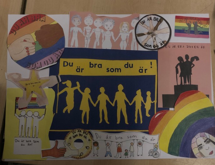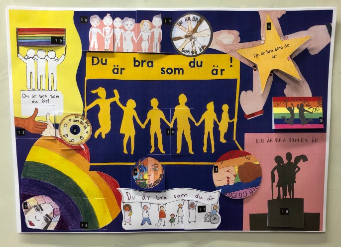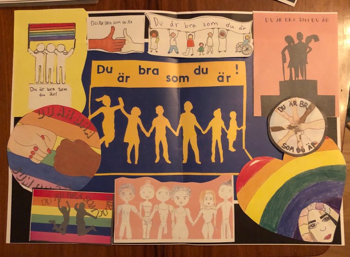 Årets 8Bildfilmdesign-elever gjorde Du är bra som du är !-loggor förra året. Jag satte ihop dem till collage och limmade på en baksida med text. För varje skoldag i december öppnar varje klass på skolan dagens lucka. Luckan innehåller någon uppmaning eller något tänkvärt som ska bidra till ökad självkänsla och gemenskap på skolan. Tex High-fiva och säg hej till någon du inte känner idag.